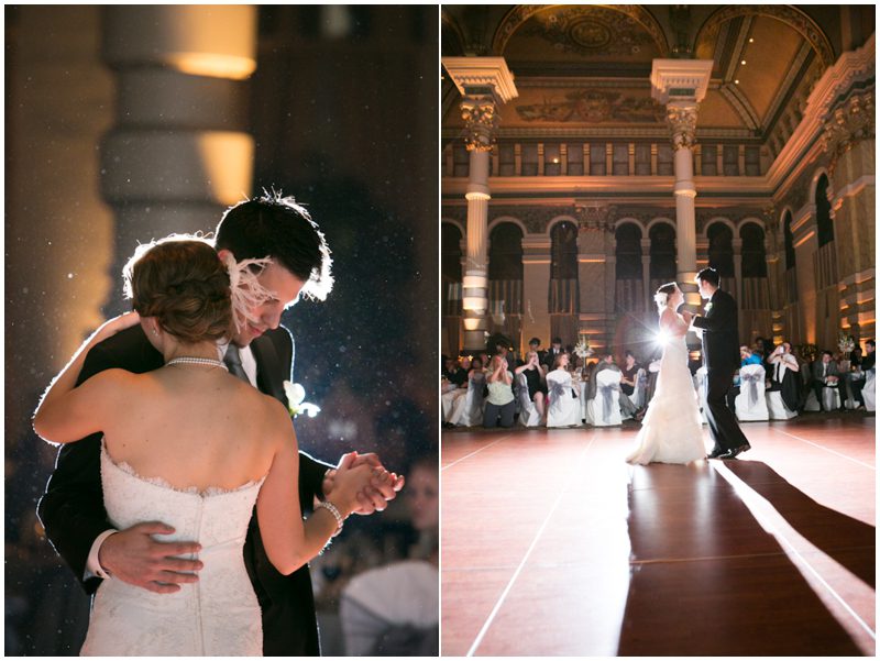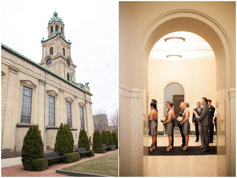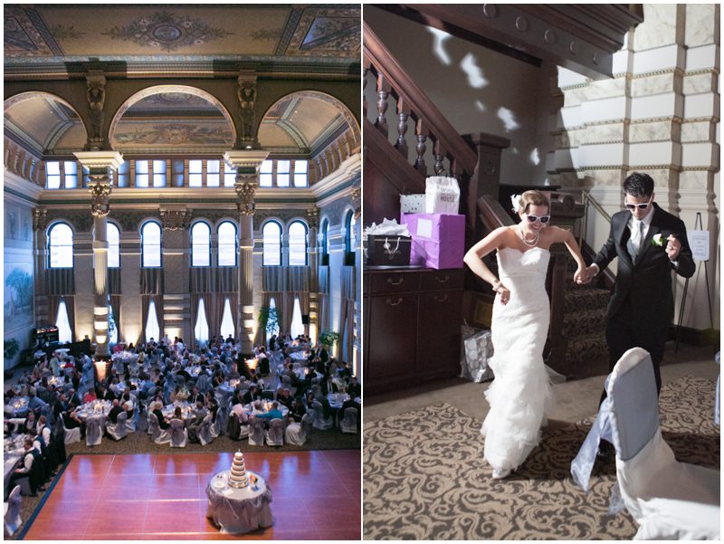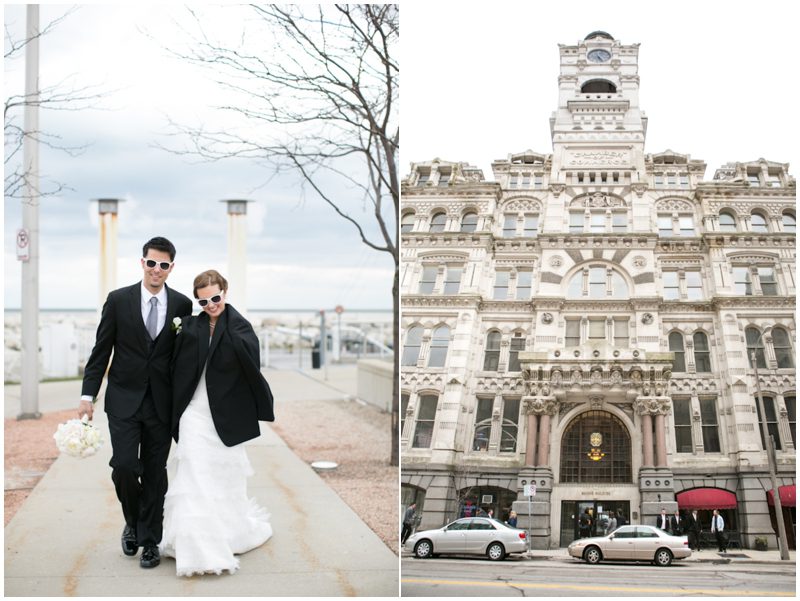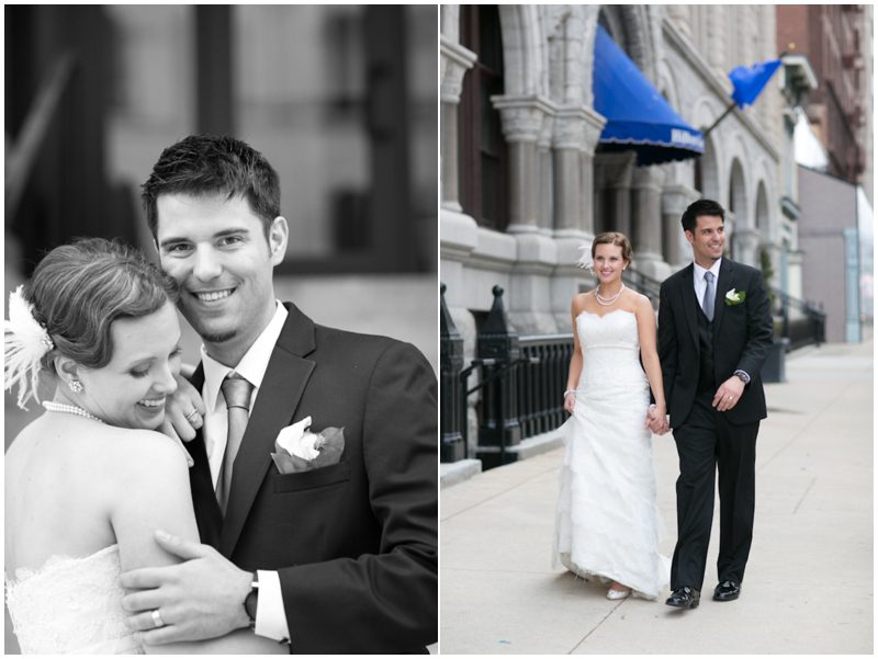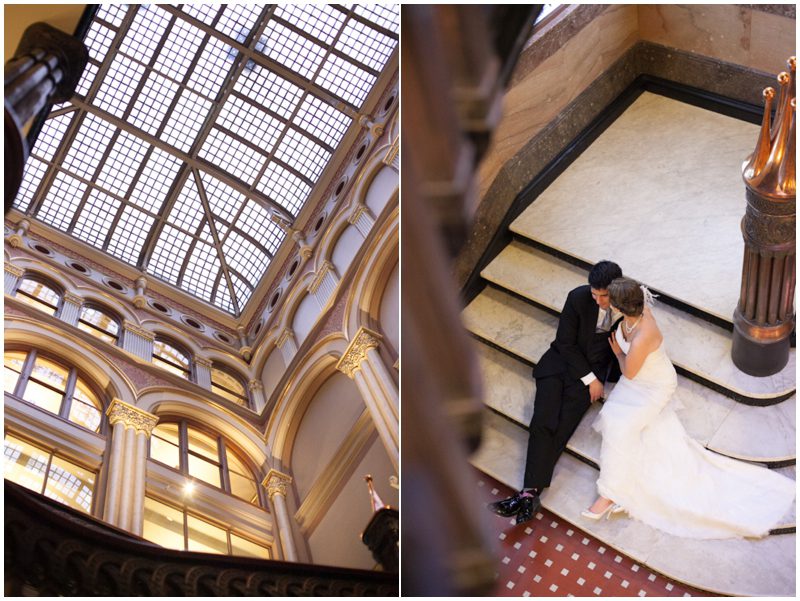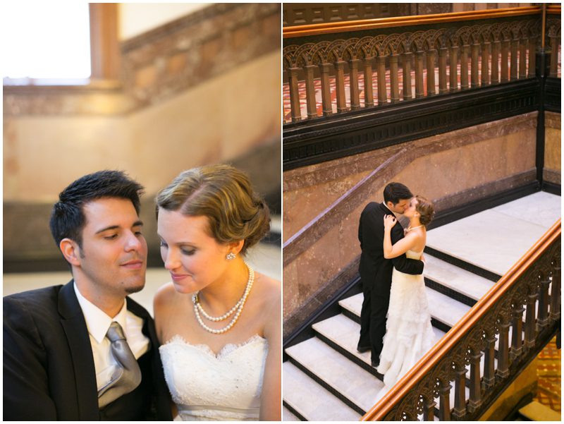 Jennifer & Derek hosted their wedding at some of my favorite venues in the city, ending the night at The Grain Exchange, a gorgeous ballroom capped by a soaring bell tower and gilded in murals and gold leaf. Jennifer’s vintage-inspired dress and hairpiece set her perfectly in the era of the Grain Exchange and Derek handsomely escorted her throughout the day – from the magnificently restored Cathedral of St John to the lakefront and back again downtown. Sunset happened behind a cloud but we made our own magic in the soaring atrium of the newly restored Hilton Garden Inn across the street from the reception. There a huge cast iron staircase capped with marble spirals up through the center of the hotel and allowed me to capture a few quiet, private moments between Jennifer & Derek. And then back again they went to the glitz and glamour of their beautiful reception where their guests munched on Garrett’s popcorn and danced the night away.