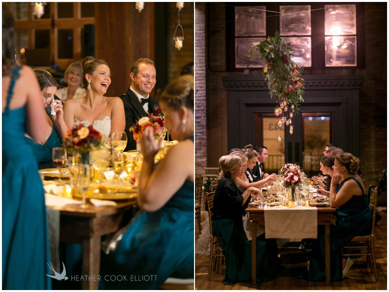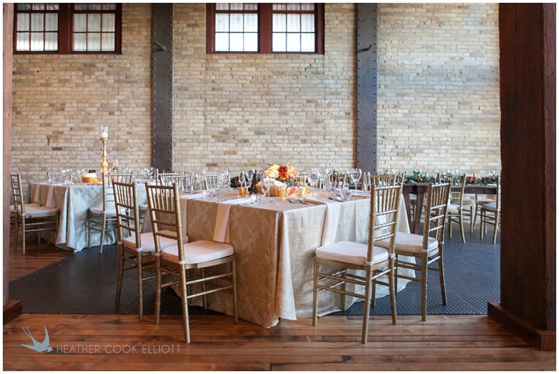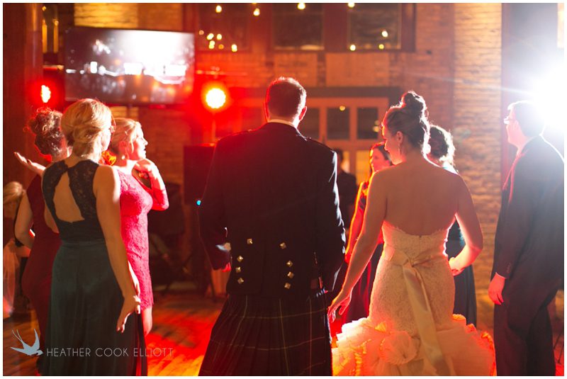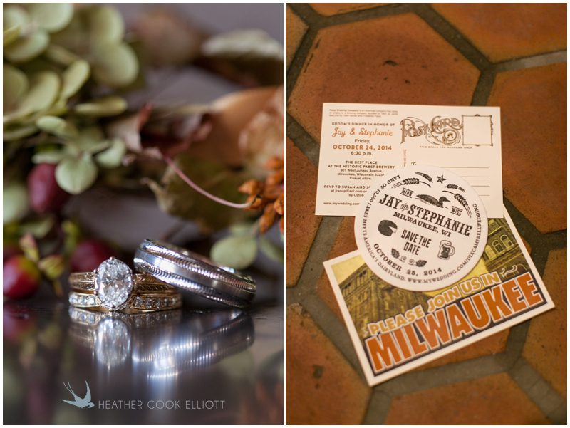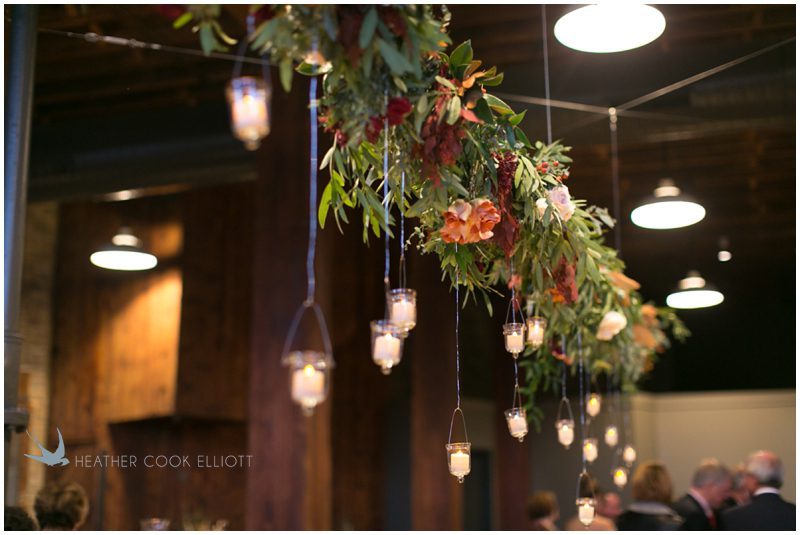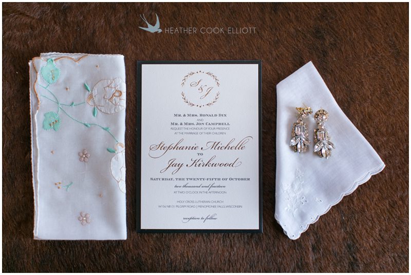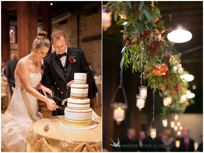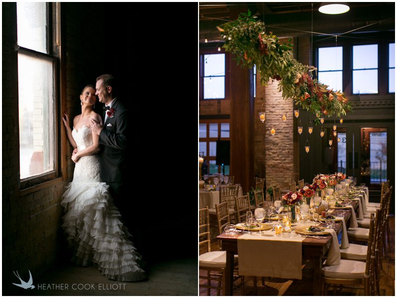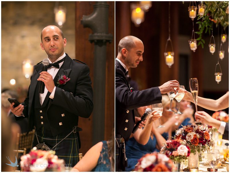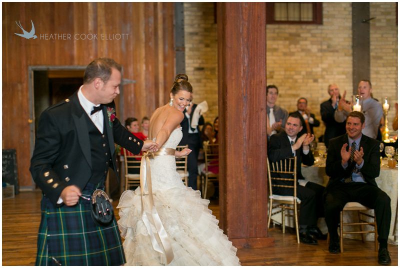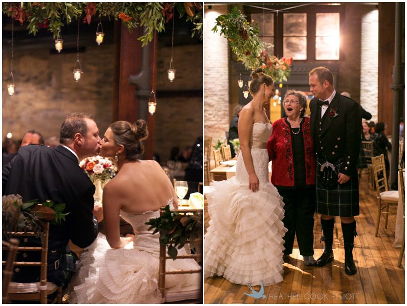 Stephanie & Jay are my kindof people. They love coffee dates and lakeside walks, European beer gardens and travel, family traditions and did I mention beer? They live in Minnesota but traveled to her home state of Wisconsin for an October wedding that reflected a fair amount of those loves and its an understatement to write that Carolina was thrilled to get to photograph it. People in the midwest take their heritage seriously and this wedding proves it – both were born and raised in the midwest, but Stephanie ‘s family is solidly German while Jay’s is all Scottish and they designed a wedding to celebrate both sides – blending cultural traditions with midwestern classics to create a wedding weekend that managed to be both glamorous and cozy, upscale and down-home, all about the drinks, the flowers and the love. The original inspiration for most of their design ideas was to host the weekend in a beer garden – think floating lights and florals dripping from the ceiling and you have the right idea. To that end, the weekend started with a groom’s dinner at Best Place, a rathskeller type space that used to be the boardroom for executives at the Pabst Brewery in Milwaukee. Stephanie wore a dried flower crown for the evening in keeping with an old German tradition and their beer was served in glass boots from Mader’s, a local 100+ year old German restaurant. The next day they revisited Pabst Brewery for stunning portraits on the campus before hosting guests at the Historic Pritzlaff where an area that used to be loading docks was transformed with dripping candles and florals to be their European style beer garden. On this day the flower girls wore the flower crowns and Stephanie a bold Lazaro dress with gorgeous ruffles and a glam topknot. At the reception they offered guests a Milwaukee favorite – brandy old fashioneds – and the Scottish side changed into kilts (and the mother of the groom donned a tartan sash!) Stephanie even changed out of her sparkly Jimmy Choos and slipped into a tartan clad pair of shoes that I adored. Overall, the color palette was a surprise – teal and rust colors with pops of purple and lots of green – but I love how those deep fall colors suggested the change to kilts that was to come. With gold details, lots of candle light and garlands galore on wooden tables the effect was perfect and beautiful and very Stephanie & Jay.
