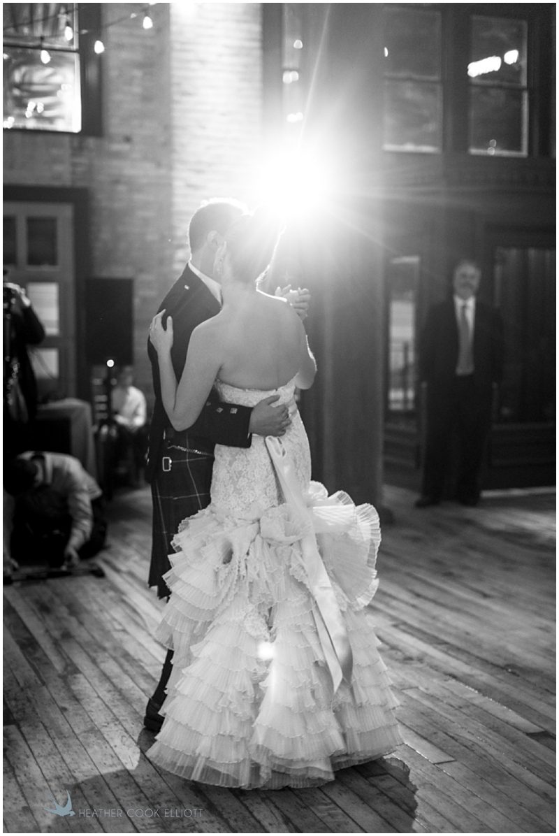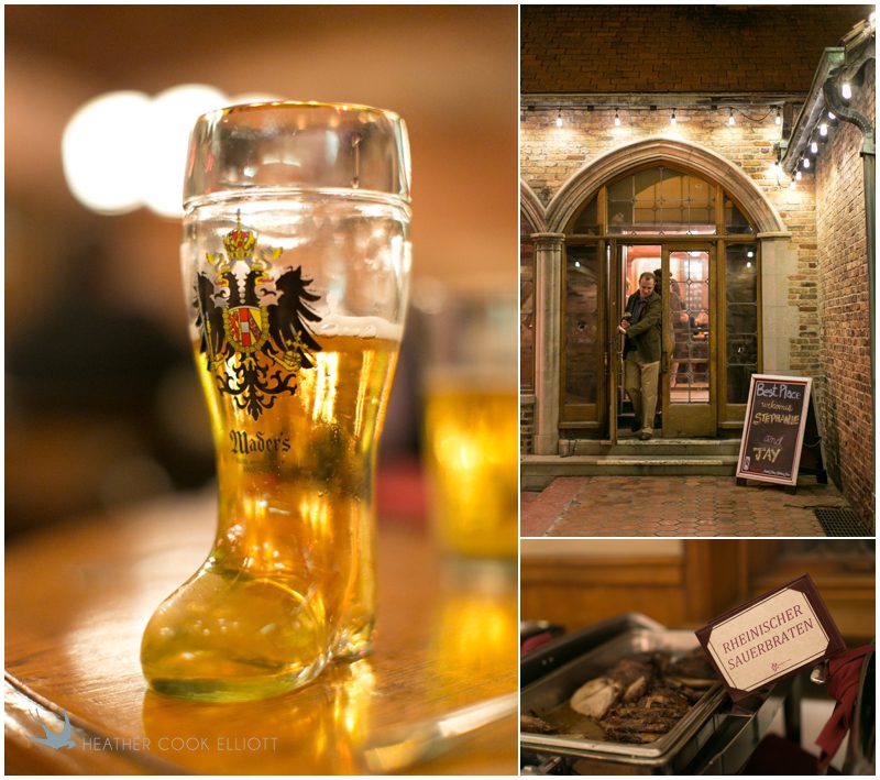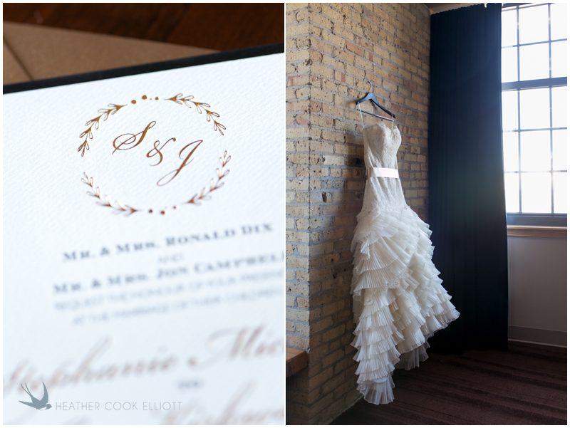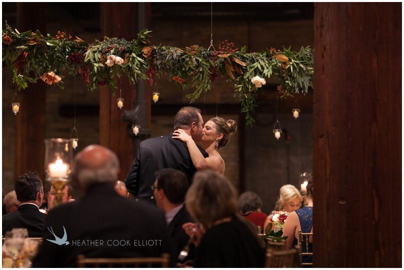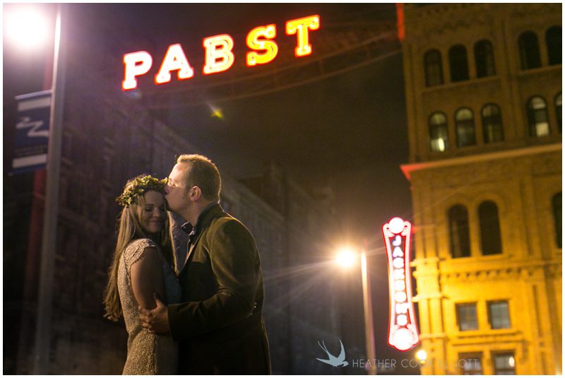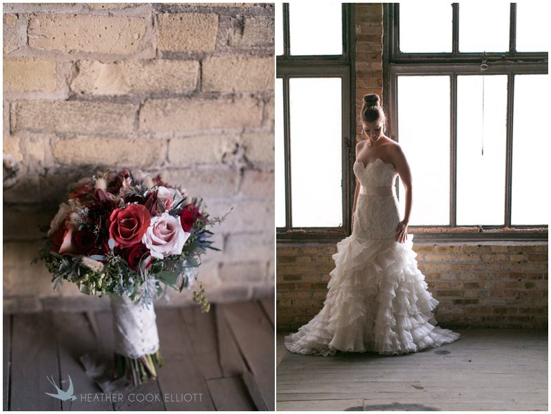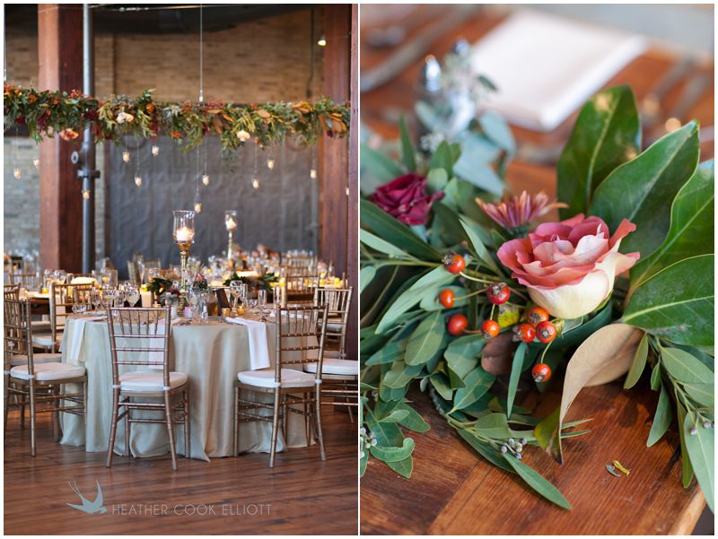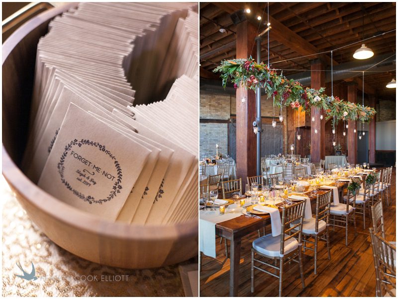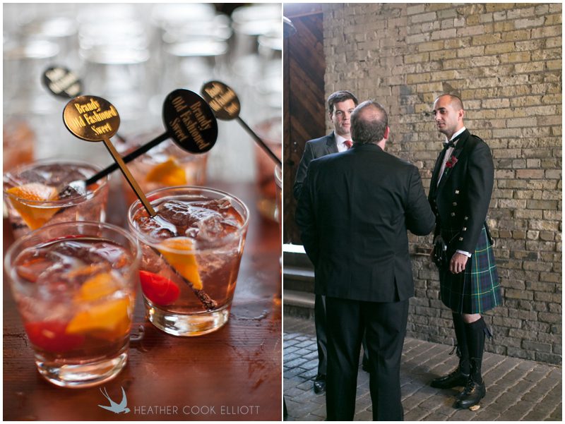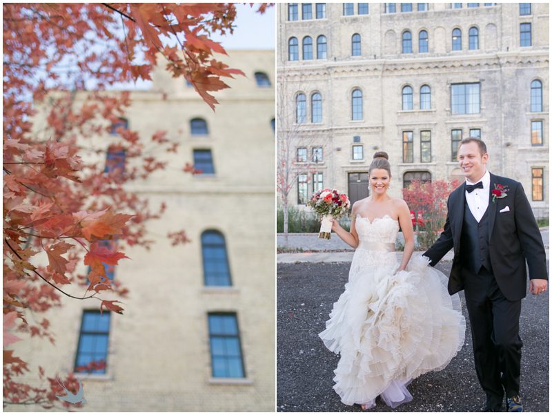 Stephanie & Jay are my kindof people. They love coffee dates and lakeside walks, European beer gardens and travel, family traditions and did I mention beer? They live in Minnesota but traveled to her home state of Wisconsin for an October wedding that reflected a fair amount of those loves and its an understatement to write that Carolina was thrilled to get to photograph it. People in the midwest take their heritage seriously and this wedding proves it – both were born and raised in the midwest, but Stephanie ‘s family is solidly German while Jay’s is all Scottish and they designed a wedding to celebrate both sides – blending cultural traditions with midwestern classics to create a wedding weekend that managed to be both glamorous and cozy, upscale and down-home, all about the drinks, the flowers and the love. The original inspiration for most of their design ideas was to host the weekend in a beer garden – think floating lights and florals dripping from the ceiling and you have the right idea. To that end, the weekend started with a groom’s dinner at Best Place, a rathskeller type space that used to be the boardroom for executives at the Pabst Brewery in Milwaukee. Stephanie wore a dried flower crown for the evening in keeping with an old German tradition and their beer was served in glass boots from Mader’s, a local 100+ year old German restaurant. The next day they revisited Pabst Brewery for stunning portraits on the campus before hosting guests at the Historic Pritzlaff where an area that used to be loading docks was transformed with dripping candles and florals to be their European style beer garden. On this day the flower girls wore the flower crowns and Stephanie a bold Lazaro dress with gorgeous ruffles and a glam topknot. At the reception they offered guests a Milwaukee favorite – brandy old fashioneds – and the Scottish side changed into kilts (and the mother of the groom donned a tartan sash!) Stephanie even changed out of her sparkly Jimmy Choos and slipped into a tartan clad pair of shoes that I adored. Overall, the color palette was a surprise – teal and rust colors with pops of purple and lots of green – but I love how those deep fall colors suggested the change to kilts that was to come. With gold details, lots of candle light and garlands galore on wooden tables the effect was perfect and beautiful and very Stephanie & Jay.