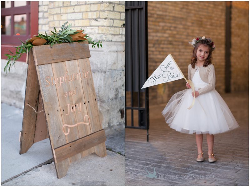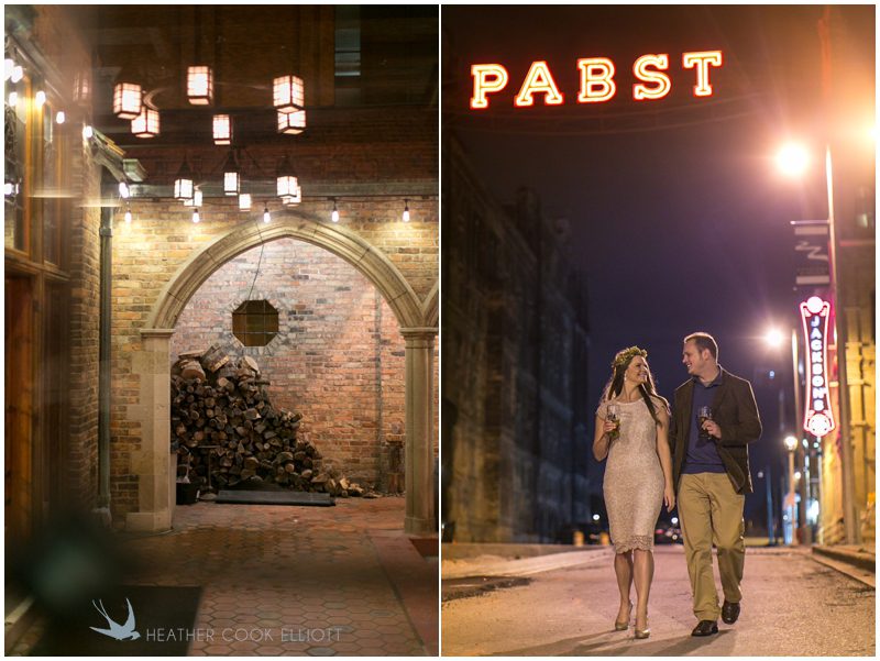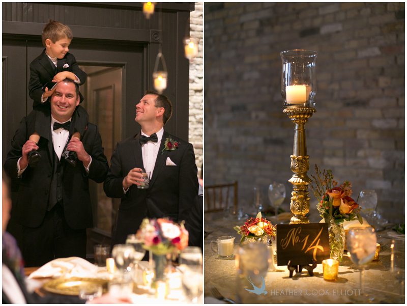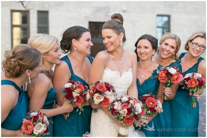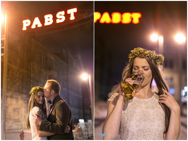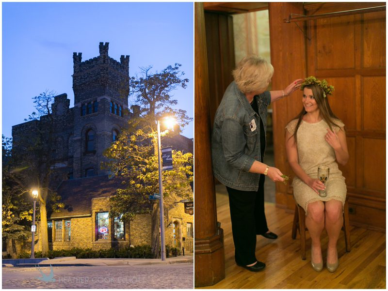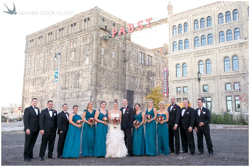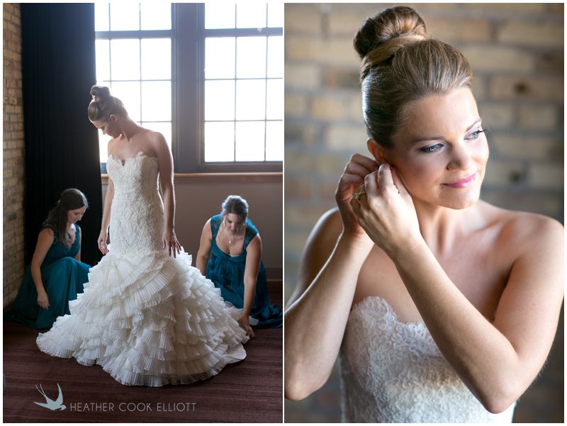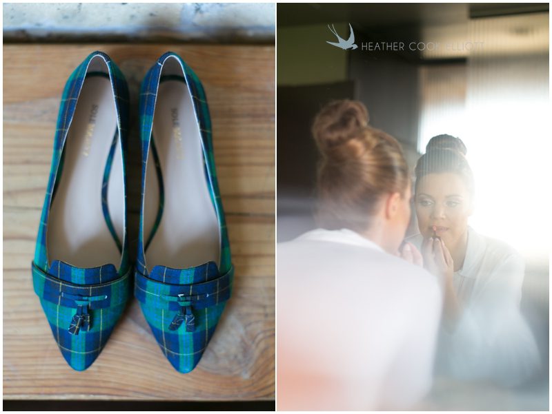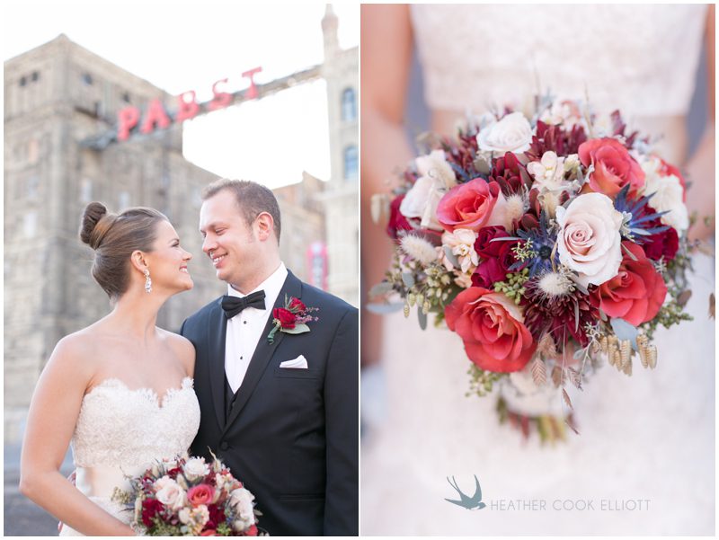 Stephanie & Jay are my kindof people. They love coffee dates and lakeside walks, European beer gardens and travel, family traditions and did I mention beer? They live in Minnesota but traveled to her home state of Wisconsin for an October wedding that reflected a fair amount of those loves and its an understatement to write that Carolina was thrilled to get to photograph it. People in the midwest take their heritage seriously and this wedding proves it – both were born and raised in the midwest, but Stephanie ‘s family is solidly German while Jay’s is all Scottish and they designed a wedding to celebrate both sides – blending cultural traditions with midwestern classics to create a wedding weekend that managed to be both glamorous and cozy, upscale and down-home, all about the drinks, the flowers and the love. The original inspiration for most of their design ideas was to host the weekend in a beer garden – think floating lights and florals dripping from the ceiling and you have the right idea. To that end, the weekend started with a groom’s dinner at Best Place, a rathskeller type space that used to be the boardroom for executives at the Pabst Brewery in Milwaukee. Stephanie wore a dried flower crown for the evening in keeping with an old German tradition and their beer was served in glass boots from Mader’s, a local 100+ year old German restaurant. The next day they revisited Pabst Brewery for stunning portraits on the campus before hosting guests at the Historic Pritzlaff where an area that used to be loading docks was transformed with dripping candles and florals to be their European style beer garden. On this day the flower girls wore the flower crowns and Stephanie a bold Lazaro dress with gorgeous ruffles and a glam topknot. At the reception they offered guests a Milwaukee favorite – brandy old fashioneds – and the Scottish side changed into kilts (and the mother of the groom donned a tartan sash!) Stephanie even changed out of her sparkly Jimmy Choos and slipped into a tartan clad pair of shoes that I adored. Overall, the color palette was a surprise – teal and rust colors with pops of purple and lots of green – but I love how those deep fall colors suggested the change to kilts that was to come. With gold details, lots of candle light and garlands galore on wooden tables the effect was perfect and beautiful and very Stephanie & Jay.