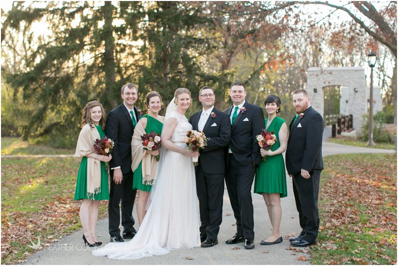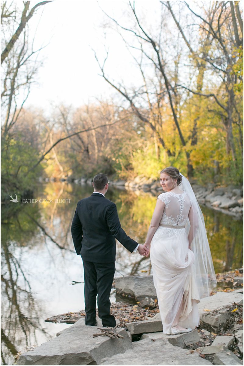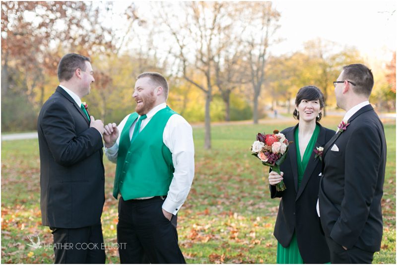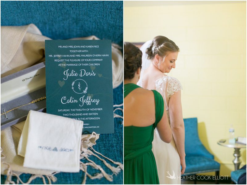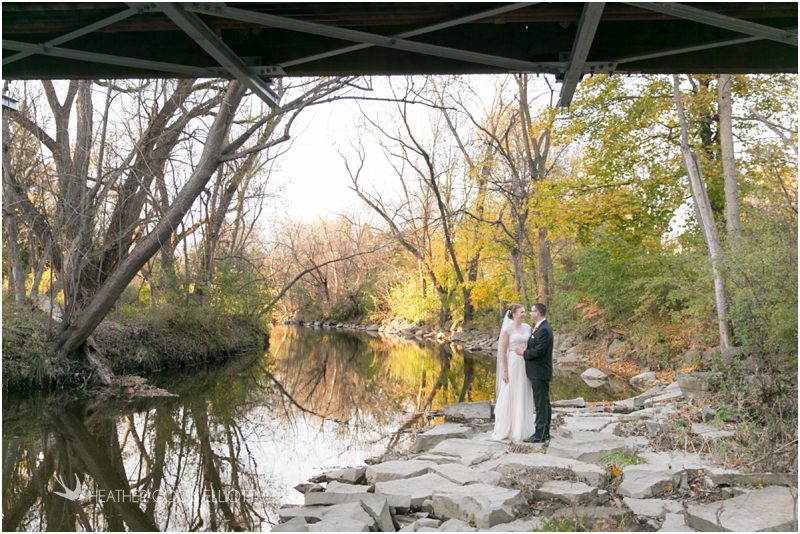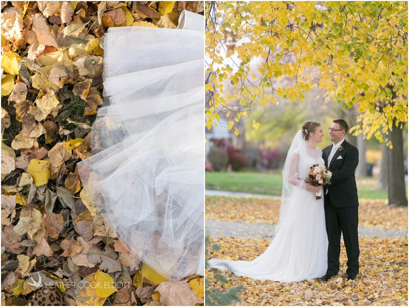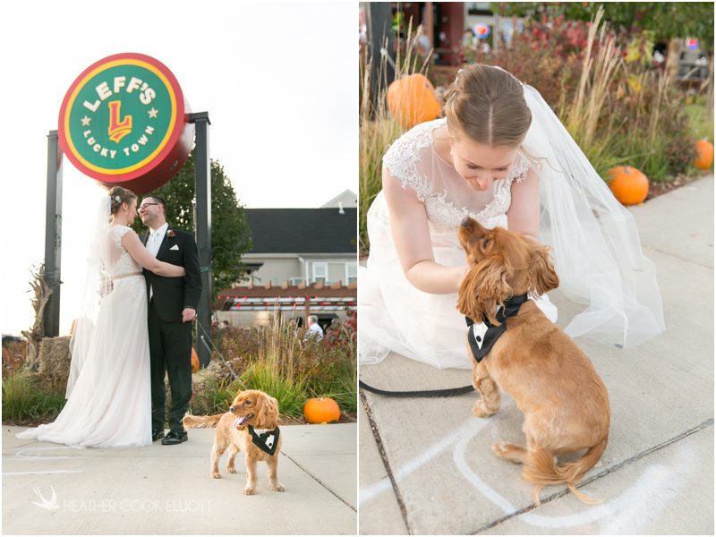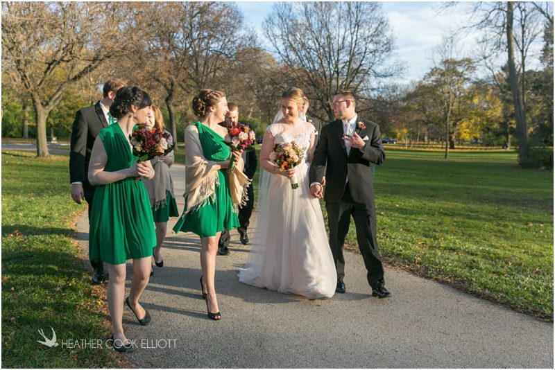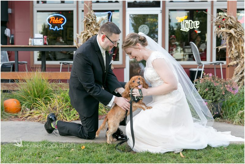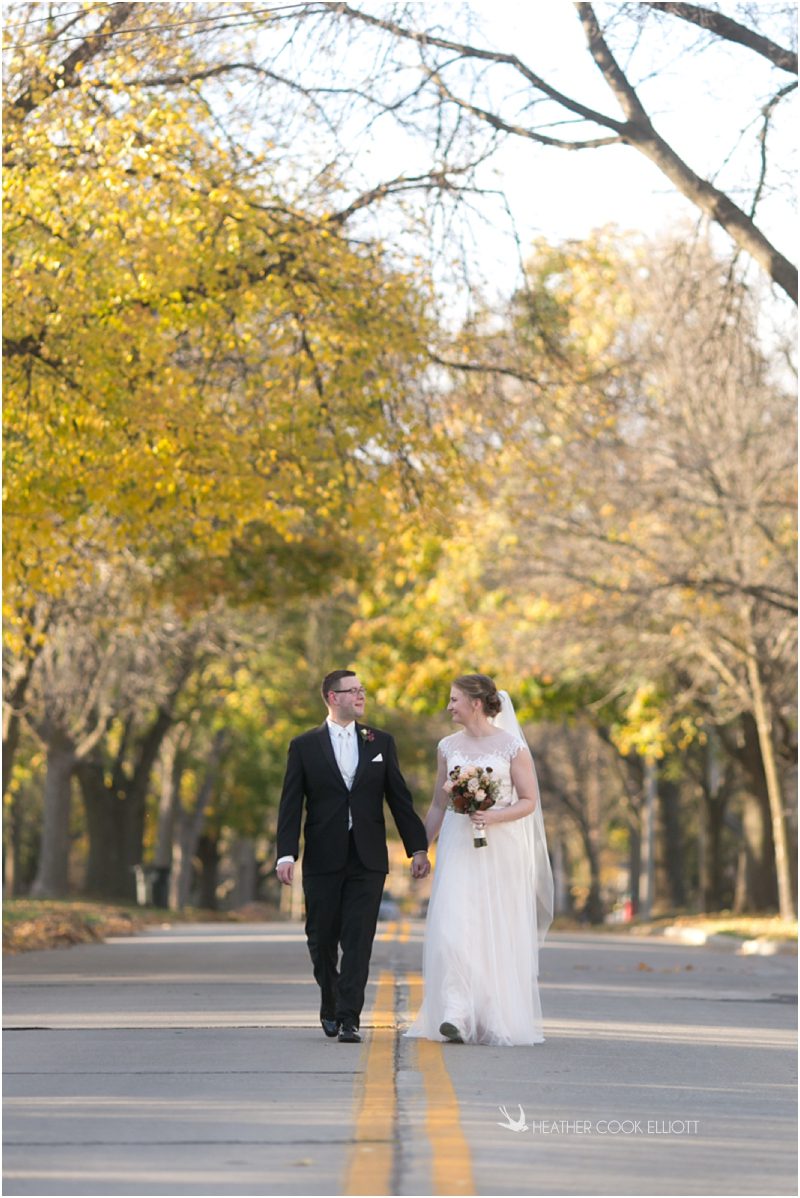 Julie & Colin’s November wedding day was exactly what any Wisconsin fall wedding couple hopes for. It was crisp, but sunny, with colorful leaves still clinging to trees and the kind of atmosphere that makes one want to be outside enjoying a beverage with friends. Julie and Colin steeped themselves in the spirit of the day by making sure they stuck close to their neighborhood and favorite places, treating their bridal party to an afternoon at the (locally) world famous Leff’s and cuddling their beloved dog Norbie in the process. They married at the church they attend regularly just blocks from their house and invited Julie’s family priest to seal their vows. Julie kept an adventurous attitude all day and was willing to clamber riverside at Hoyt Park, a place they love to visit with Norbie on a regular day. At the reception she performed a west coast swing-inspired first dance with Colin, a dance style that Colin and his friends dearly enjoy and Julie is coming around to learning. Together they roused cheers from their guests and caused more than one standing ovation to happen throughout the night. It was a day when the ordinary turned extra-ordinary just because two people found each other and said Yes.