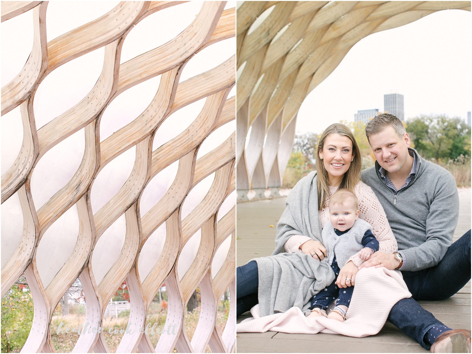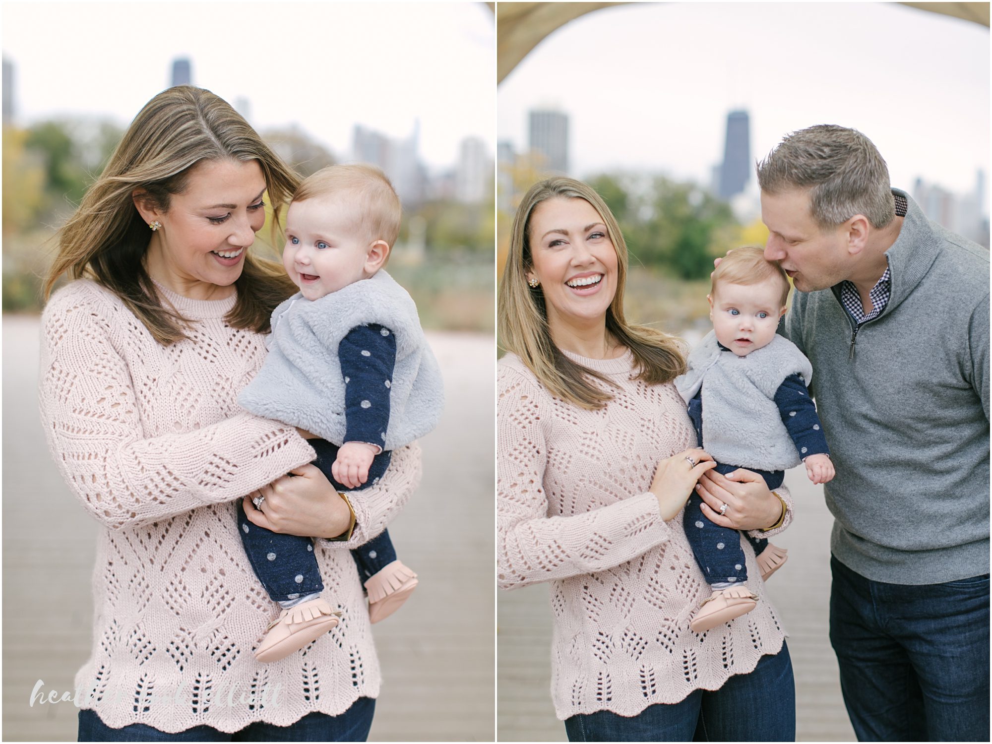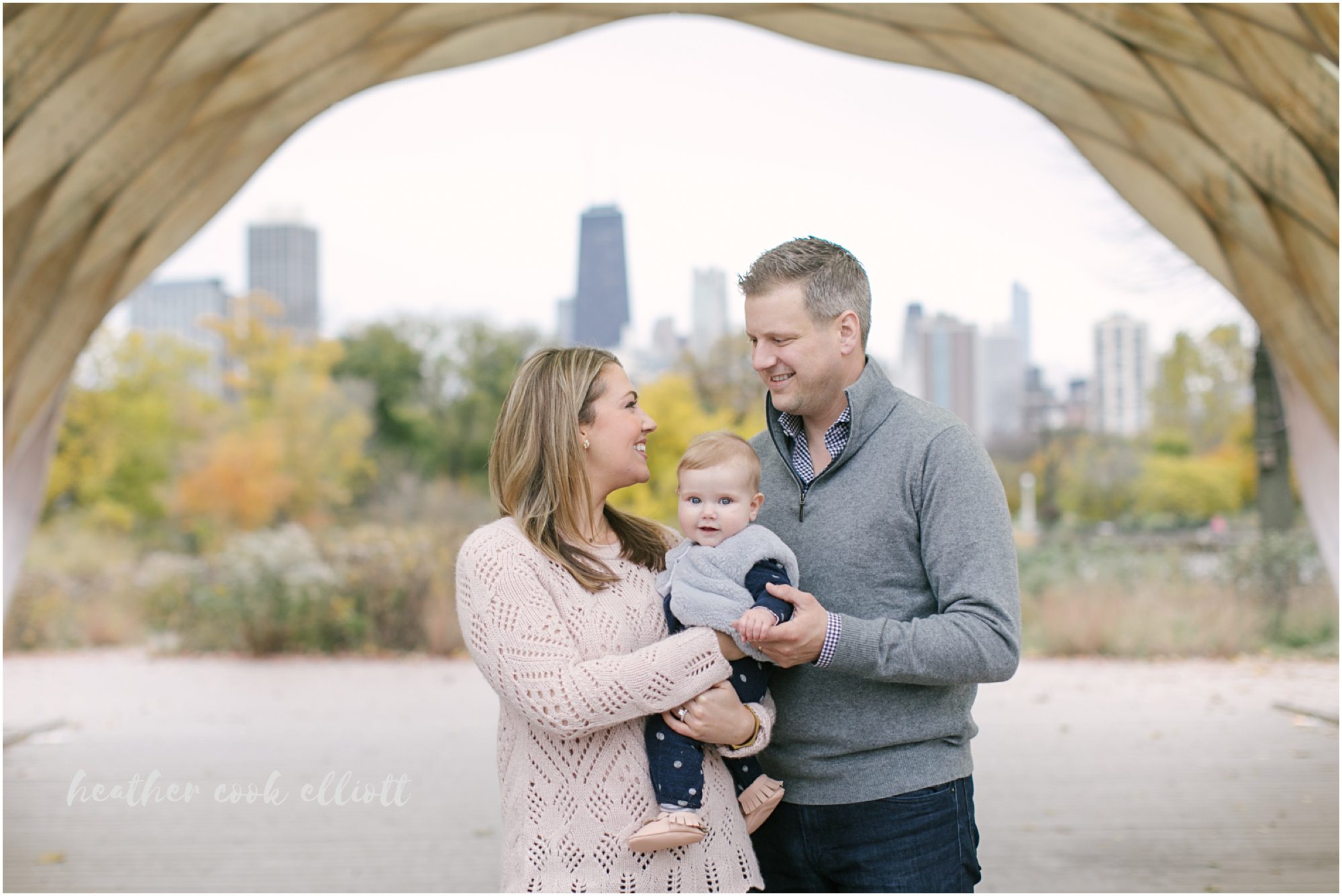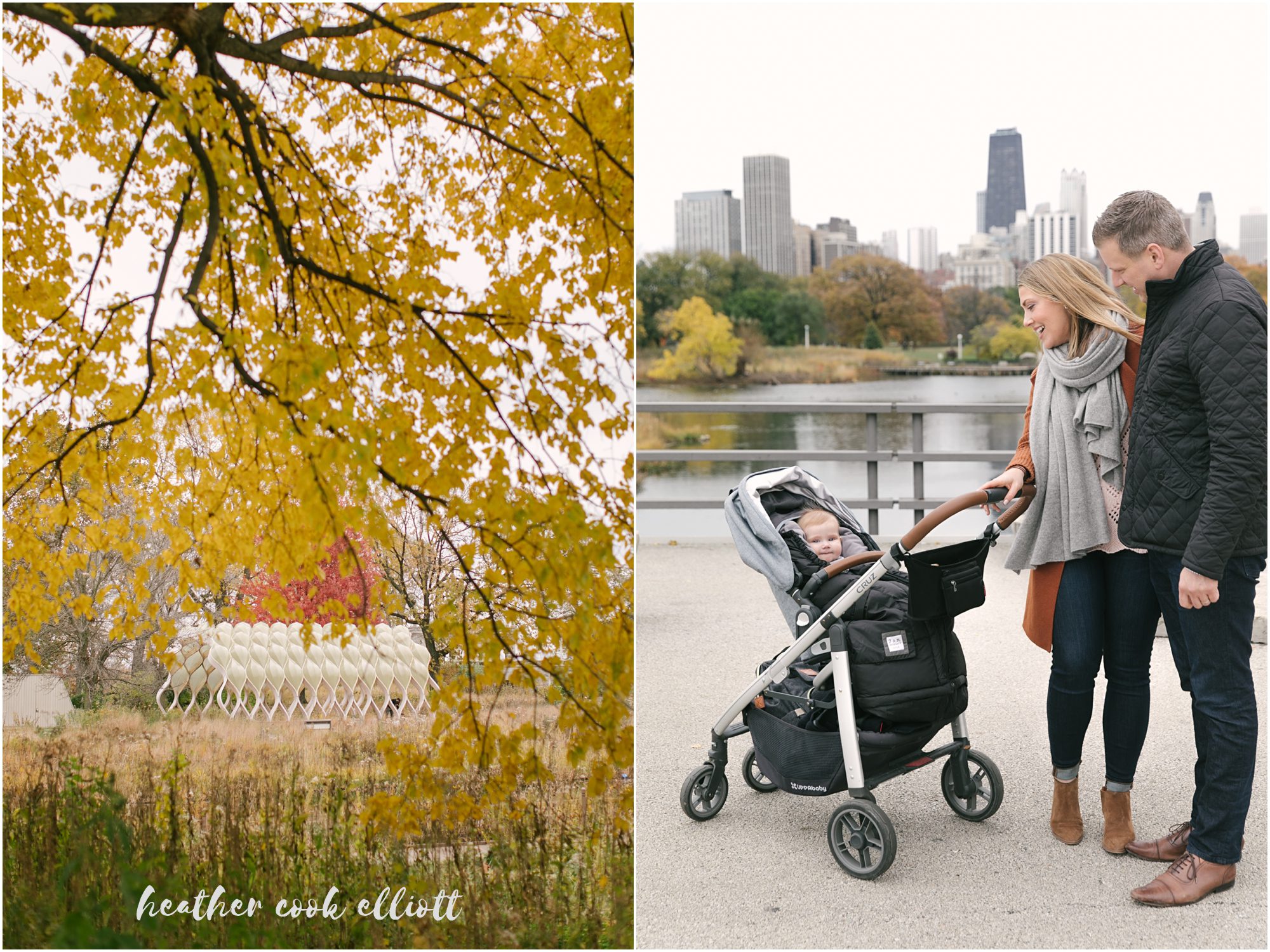 The last time I met little Brooke she was a newborn babe, all soft skin and sleepy eyes. Now, six months later she’s still in possession of that cashmere-soft skin, but her eyes are as bright, blue and inquisitive as can be. On a crisp fall day in Chicago’s Lincoln Park she showed them off for me, along with her delightful smile. We meandered along the sentimental paths that Chicagoans love, reminiscing about the time her dad asked her mom to marry him in this very park. And so: Brooke discovered leaves for the first time and the city & Jean Gang’s pavilion played the parts of perfect photography backgrounds. Mom & Dad told their engagement story and cuddled their sweet baby girl. And all the while all I could think was well isn’t this the most perfect morning in Chicago with the most lovely little family?