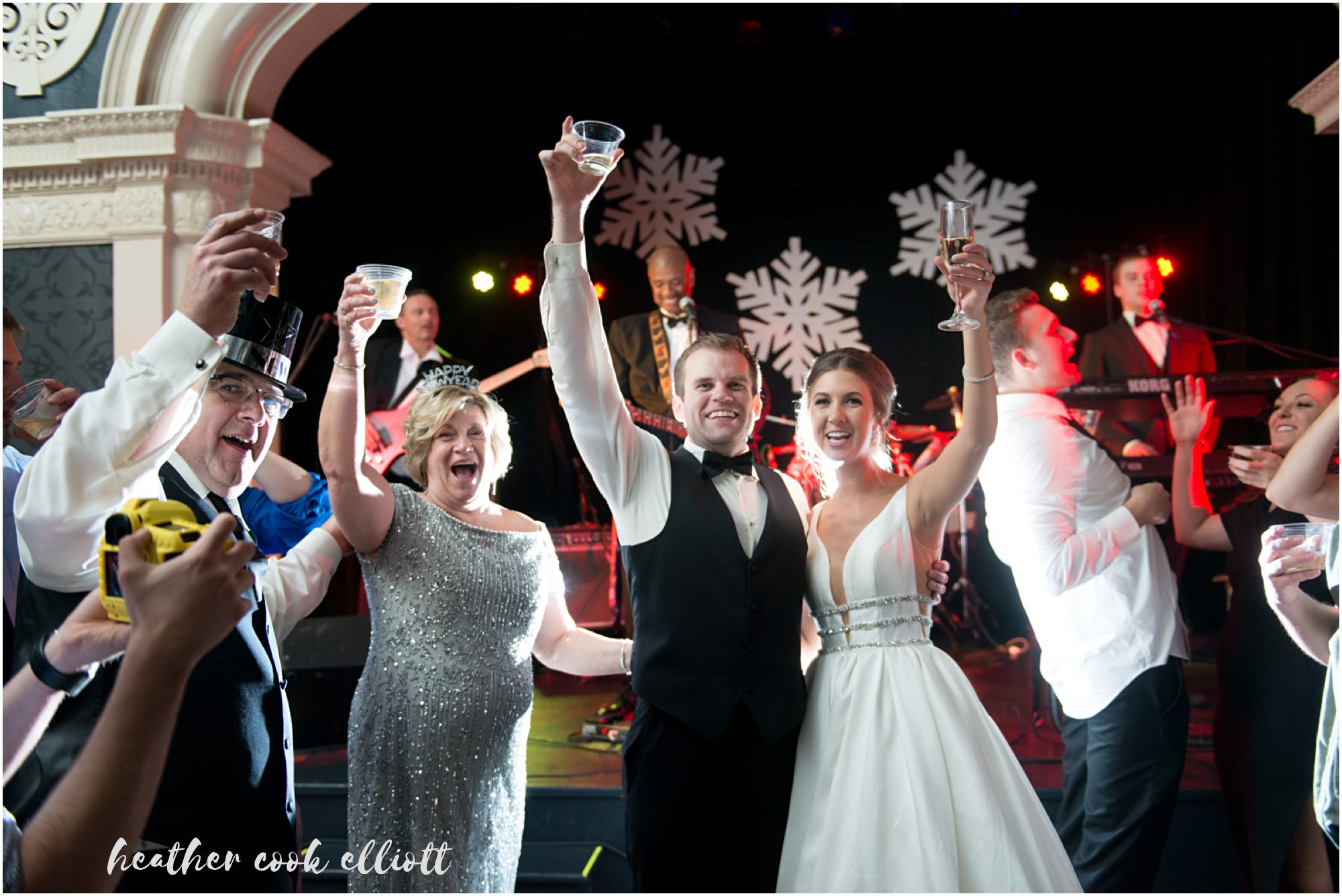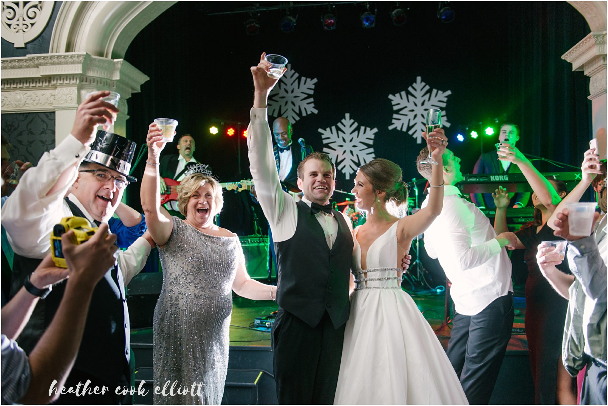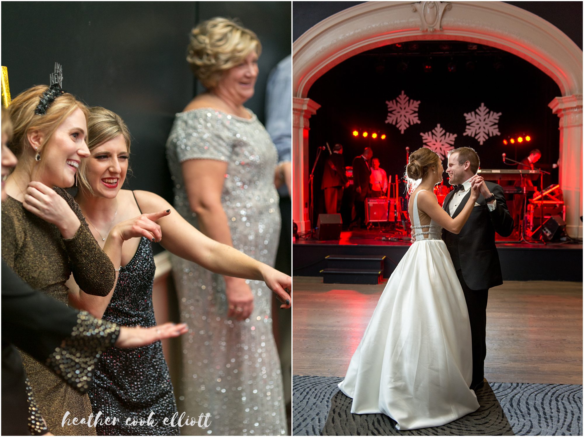 Katelyn & Josh’s wedding day was everything they hoped it would be and even more than they dared to imagine. They wanted to treat all of their family and friends to a night out, an elegant celebration with a band and party hats, a chance to share the dawn of a new year with their favorite people on the planet. So they chose a New Year’s Eve wedding date and crossed their fingers for snow. They assumed they would succeed in all of their host & hostess goals, but they couldn’t have anticipated how much all those favorite people reached back to give them the most amazing day in return. Each laugh, smile, hug, tear, confetti toss and dance move added up to make it truly, the best day of their lives. We loved how focused they were on conveying their love and appreciation to family, on honoring their history and on being present for every moment of their whirlwind day. They wrote letters to family and family wrote letters to them; Katelyn surprised Josh with her heartbeat pattern inscribed on his ring (they are both nurses so heartbeats are particularly apropos,) and they were married at the same church her parents were nearly 3 decades ago. The day was full of sparkle and old-world glitz, but also red wellies just perfect for tromping in the wet snow and classic paper NYE crowns that go best with fresh baked cookies and cake. Cheers to classic NYE weddings and most of all, a lovely pair of souls whose hearts beat for one another!