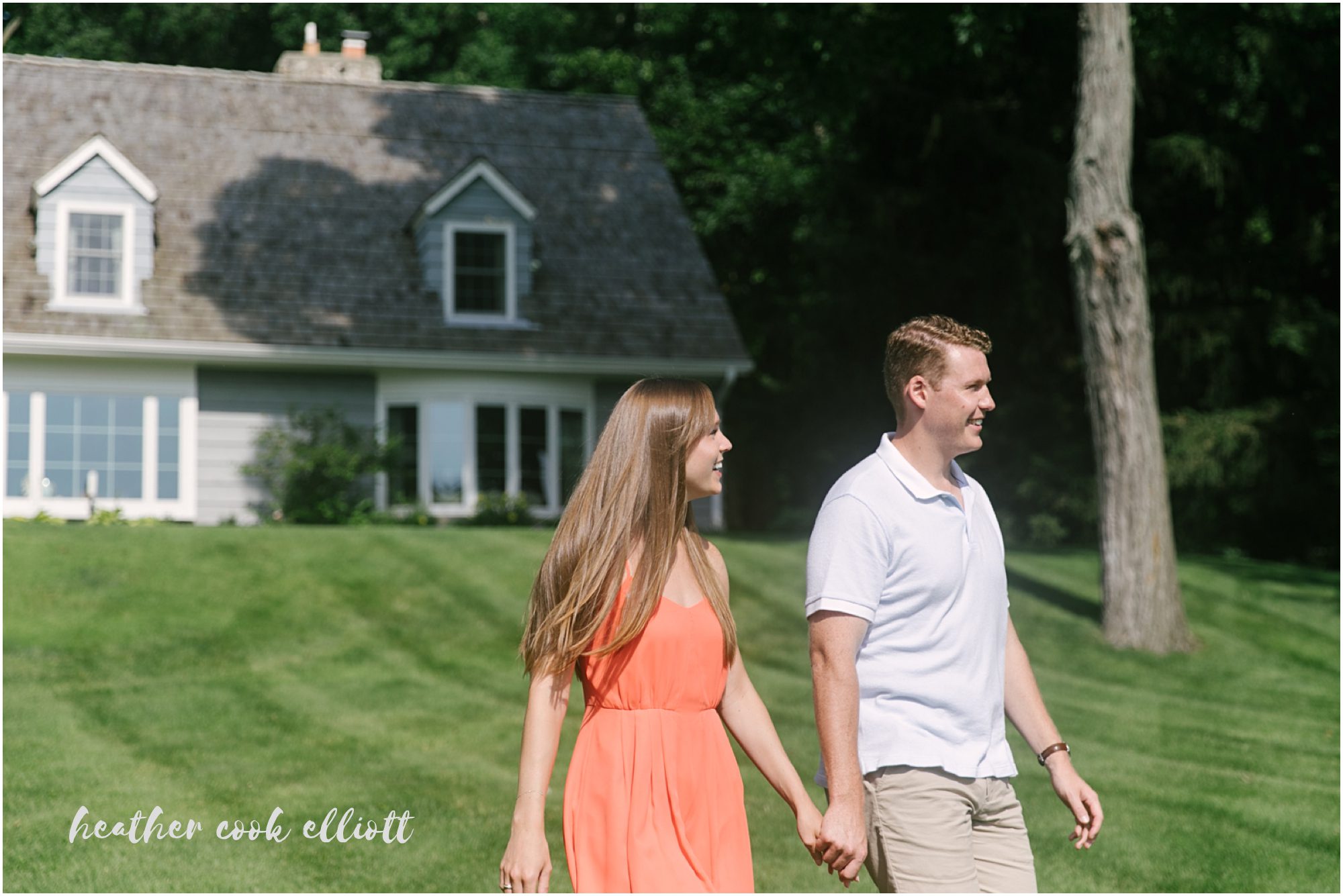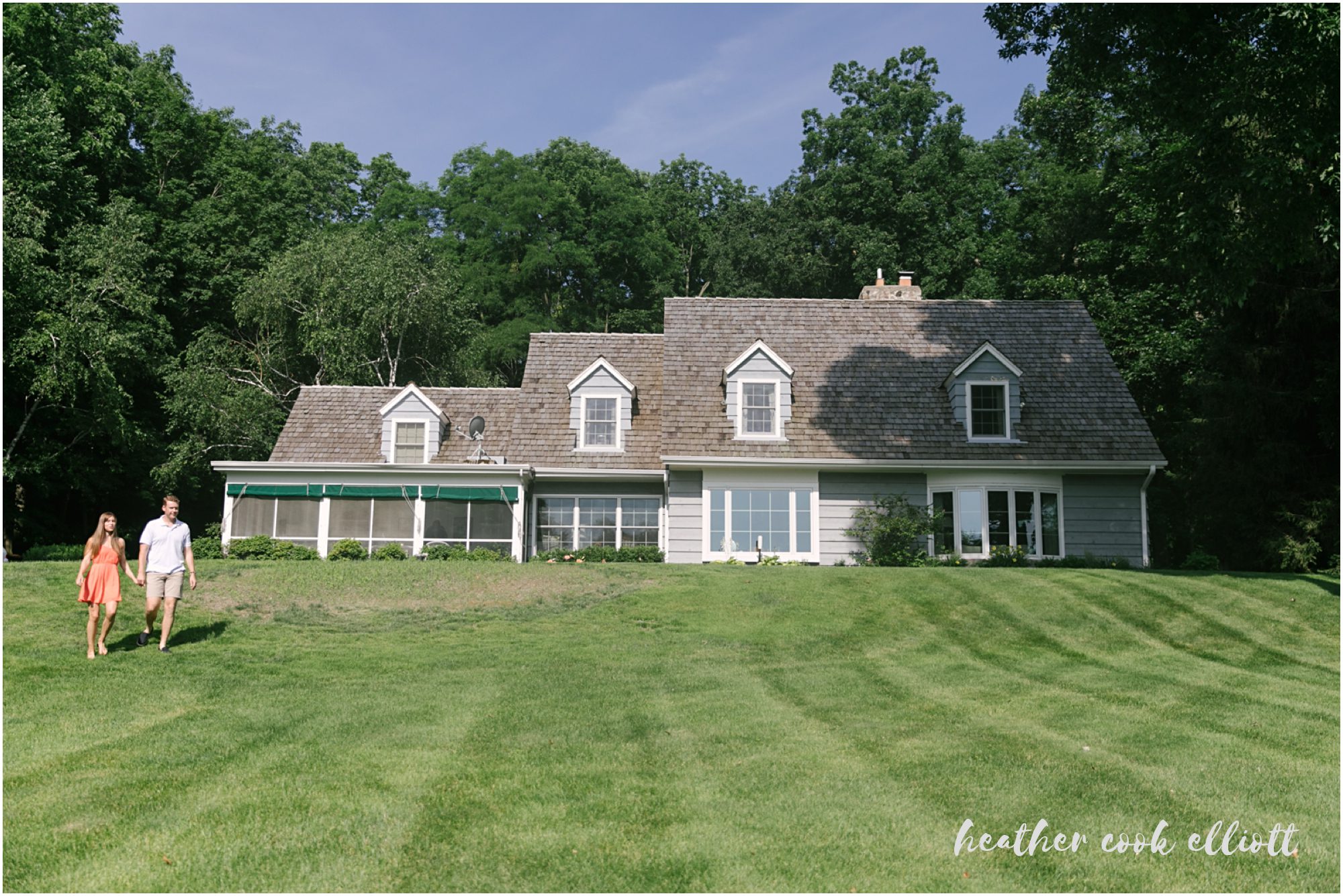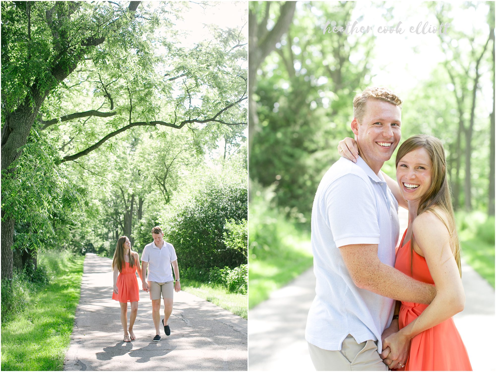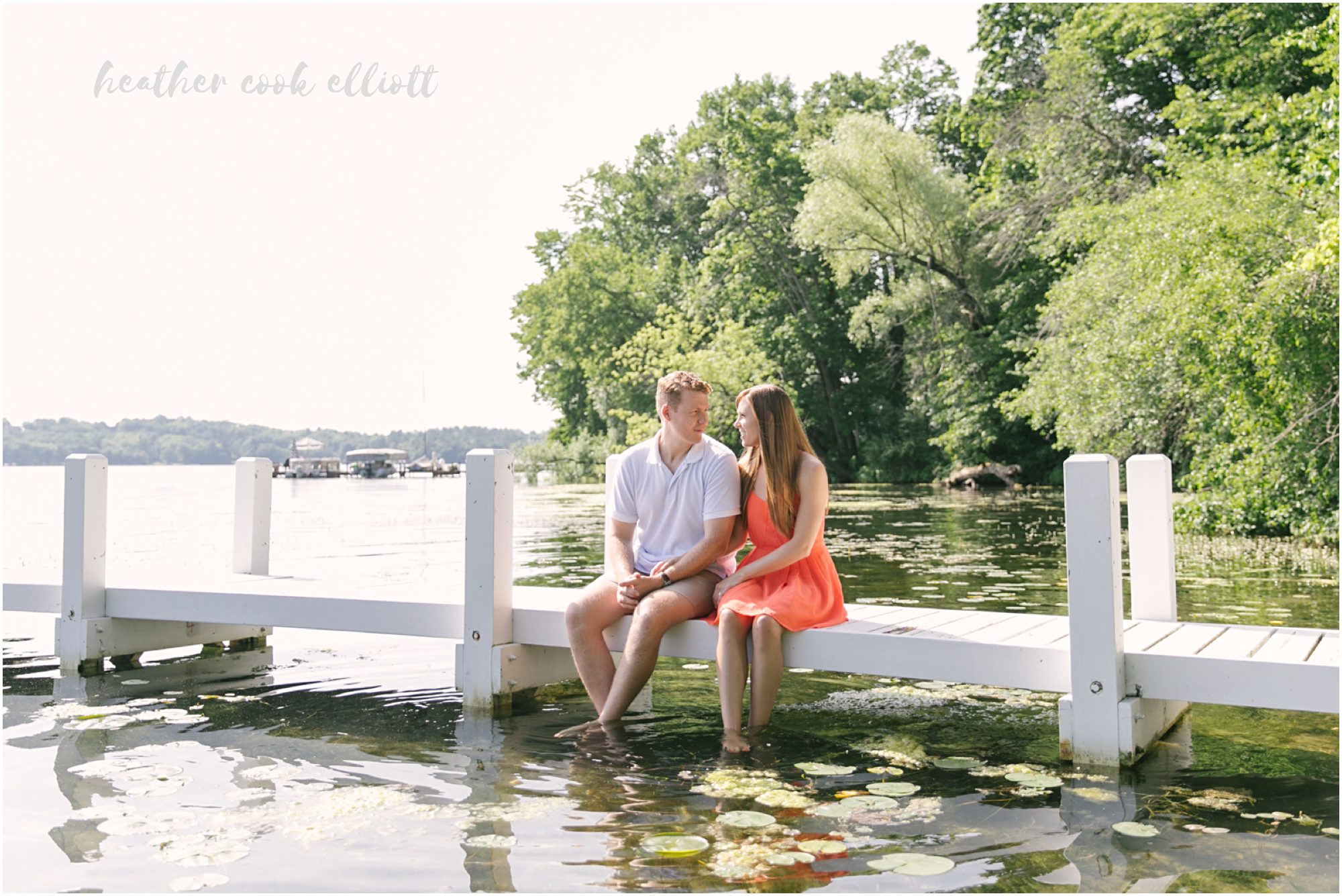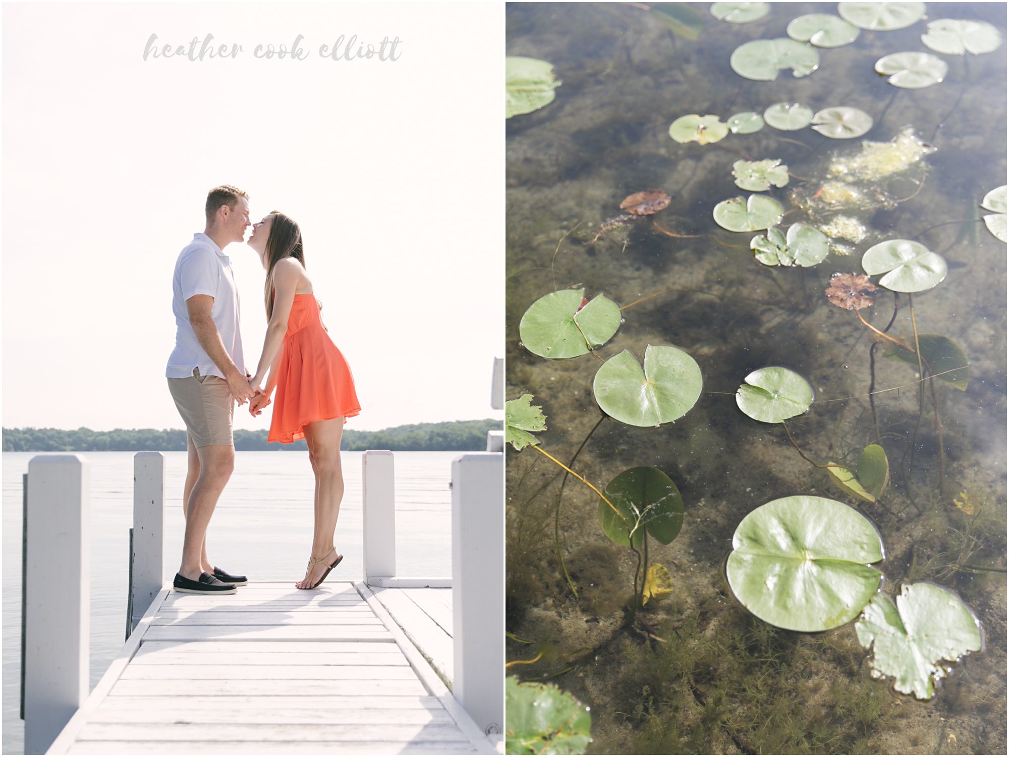 Heather & Connor have a story that criss crosses the country with childhoods in the midwest and college out east, but the parts of the story that spark the sweetest smiles and their hearts’ collective nostalgia often involve a lake. So on a summer day, brilliant with sunshine and the abundant foliage July in Wisconsin offers, I met them at Heather’s grandparent’s home on Pine Lake. They skimmed their toes in the super-warm water and revealed to me the boat house residence of an adorable frog. They relaxed in the adirondacks and literally kicked their shoes off to enjoy the morning. We talked about their upcoming Milwaukee Art Museum wedding (where all shoes are sure to stay on) and reveled in the contrasts between a lazy morning at the lake and their planned city wedding, albeit equally lakeside. But on this day we pushed the (happy) thoughts of couture white dresses and guys in suits to the side and decidedly focused on docks and country lanes, lilypads and shady walks. In these last few weeks before the wedding planning craziness really descends on them I think it was exactly what was needed. And oh yes, it was gorgeous, too!