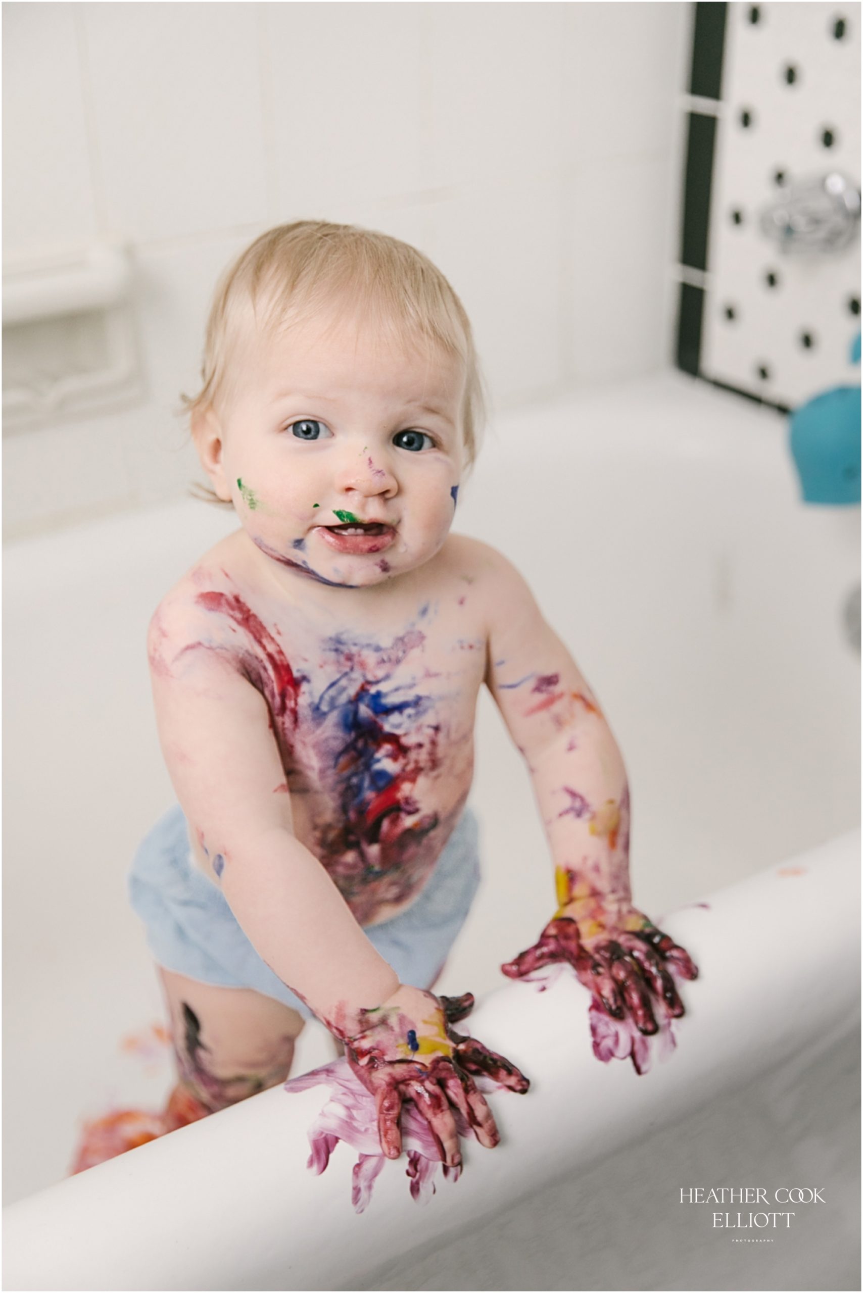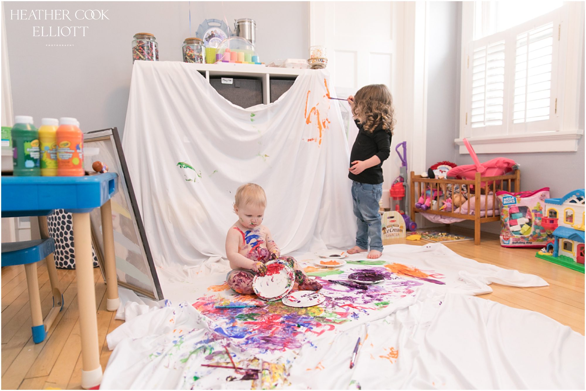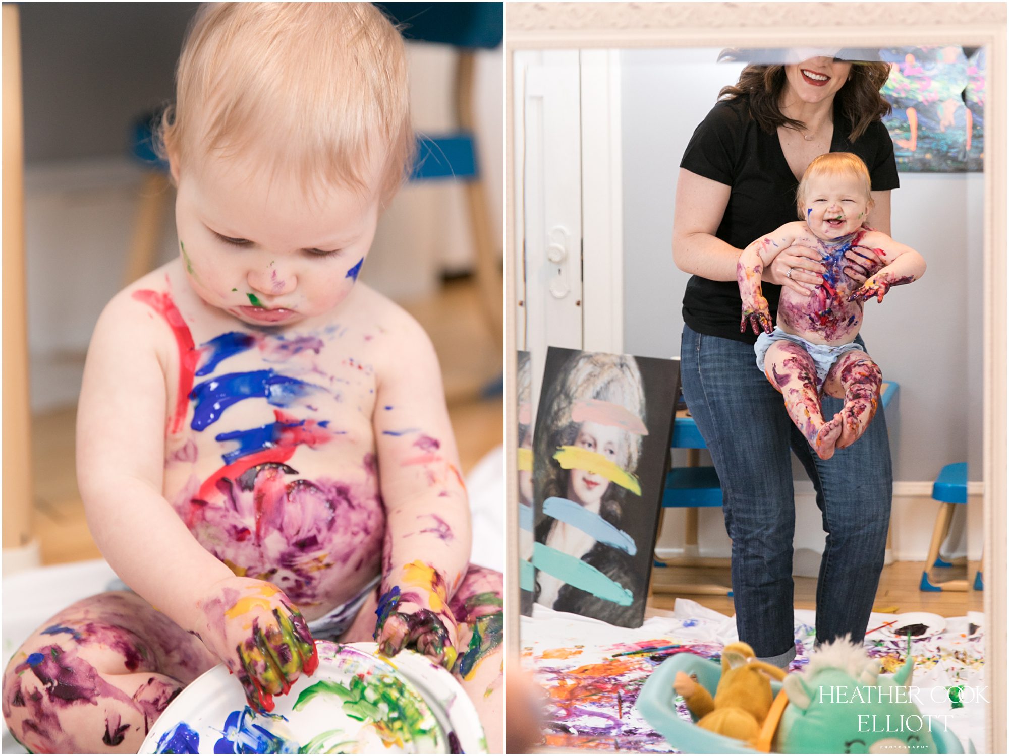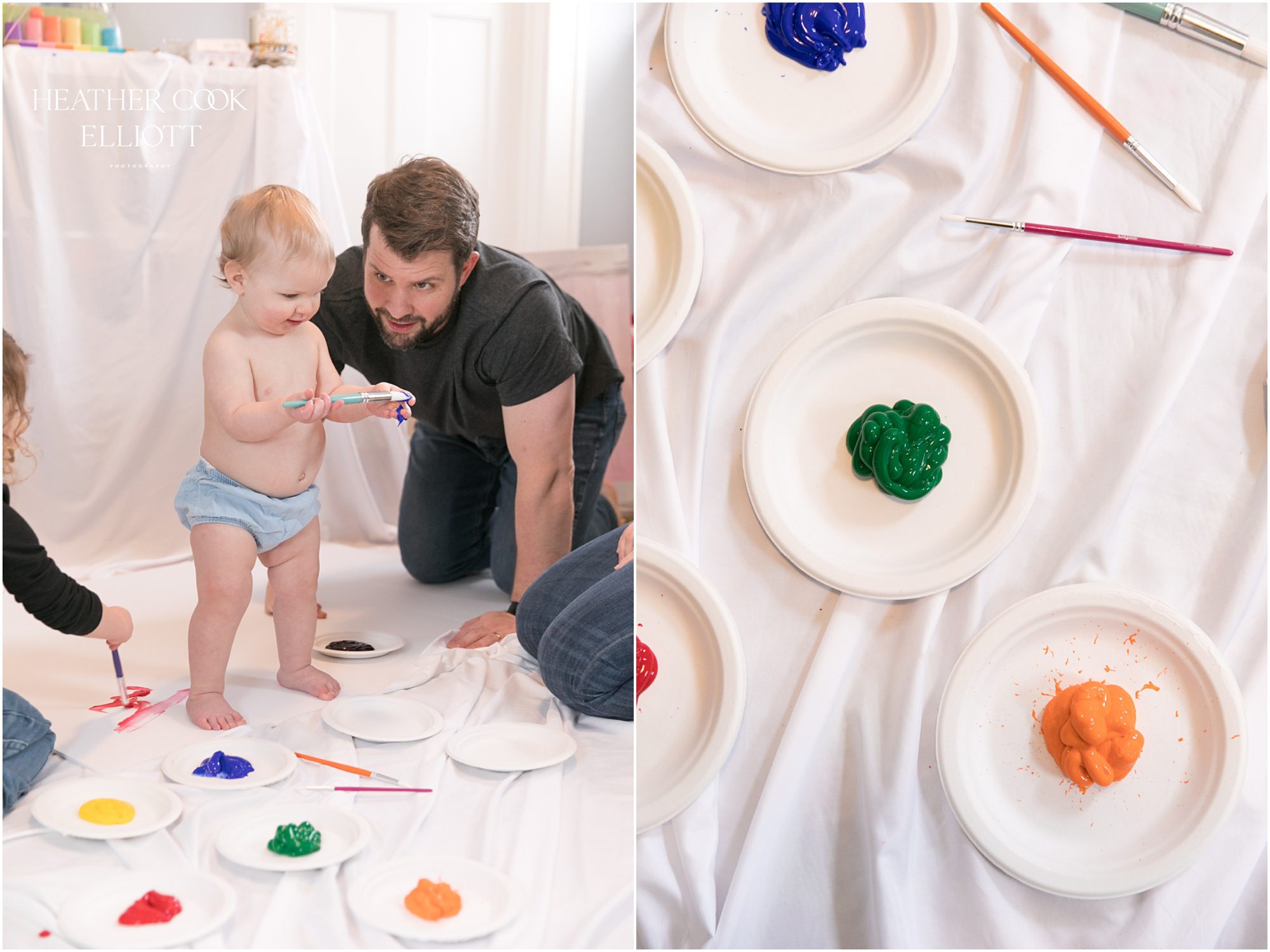 During her 1 year photo session Isla Ruth was mostly straight faced, clearly trying to figure it all out. But when her squinty-eyed, brilliant, mostly toothless smile came out, man oh man, did it Come Out. Her big sis is a pro at drawing out that smile and a toss in the air from daddy will make it happen. And, of course, some sweet cuddles and mama-based loving seems to work, too. This winter baby didn’t get the benefit of a sun-filled outdoor session, but her courageous and clearly very fun parents made up for that with an indoor painting party and Isla was in it to win it. It was a joy to capture her exploring the paint and where it might be placed. Sister Emerson guided her and together they made their own birthday masterpiece. It was delightful and all around heart meltingly sweet – just like Isla Ruth.