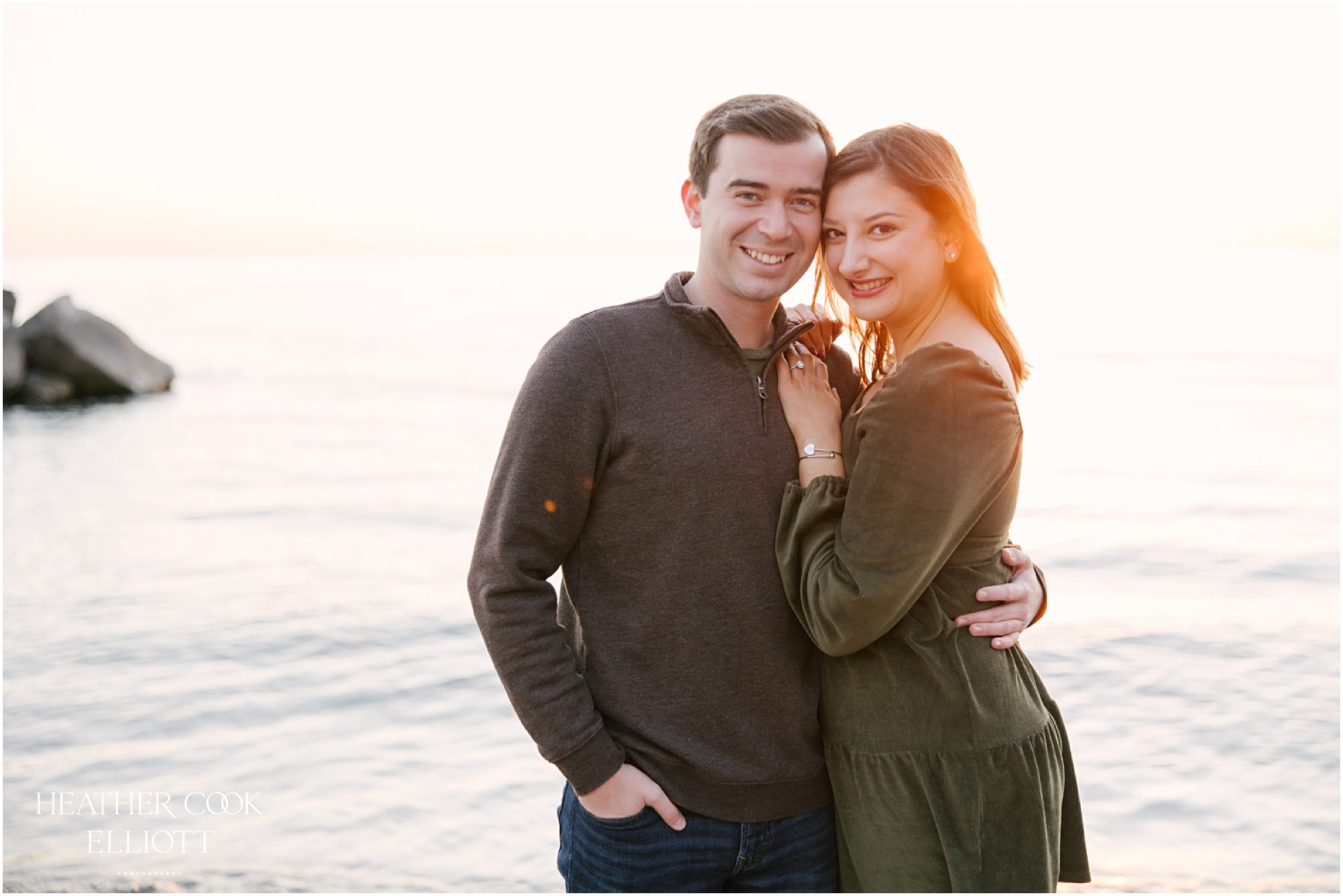 Natalie & Matt are an adorable couple with an enviable joie de vivre that comes to the fore whenever they’re in one another’s presence. Natalie’s shy smile easily turns to happy laughter when Matt turns his attention to her and Matt reads as incredibly calm and cool – that is, until he looks at Natalie and melts just enough to show how madly in love he is with this gorgeous woman. And happily for us they took our advice and opted for a sunrise engagement session along the shores of Lake Michigan. As the sun peeked above the watery horizon they held hands and breathed in the crisp morning air. And then when the sun climbed a little higher they climbed too, up on the rocks to relax into each other and enjoy their own private space in the world. It was a perfect morning in the midst of true love and a bright future.
