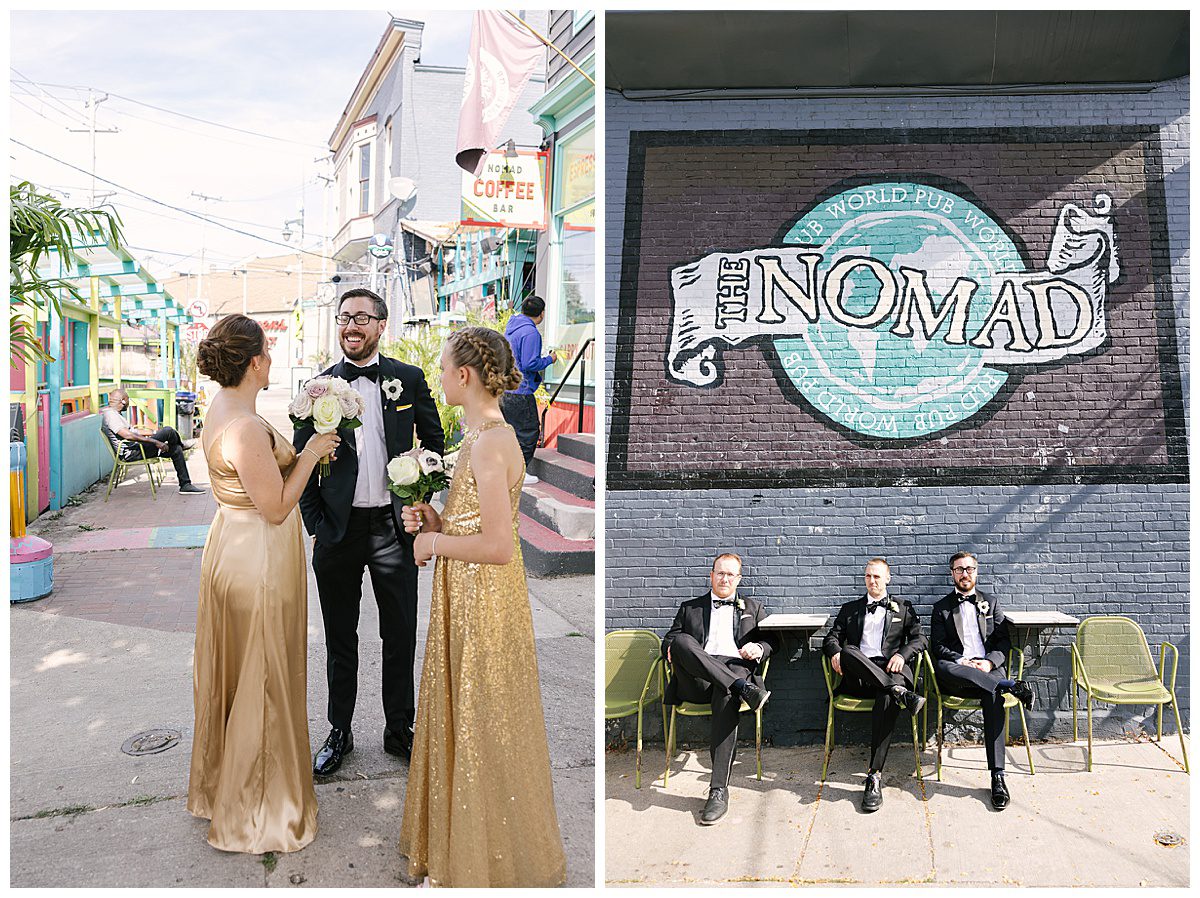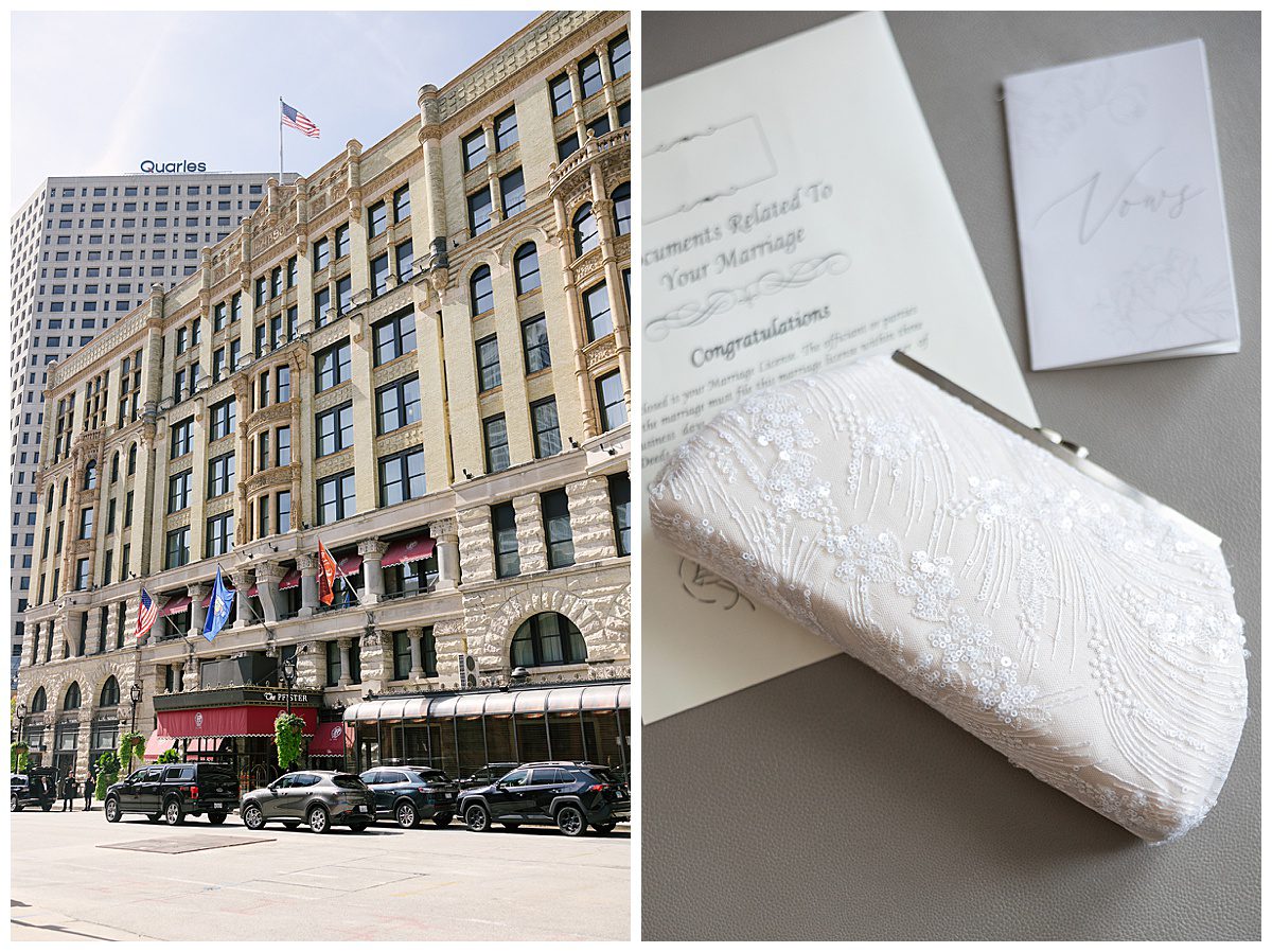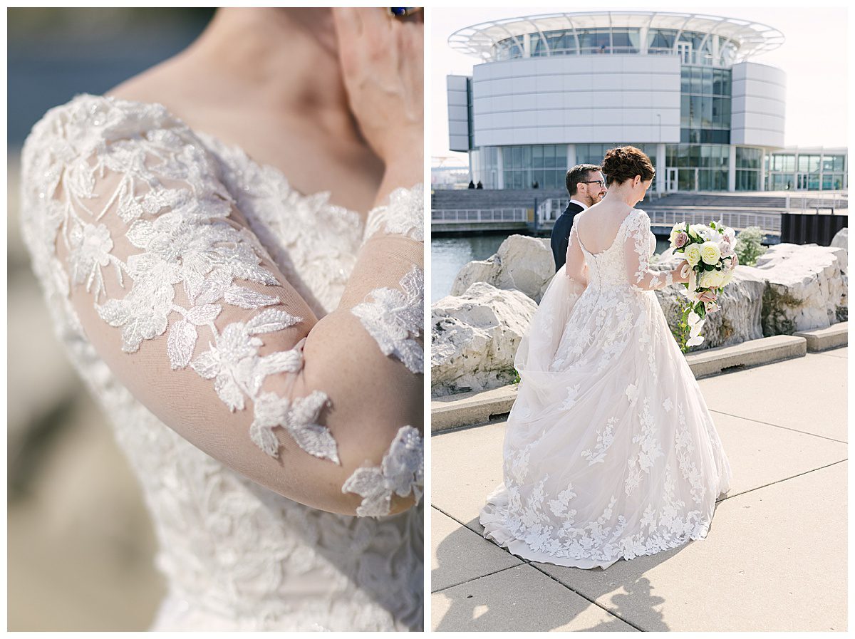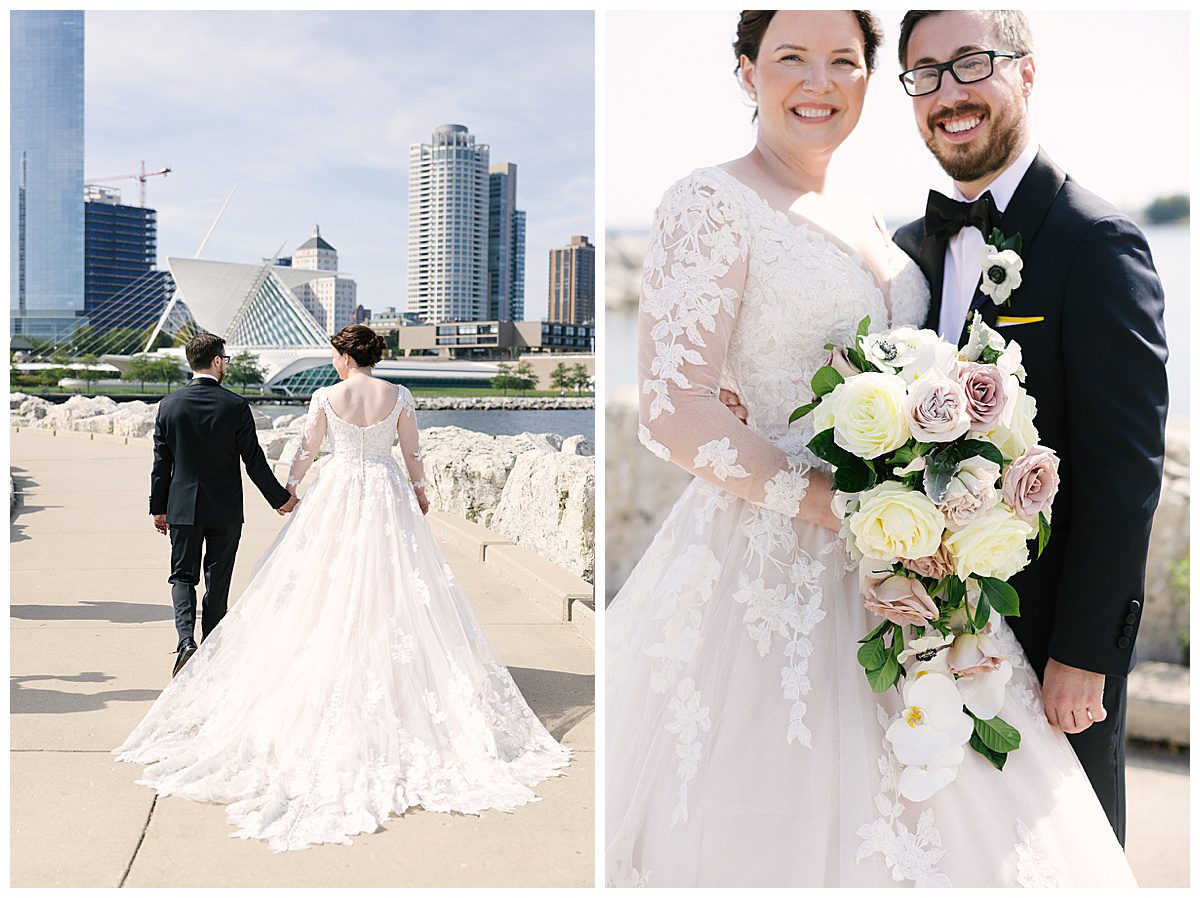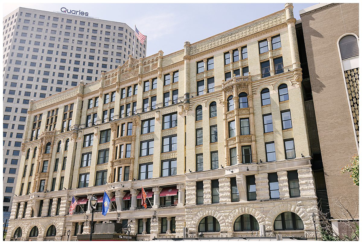 Laura & Jay were married on the kind of blue sky Milwaukee day that Wisconsinites dream of in winter. It was nearly fall so Laura wore gorgeous sleeves and Jay’s classic tuxedo (with a playful pop of color on the pocket square) fit in perfectly at the Historic Pfister Hotel where they hosted their ceremony & reception. But those style details also managed to contrast delightfully with a bridal party stop at Jay’s favorite place in Milwaukee, his home away from, The Nomad. The two of them kept the bridal party small which meant they could keep their connections and conversation deep and we loved how their people where 100% there for them all day and night. Very little of their day was scripted, but instead it unfolded with laughter and tears and remembrances, with tributes, twirls and heartfelt toasts. Ready to smile? Okay then, let’s jump into Laura & Jay’s sweetest day ~
