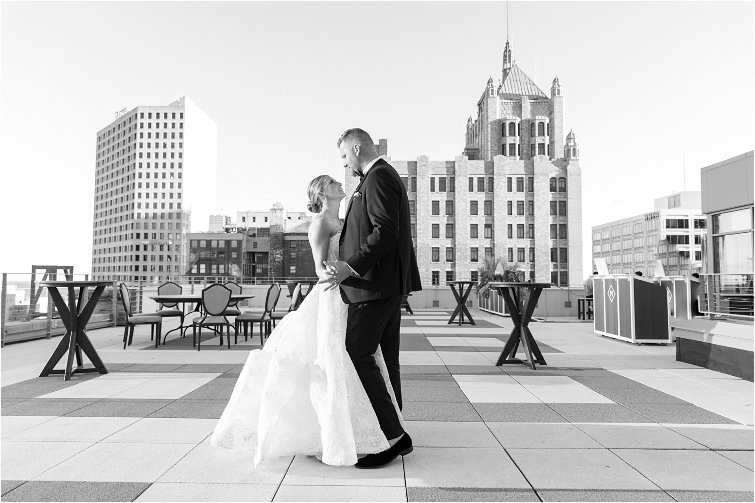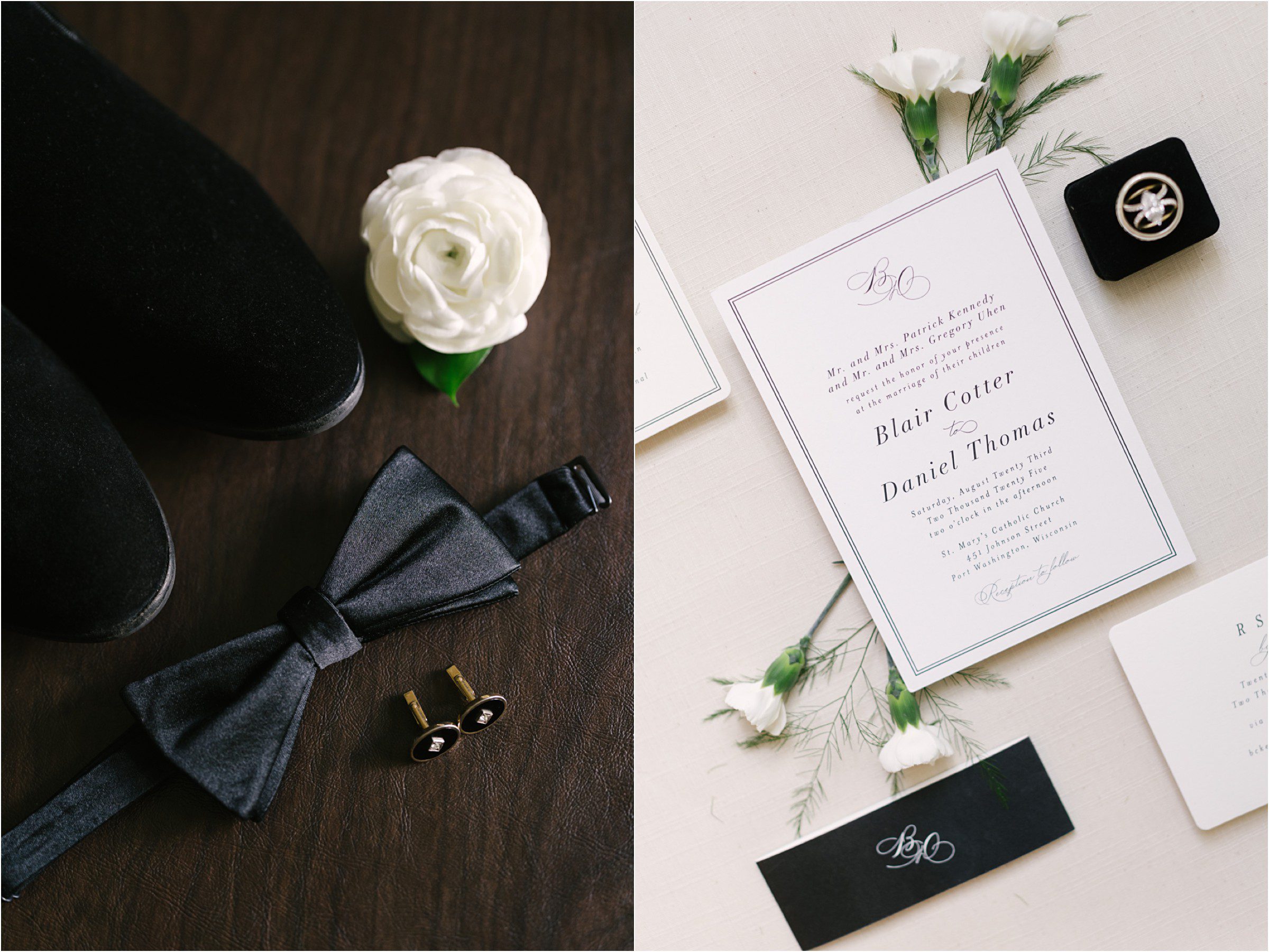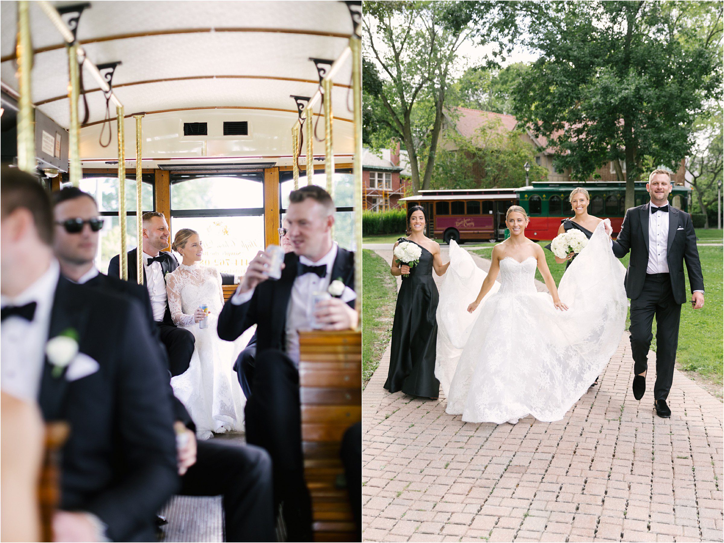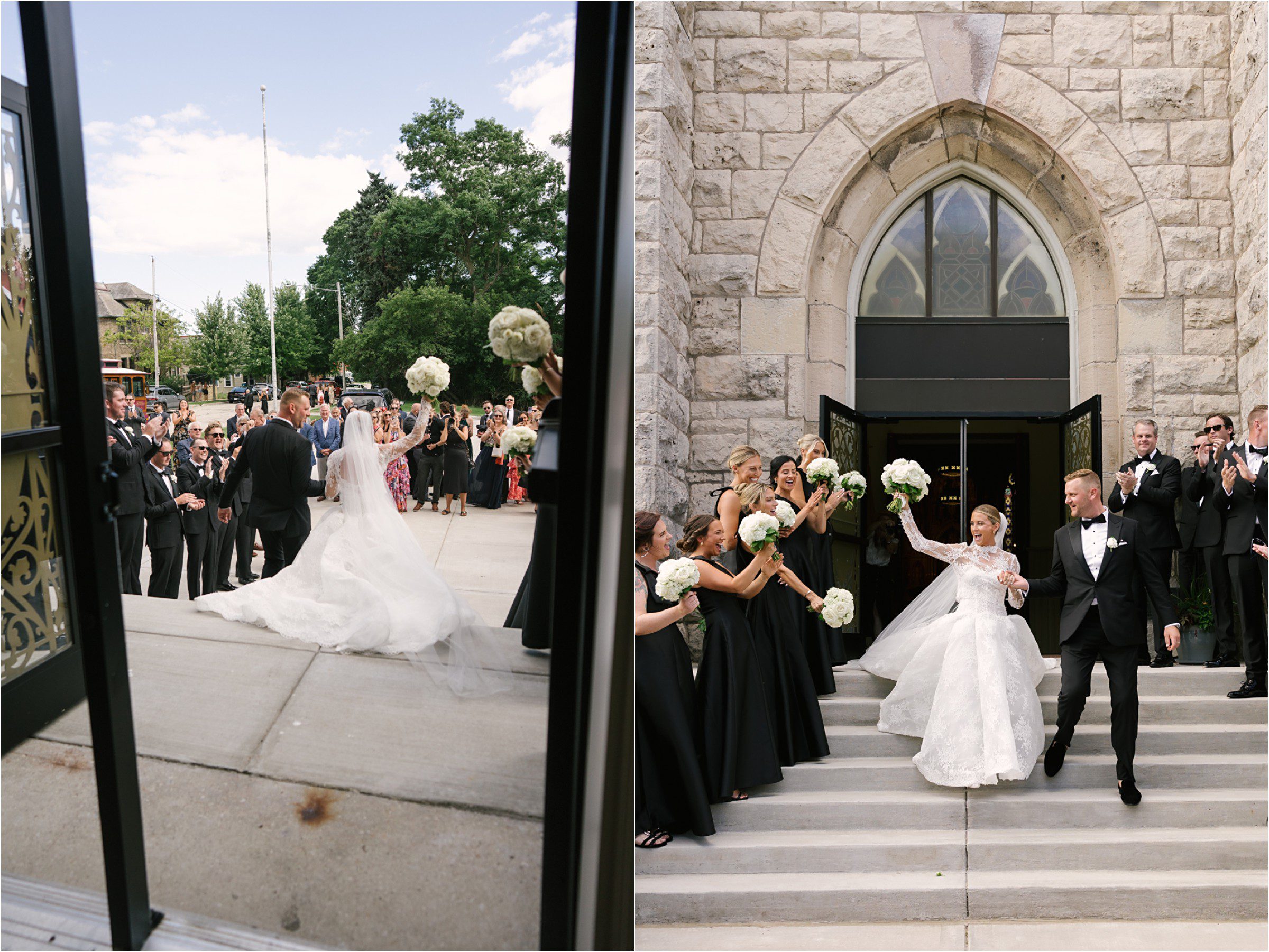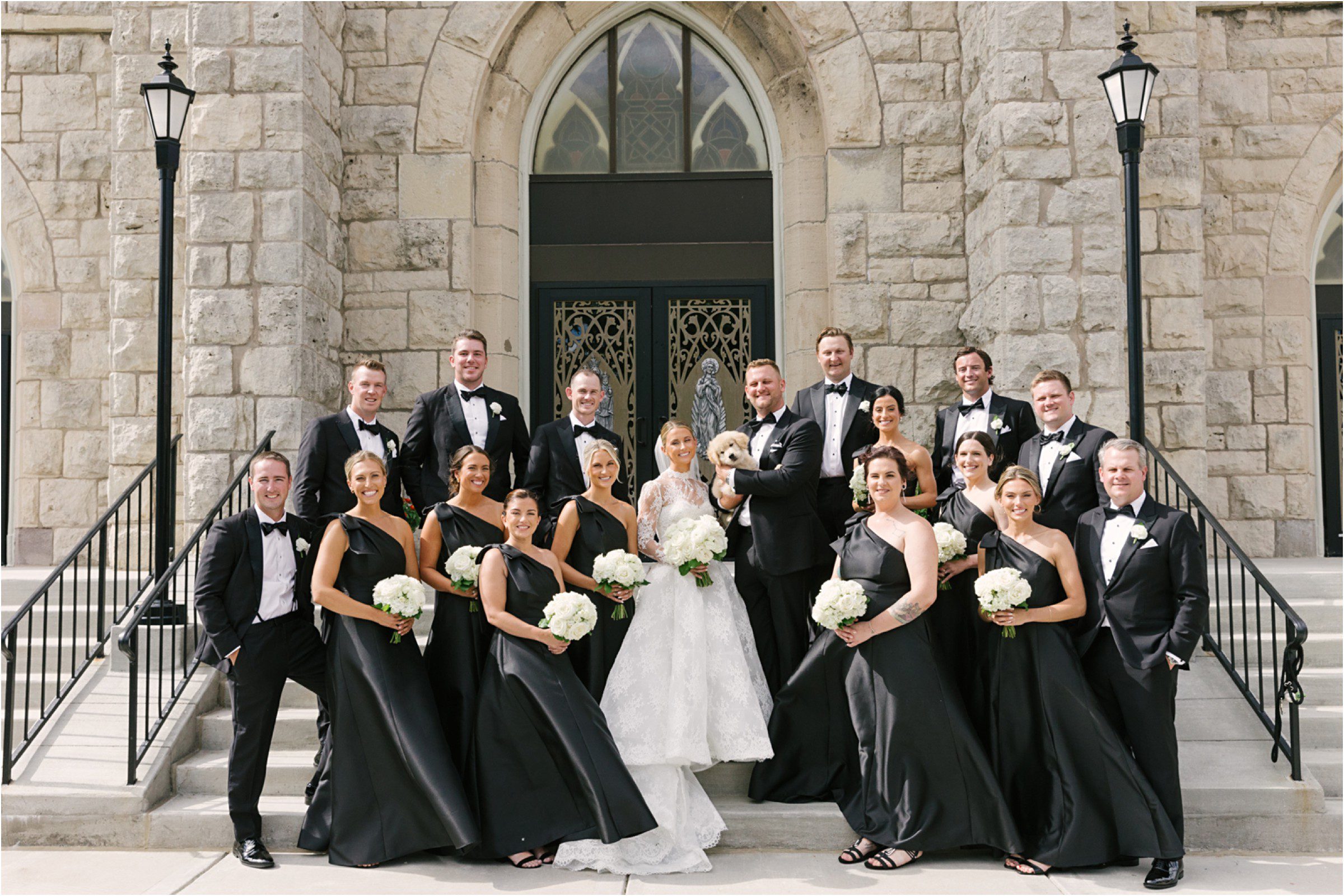 Blair & Danny’s stylish wedding day was split between Port Washington & Milwaukee and was 100% elegance. A black & white styled wedding is always a favorite for us but there was something extra special about the soft, romantic details Blair & Danny brought to the day: lace sleeves, classic suspenders, ranunculus petals, and a PUPPY! Simba joined them just after their wedding mass and spread his furry puppy cheer to all before a classic wedding trolly sped the party to Lake Park. While guests got a head start enjoying the lake and cityscape views from the rooftop of the Milwaukee Athletic Club, Blair & Danny spent a few moments in the city’s most beautiful landscape with their favorite people. From there it was all toasts & tears, hugs and happiness as they dined and danced, again surrounded by their favorite people. It was a day (and night) for the ages, just like the love Danny & Blair share.
