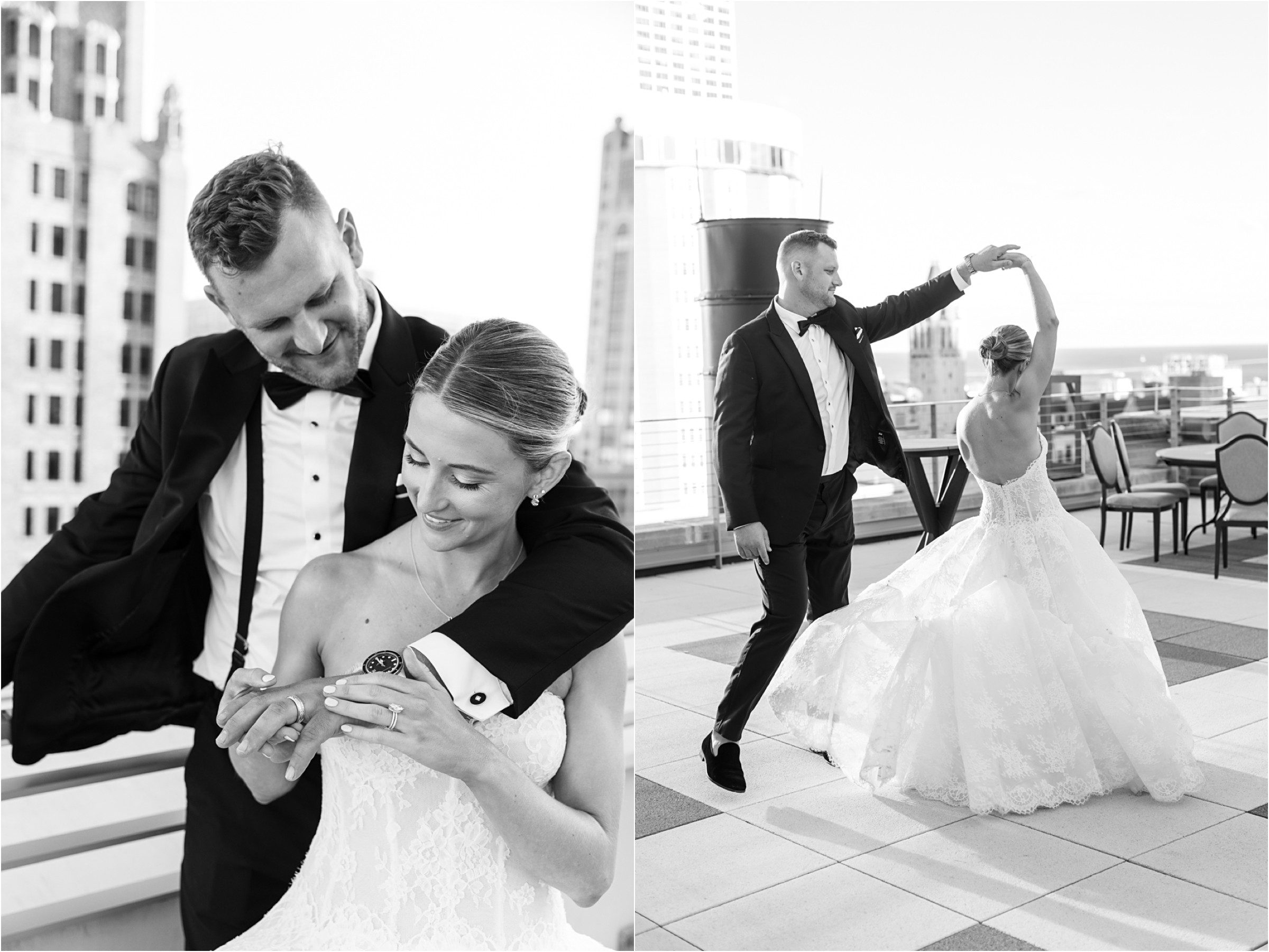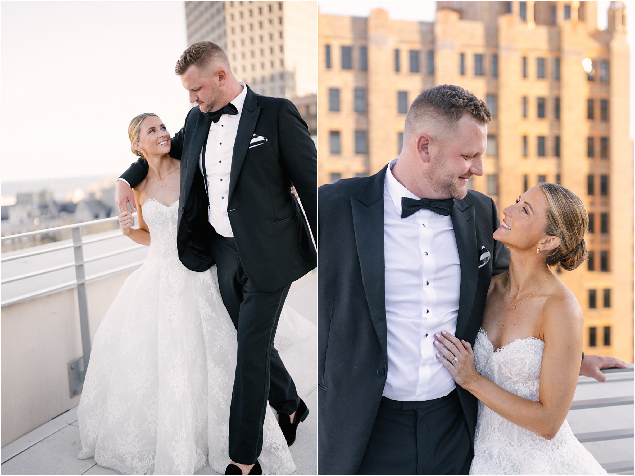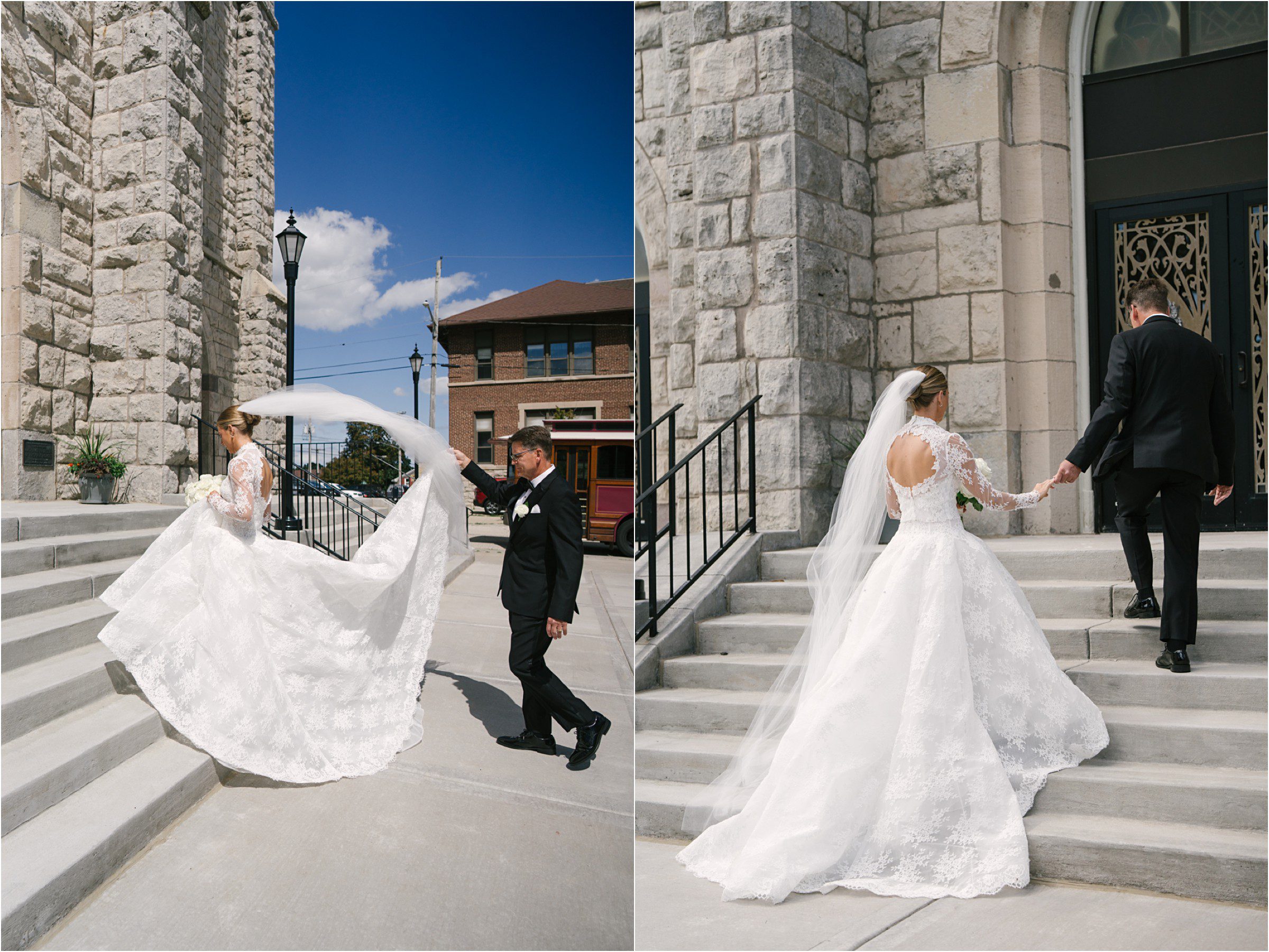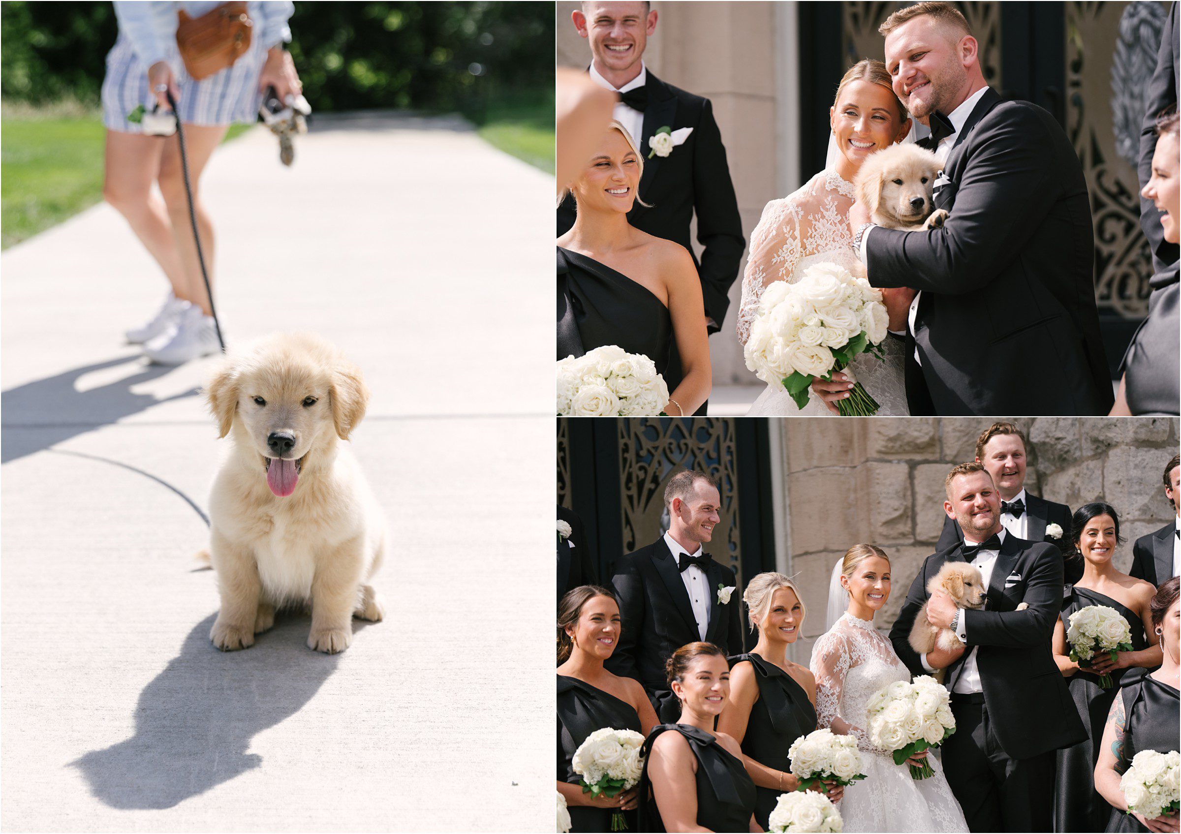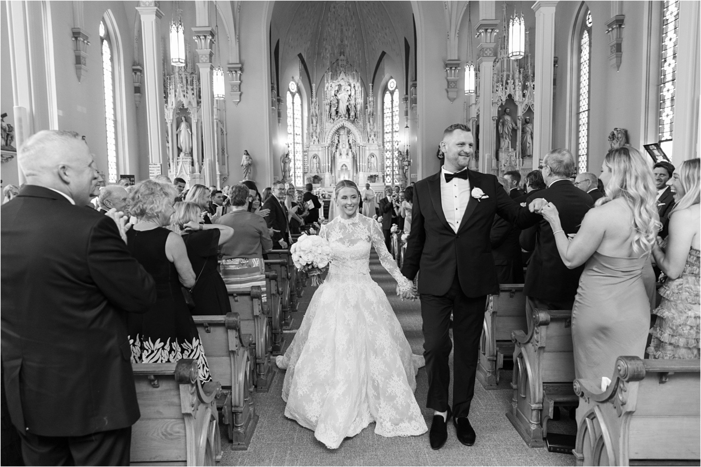 Blair & Danny’s stylish wedding day was split between Port Washington & Milwaukee and was 100% elegance. A black & white styled wedding is always a favorite for us but there was something extra special about the soft, romantic details Blair & Danny brought to the day: lace sleeves, classic suspenders, ranunculus petals, and a PUPPY! Simba joined them just after their wedding mass and spread his furry puppy cheer to all before a classic wedding trolly sped the party to Lake Park. While guests got a head start enjoying the lake and cityscape views from the rooftop of the Milwaukee Athletic Club, Blair & Danny spent a few moments in the city’s most beautiful landscape with their favorite people. From there it was all toasts & tears, hugs and happiness as they dined and danced, again surrounded by their favorite people. It was a day (and night) for the ages, just like the love Danny & Blair share.