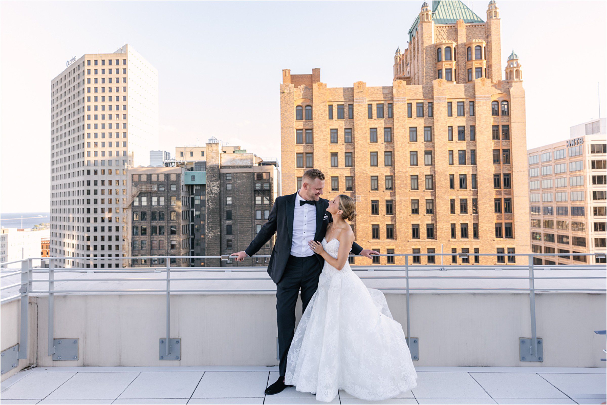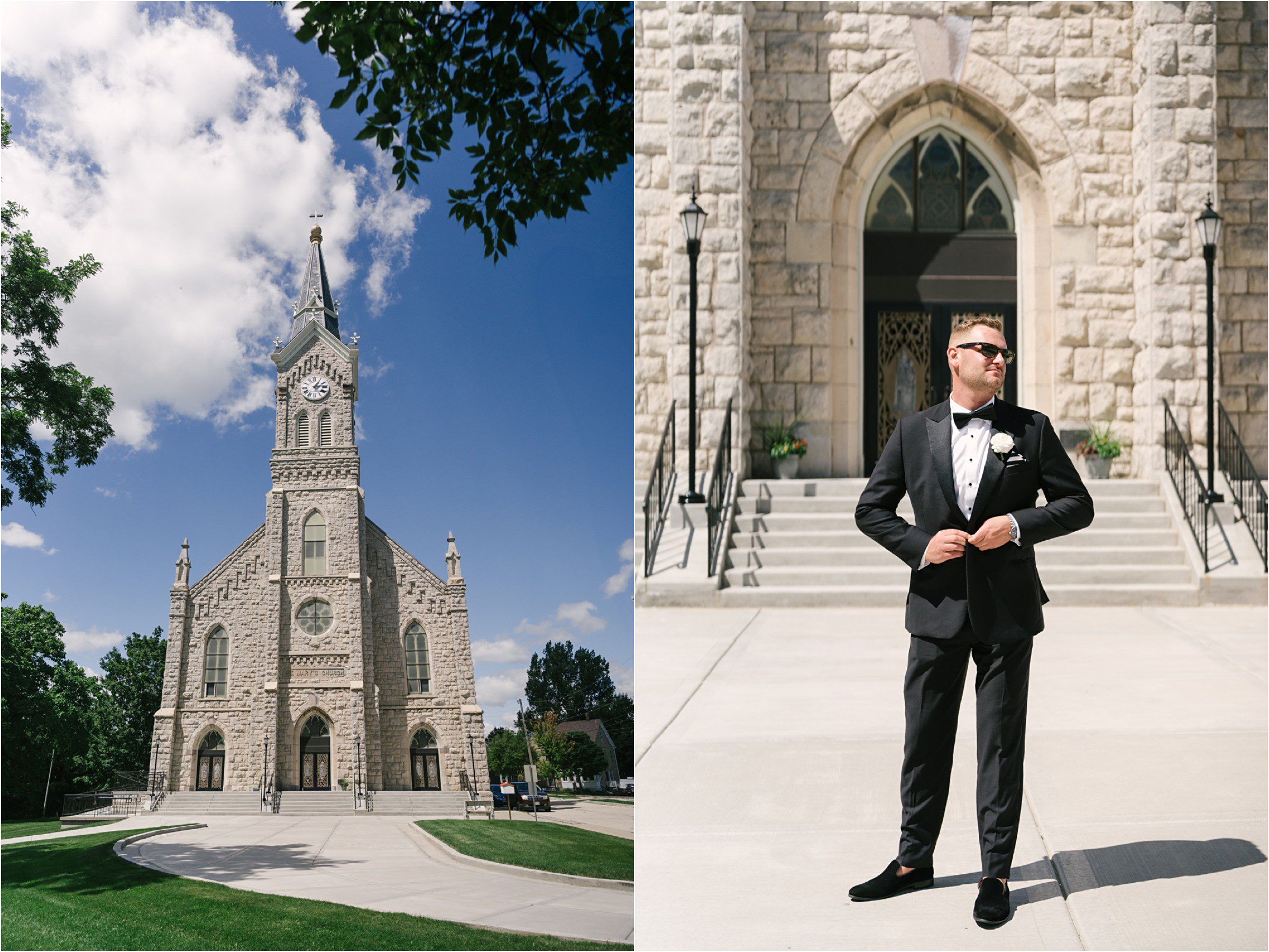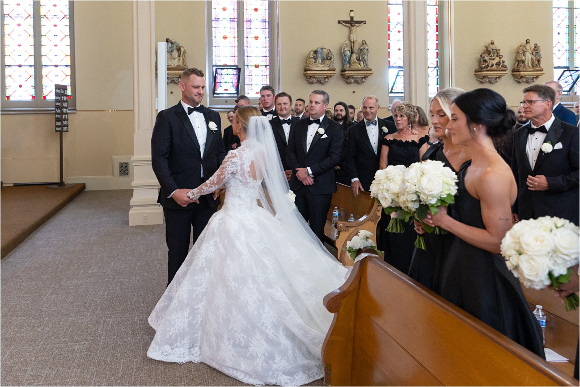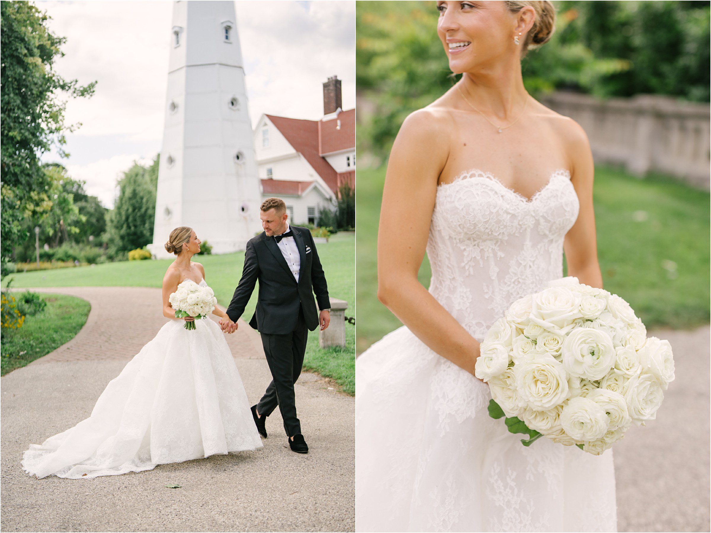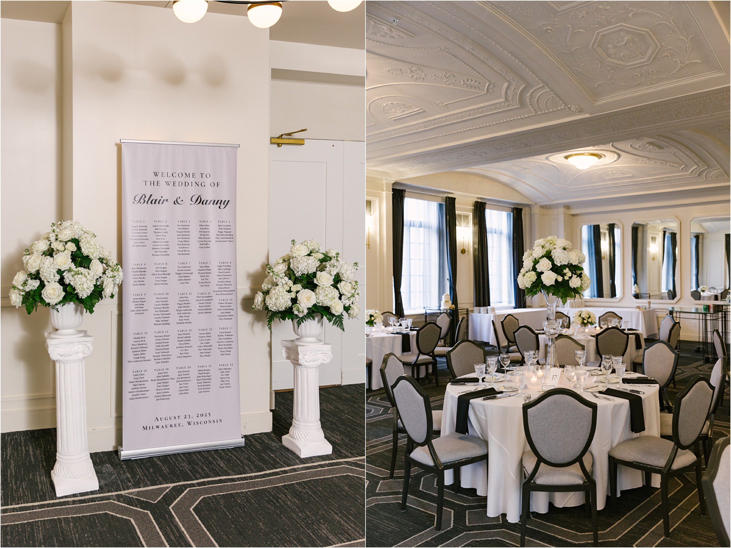 Blair & Danny’s stylish wedding day was split between Port Washington & Milwaukee and was 100% elegance. A black & white styled wedding is always a favorite for us but there was something extra special about the soft, romantic details Blair & Danny brought to the day: lace sleeves, classic suspenders, ranunculus petals, and a PUPPY! Simba joined them just after their wedding mass and spread his furry puppy cheer to all before a classic wedding trolly sped the party to Lake Park. While guests got a head start enjoying the lake and cityscape views from the rooftop of the Milwaukee Athletic Club, Blair & Danny spent a few moments in the city’s most beautiful landscape with their favorite people. From there it was all toasts & tears, hugs and happiness as they dined and danced, again surrounded by their favorite people. It was a day (and night) for the ages, just like the love Danny & Blair share.