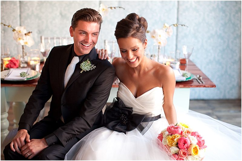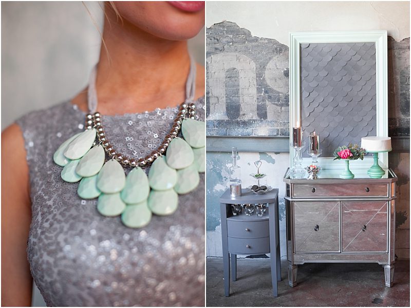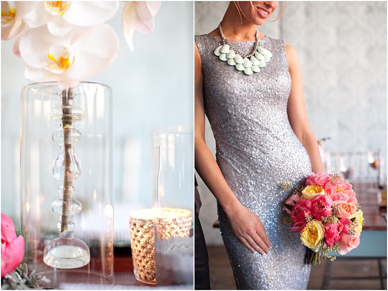 With mint as the basic color scheme Amanda accented the custom made backdrop, table and bench with touches of grey, coral and silver. Classic silver chiavari chairs inspired the baroque legs on the bench and table and a modern fish scale design and mirrors were sprinkled throughout to add a little easy glamor to the design. We knew that sophisticated but simple flowers would be important so Marius Bell created orchid based creations in see-through glass vases that displayed the architecture of the arrangements for the table. More texture and depth was used to bring out the greens in the design with accents of succulents and bright pops of coral on the table and in bouquets. Mirrored compacts were transformed into table cards and mercury glass votives played well with silvered chargers and glassware.