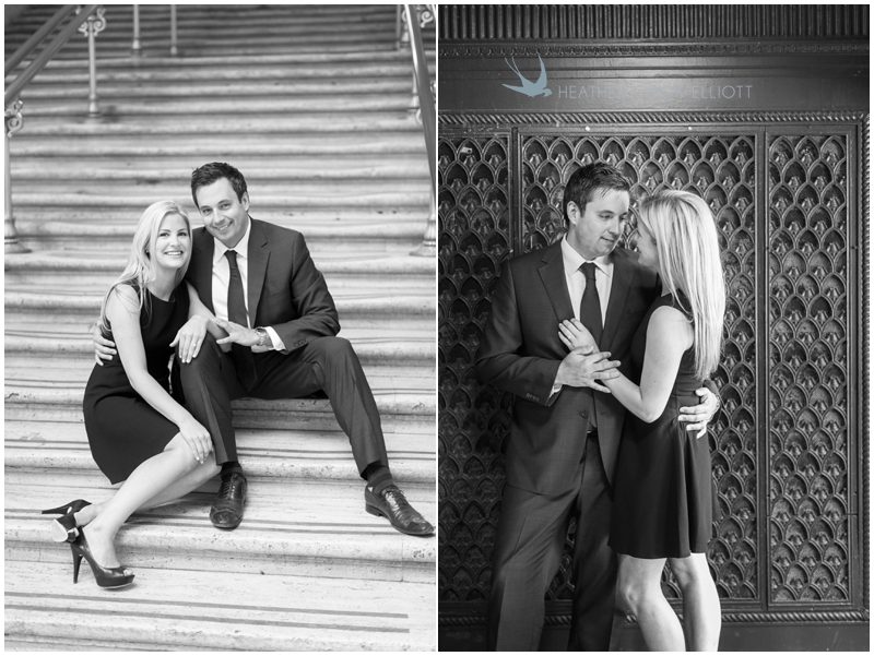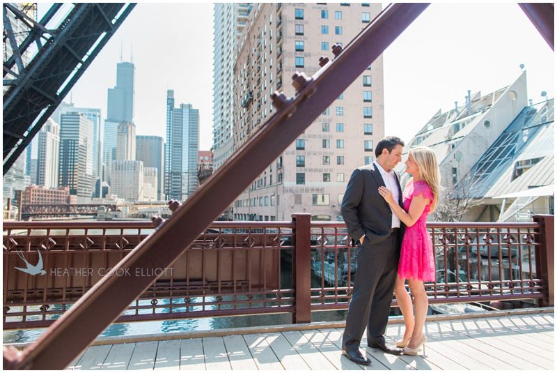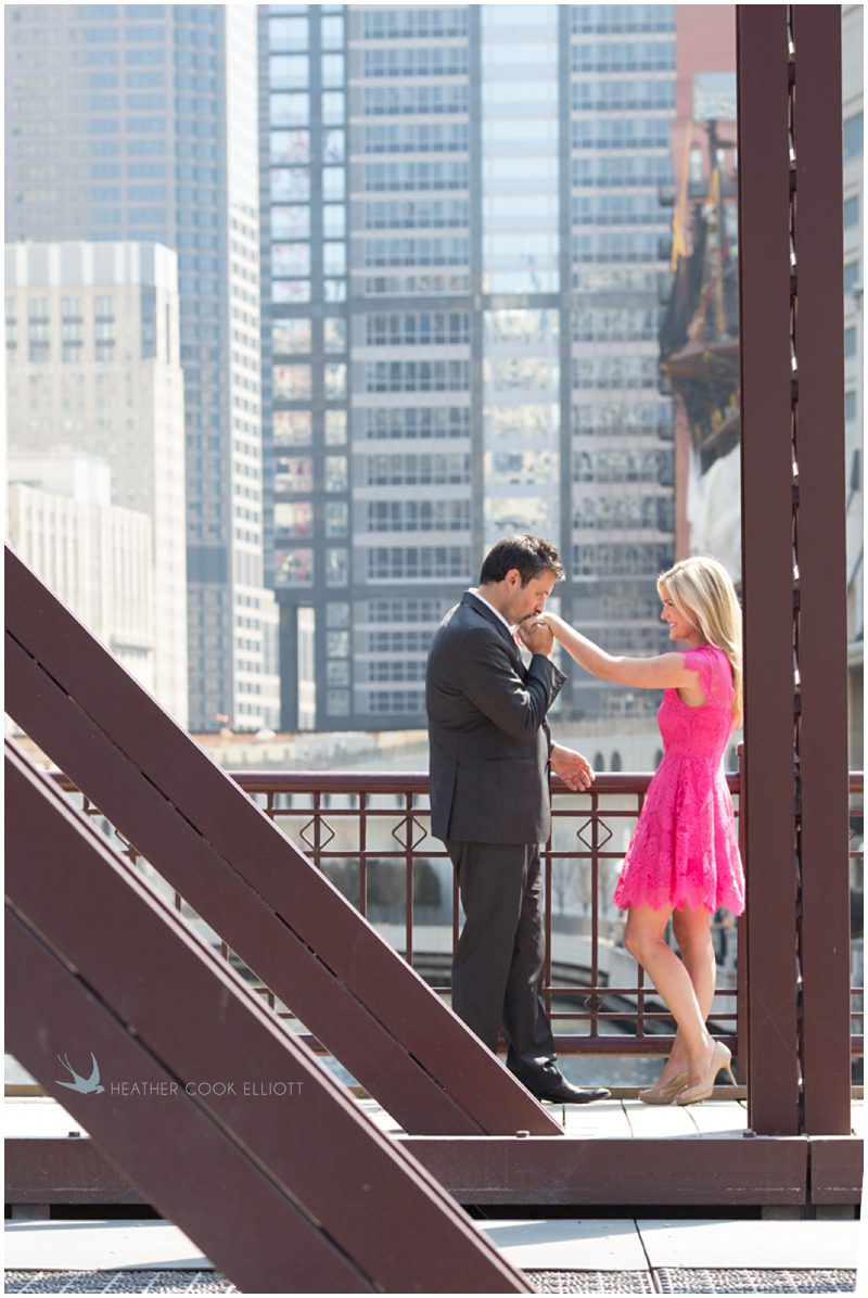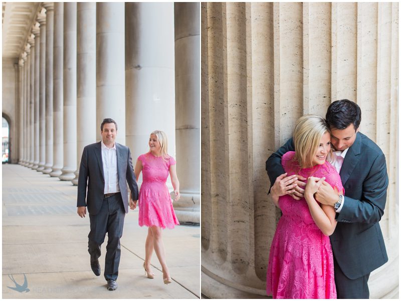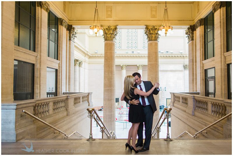 Claire & Joe met on an October evening in Chicago, were engaged on the last day of an October trip to Barcelona and will be married on an October day in Milwaukee. The fact that so many cities figure prominently in that first sentence makes complete sense as both of them love to travel and she even works in the airline industry. But for their engagement session we stayed close to their homes, in the Fulton Market District in downtown Chicago. Adorably, they live down the hall from one another in the same condo building and wile away many an afternoon discovering new places to dine and and talk and enjoy. I love the spots they chose for their session – with city views and gritty warehouse textures playing off of some serious Union Station elegance – everything clicked just right to create some truly stunning images and portrait of their life and style – urban, elegant and all about one another.