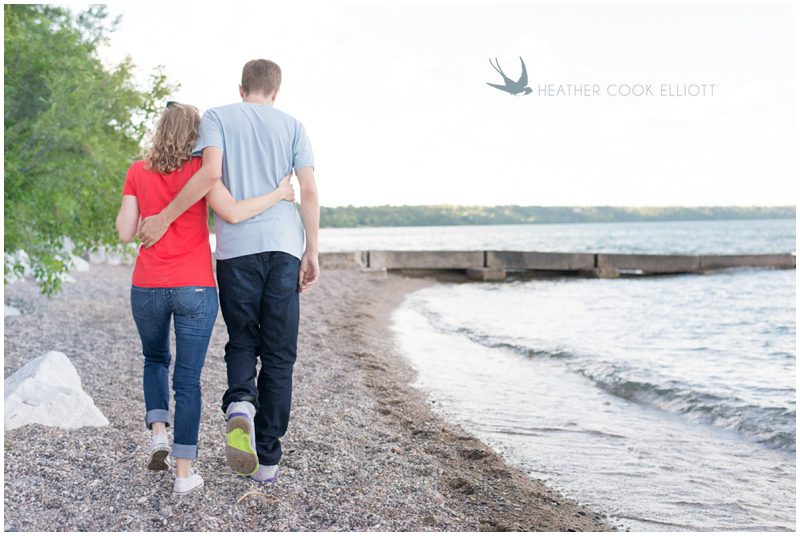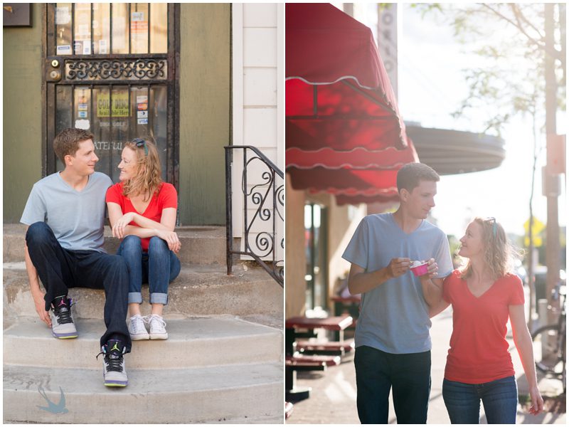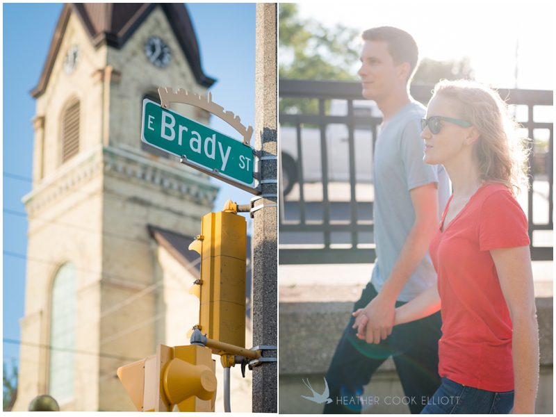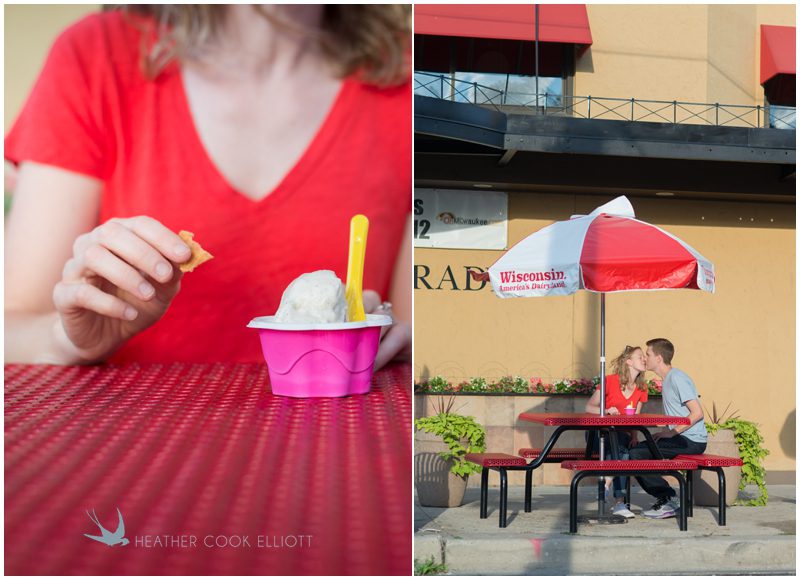 Julie & Nate are so many adjectives rolled up into two personable packages. He’s artsy and hilarious, in a quiet-dry-humor kind of way and she’s adorably sweet and big hearted but the complete opposite of a push over. Not only are they lucky enough to have found one another but also lucky enough to be a part of a tight group of friends that is thrilled to see them tie the knot. I’ve photographed a few of their group (both Jordan & Melissa and Danny & Ava), and I’ve come to know them as a collection of diverse and talented people who manage to be entertaining, authentic, reliable and totally there for one another. I believe that who your friends are is who you are. The people we surround ourselves with define us, shape us, teach us and for Nate & Julie those people rock. And this Saturday (this Saturday!) they’ll gather on a bluff overlooking Lake Michigan and toast Nate & Julie and all the good decisions they’ve made – from choosing each of their friends to choosing each other. On their wedding day everything will take place in the backyard of a beautiful house that in many ways is a second home to Julie so for their engagement session Emily suggested they meander a bit farther to explore the spaces and places of the city they love. They started at Big Bay and ended on Brady Street, managing to find gelato and tire swings along the way. I’ll add fun and unexpected to their list of adjectives.