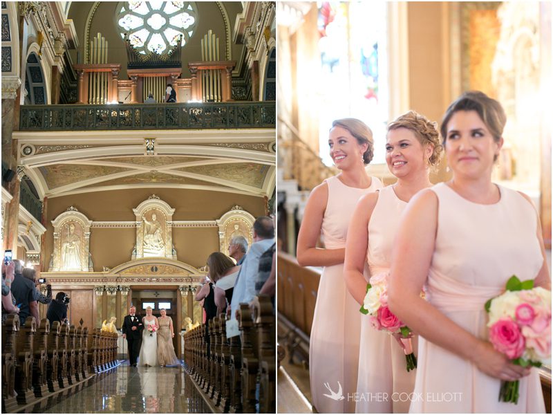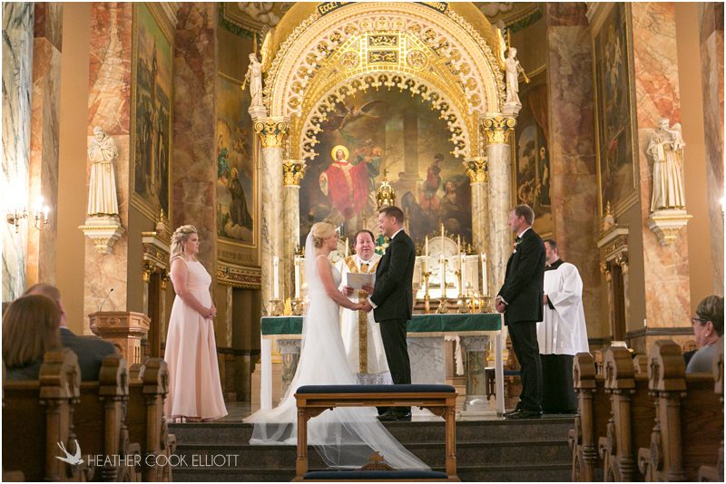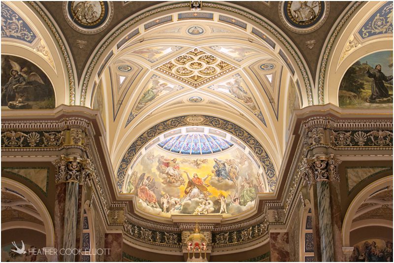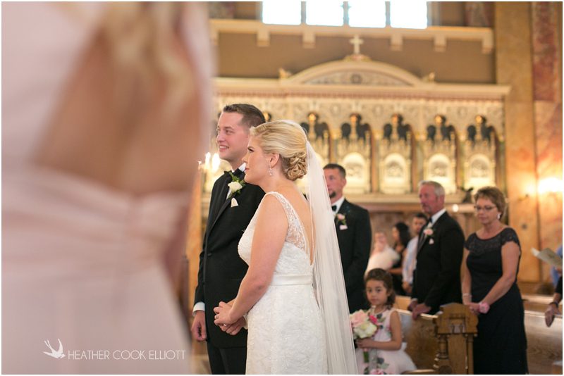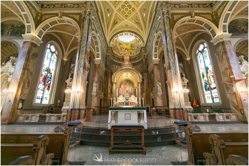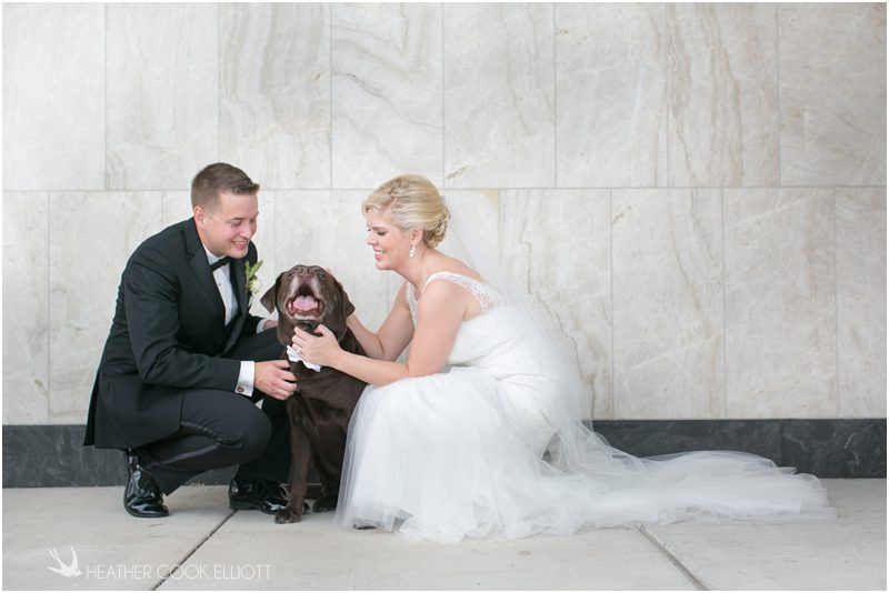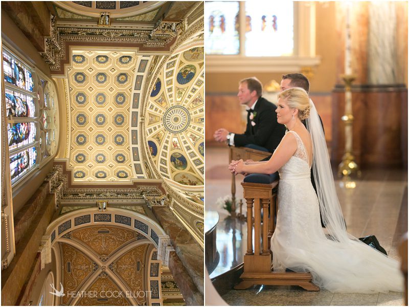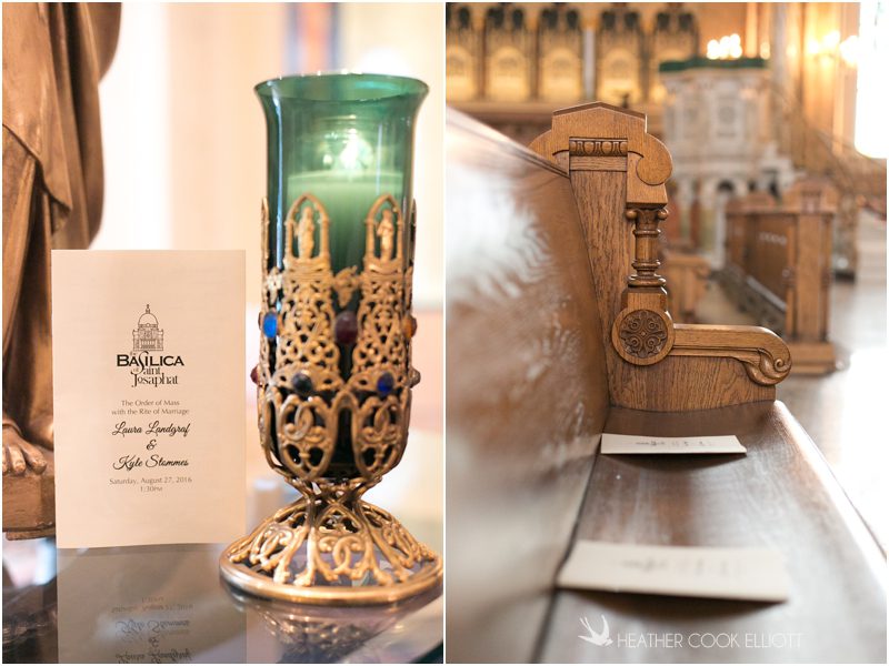 Laura & Kyle are intriguing to me. They are nice and cute and sweet and all that jazz, but if one chats with them long enough little tidbits about their lives come up in conversation and it’s as if the real them sort of emerges from the easy, pretty picture. And, I must say, knowing that he a veteran and she rides horses and they were long distance loves for years makes the picture seem just that much more beautiful. But as surprising as they they are to me it was no surprise that their wedding day was fresh and bright, a little sparkly and a lot romantic, the perfect compliment to their personalities and an exquisite blend of the two of them. I loved the contrasts between their gilded Basilica wedding and their modern War Memorial reception; how their beloved dog Moose joined them on the patio while guests gazed at the lake; how they were surrounded by hundreds but only saw each other.