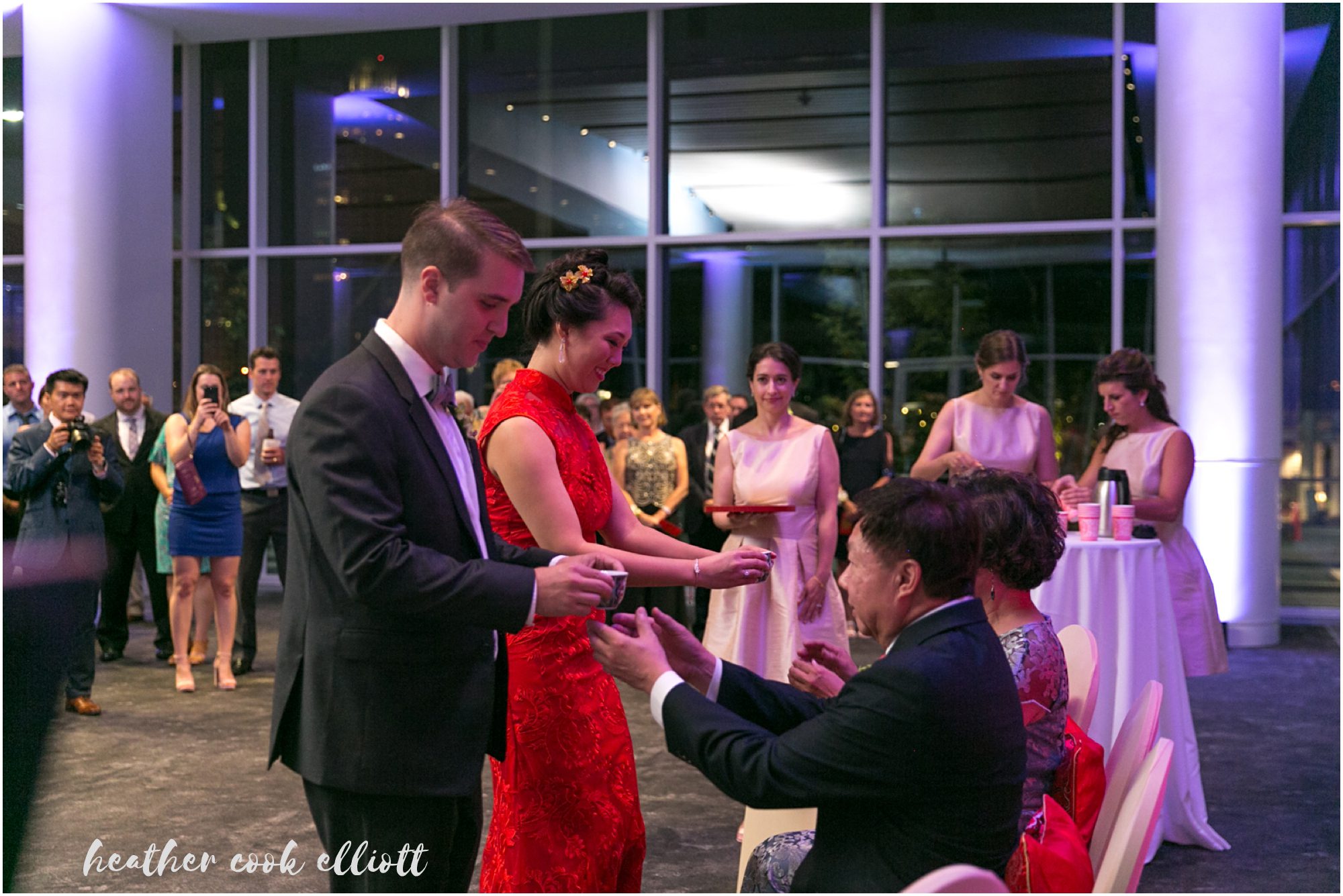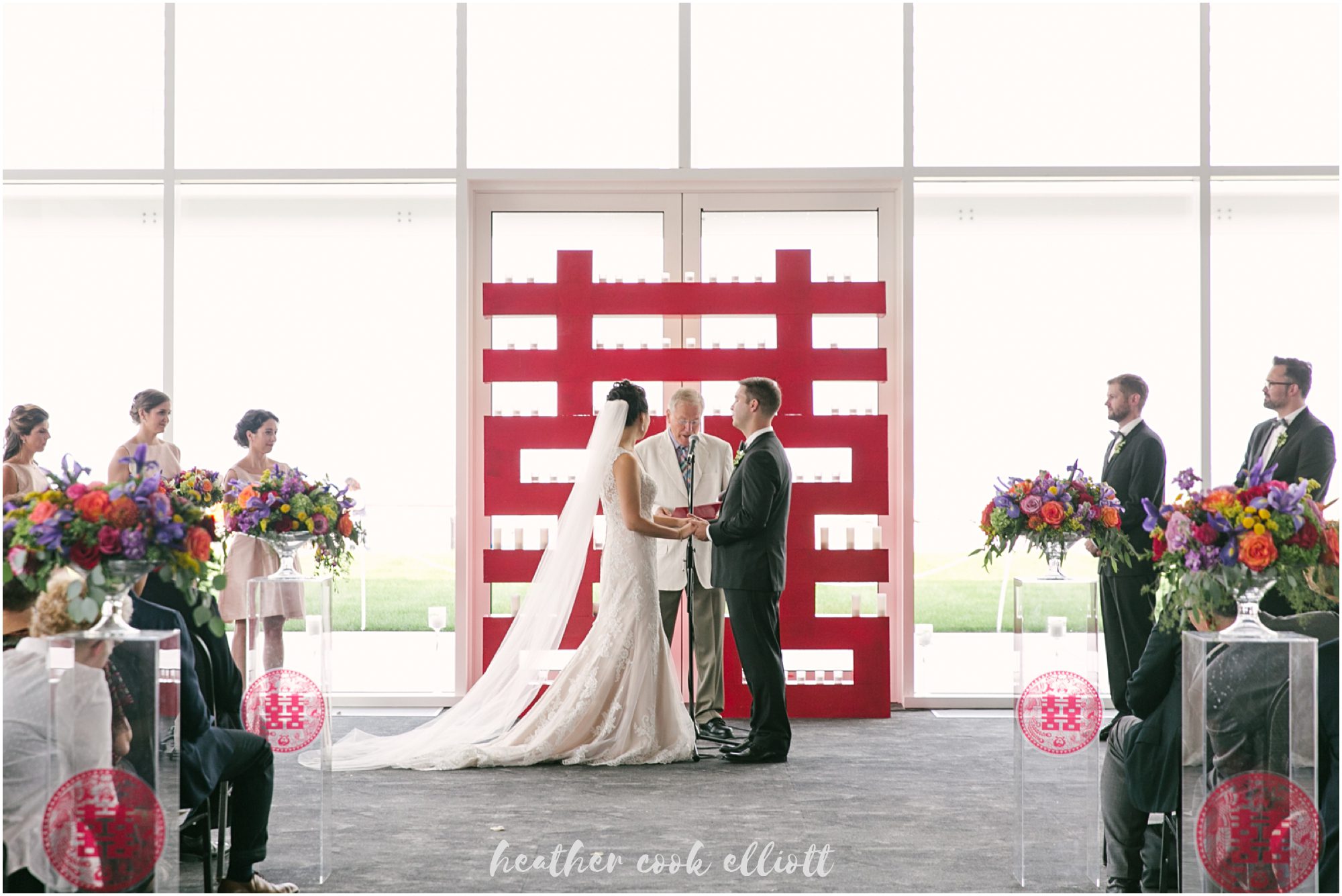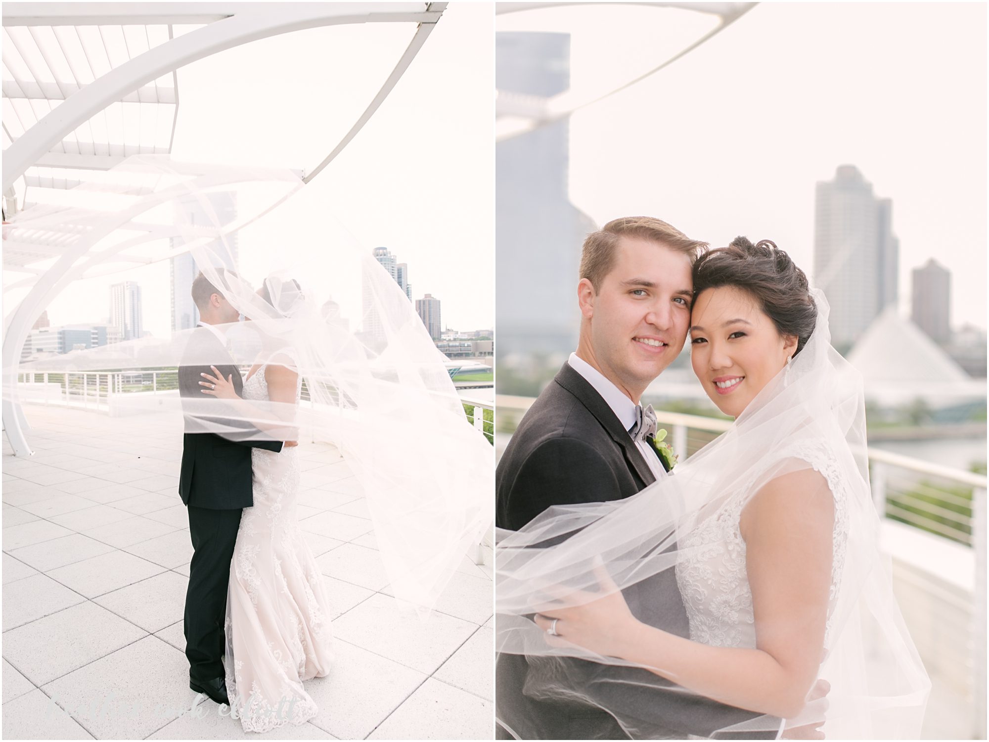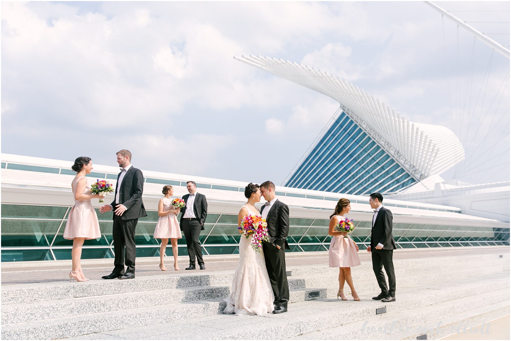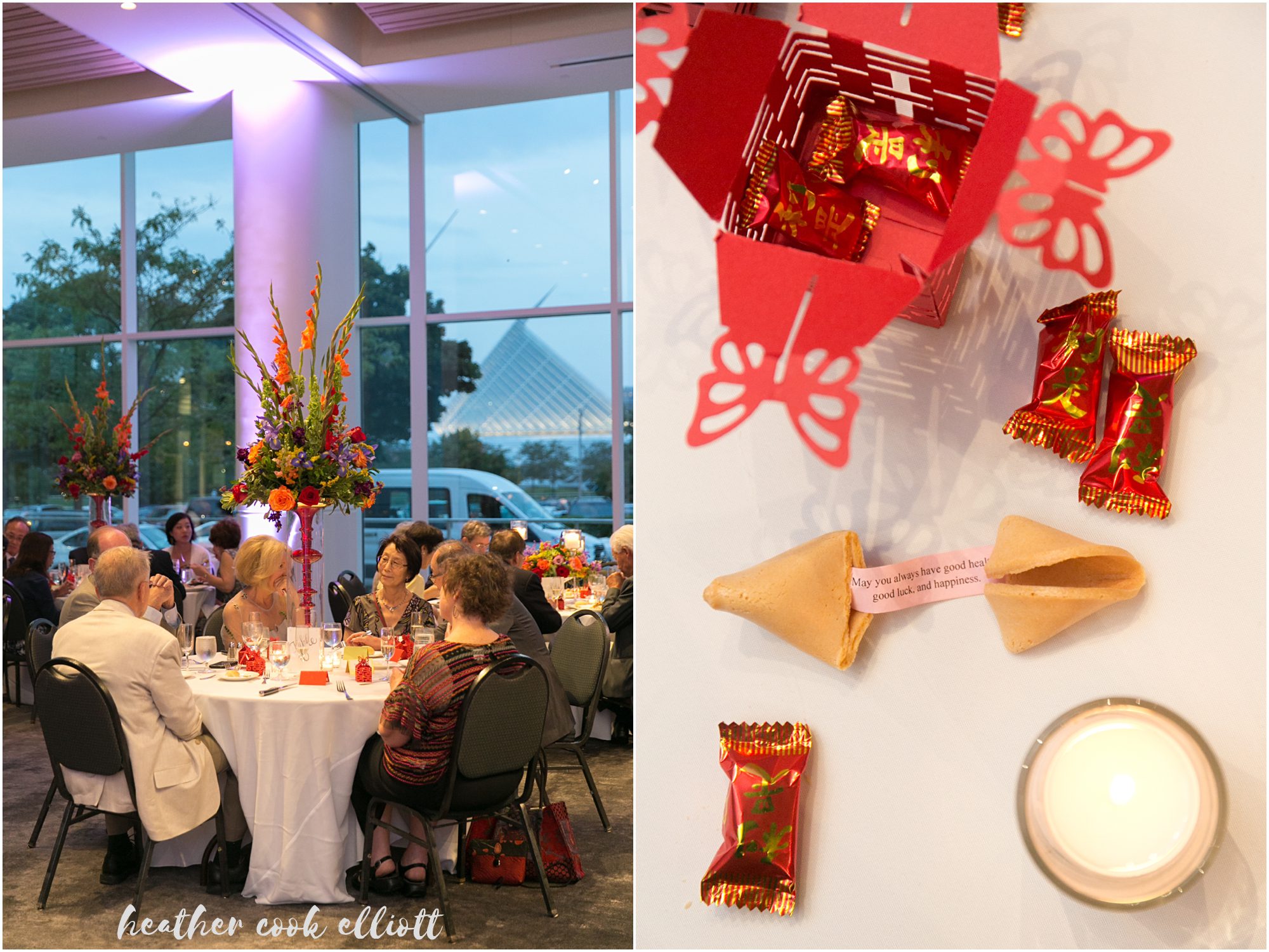Emily & Jack’s lakeside wedding day was an entirely elegant affair with a laid back Sunday afternoon vibe. We loved all of their completely personal details – from their choice of officiant to their evening tea ceremony, Emily & Jack imbued their day with history, meaning, and loveliness. They started the day just steps from Milwaukee’s lakefront at the Westin and along with their small bridal party they made time to enjoy the lake views and Milwaukee’s cityscape before tying the knot at Discovery World’s new glassy Lakefront Pavilion. With an armful of the most colorful, gorgeous flowers we’ve seen all summer, Emily said I Do to Jack and Jack said I Do to Emily and from there the celebration erupted in earnest. As the sun set over the lake they danced and toasted guests at each table, cracking open custom Emily & Jack fortune cookies. Together with parents, aunts and uncles, they performed a traditional tea ceremony in front of a custom Double Happiness sculpture and every guest in attendance could be seen smiling from ear to ear. Emily & Jack – as the cookies wished us: May you always have good health, good luck and happiness!