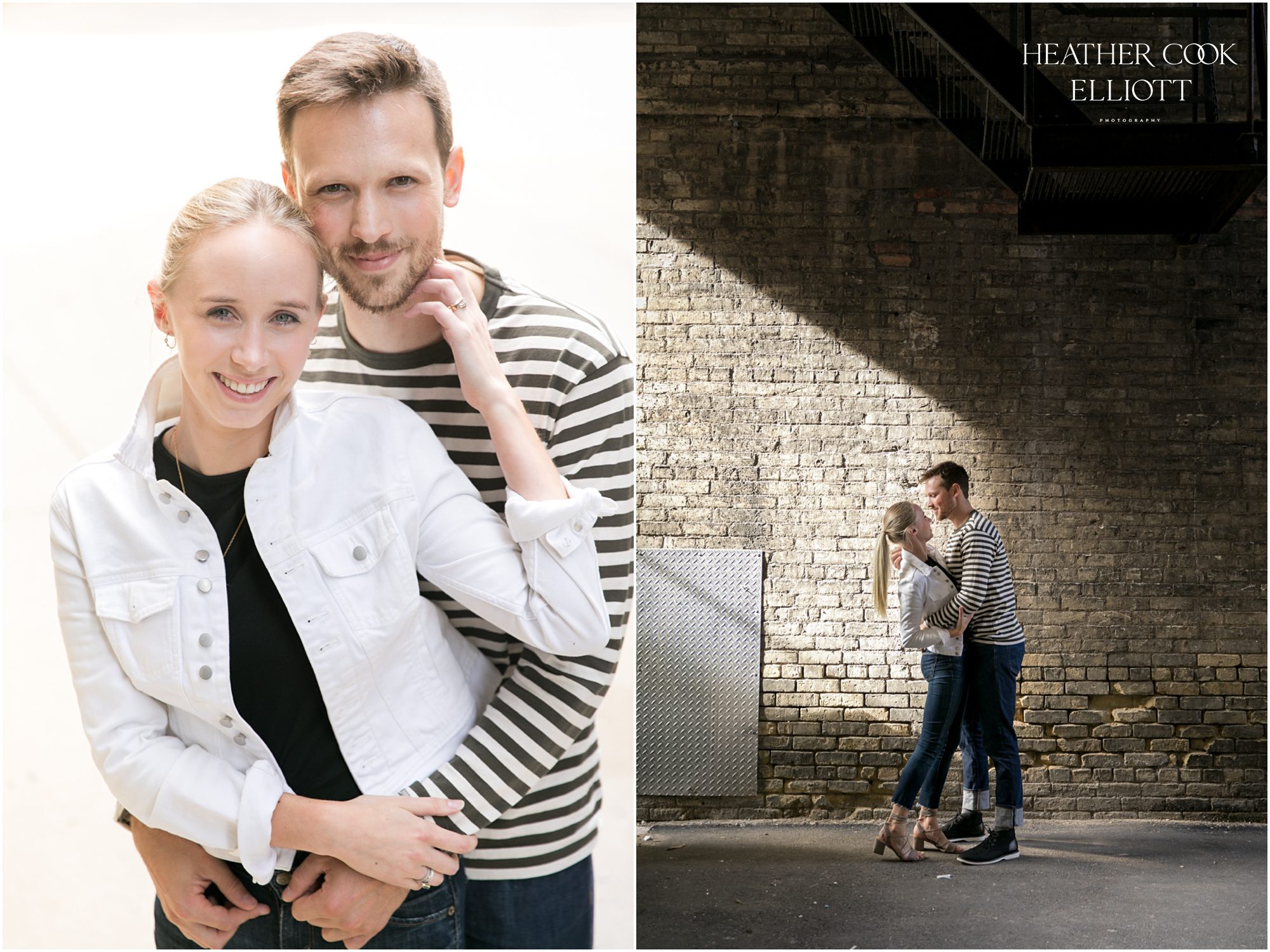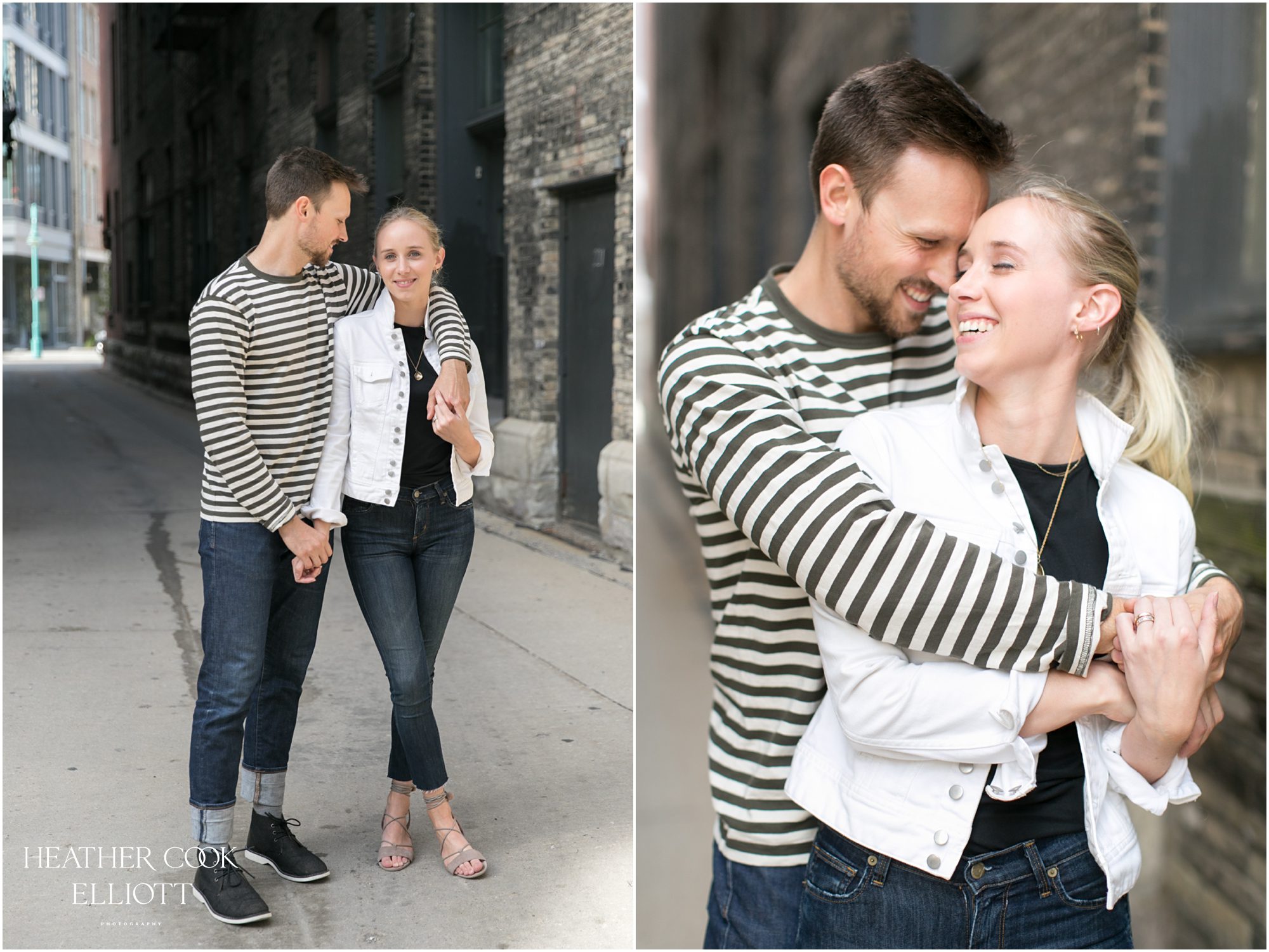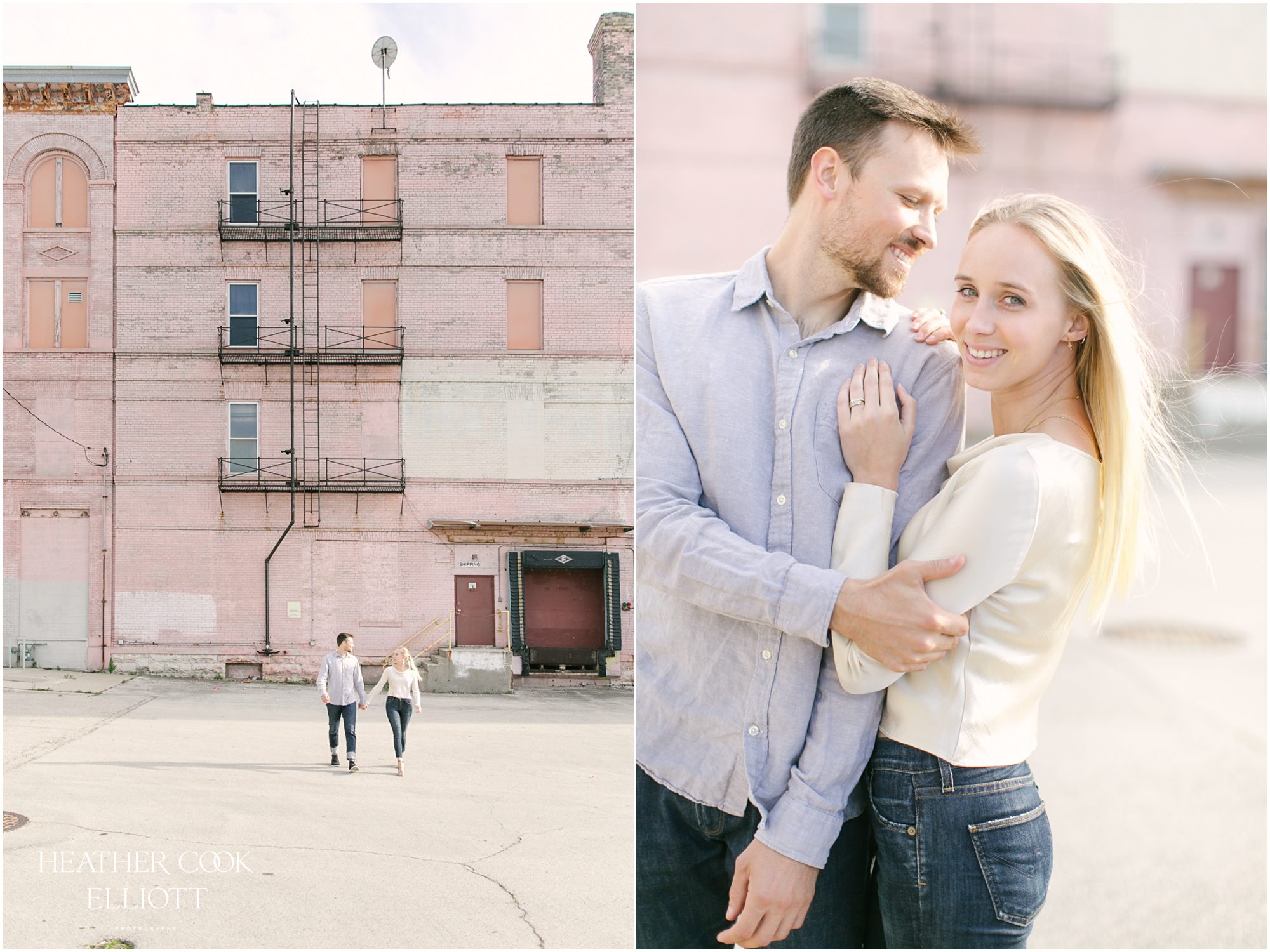 Eleanor & Joe live in Maine and are planning a winter wedding for 2020, two facts about them that make me think of snow and the need to wrap oneself in something warm (your best friend and fiance’s arms being the most recommended.) But their dispositions and sweet smiles bring sunshine and warmth to mind so I was thrilled we were able to plan a golden hour engagement session for them during their travels back to Milwaukee for wedding festivities. So with the late summer sun warming our skin we wandered the city they used to call home. They shared little bits about their lives and histories that made me like them all the more – from Eleanor’s wish for a “wedding ring” made up of estate rings (they are gorgeous and stacked and she can’t wait to get the third one on her finger come the wedding day) to Joe’s dancing skills (his grandmother was a dancer and dance teacher.) They snuggled and danced and just let me see them be together and it felt like a gift. Happy engagement Eleanor & Joe; we can’t wait to be there for the big day when you (officially) become one another’s.