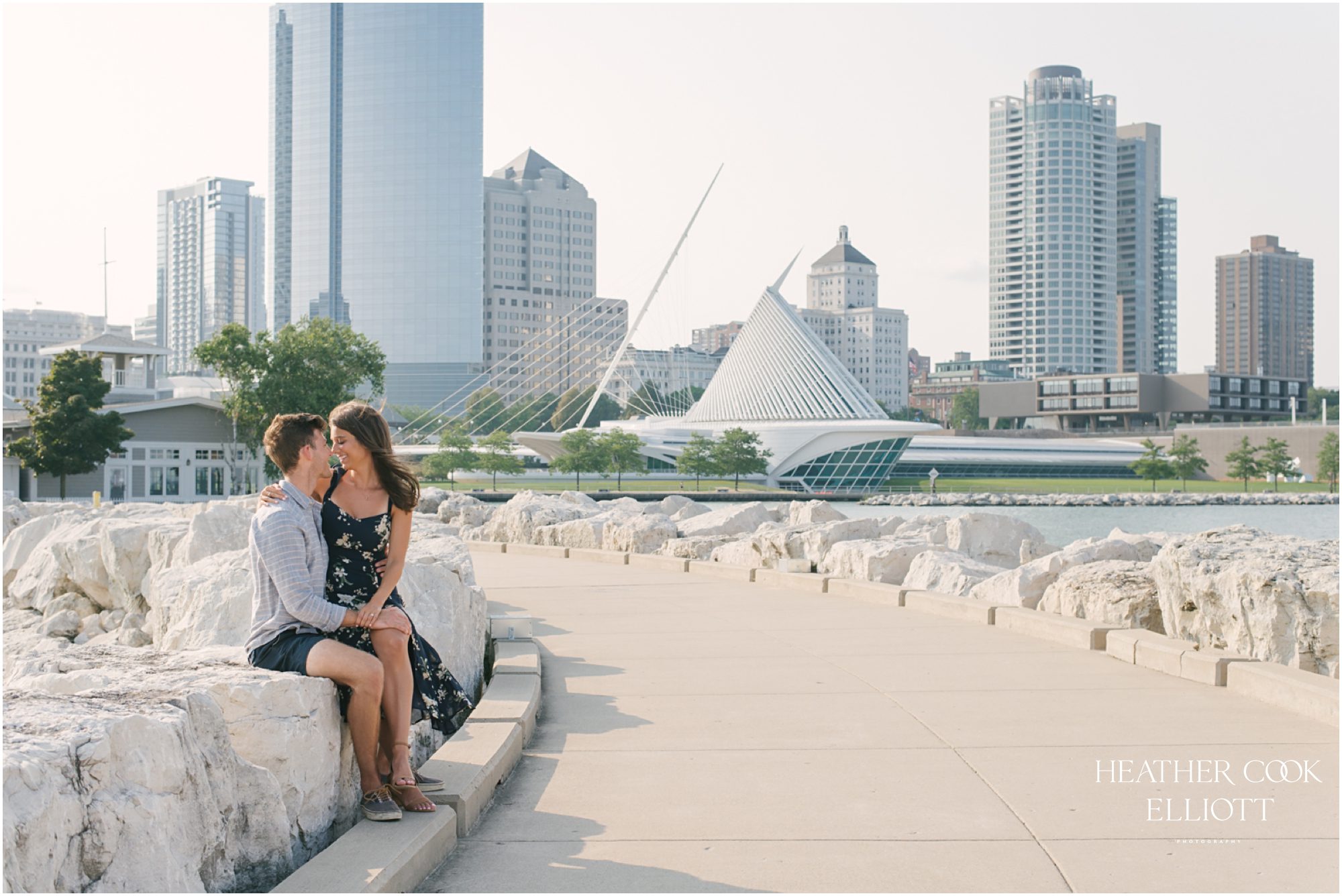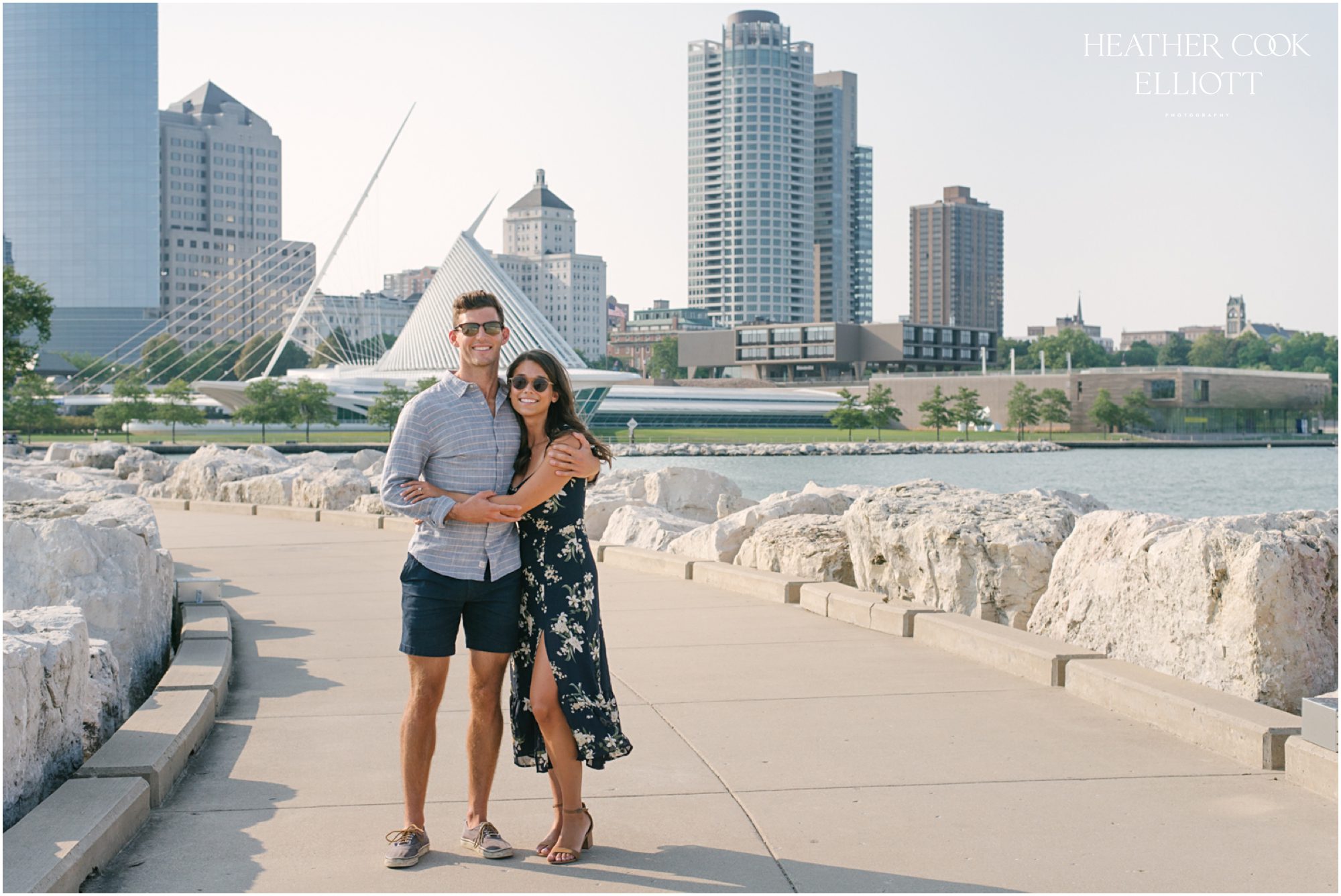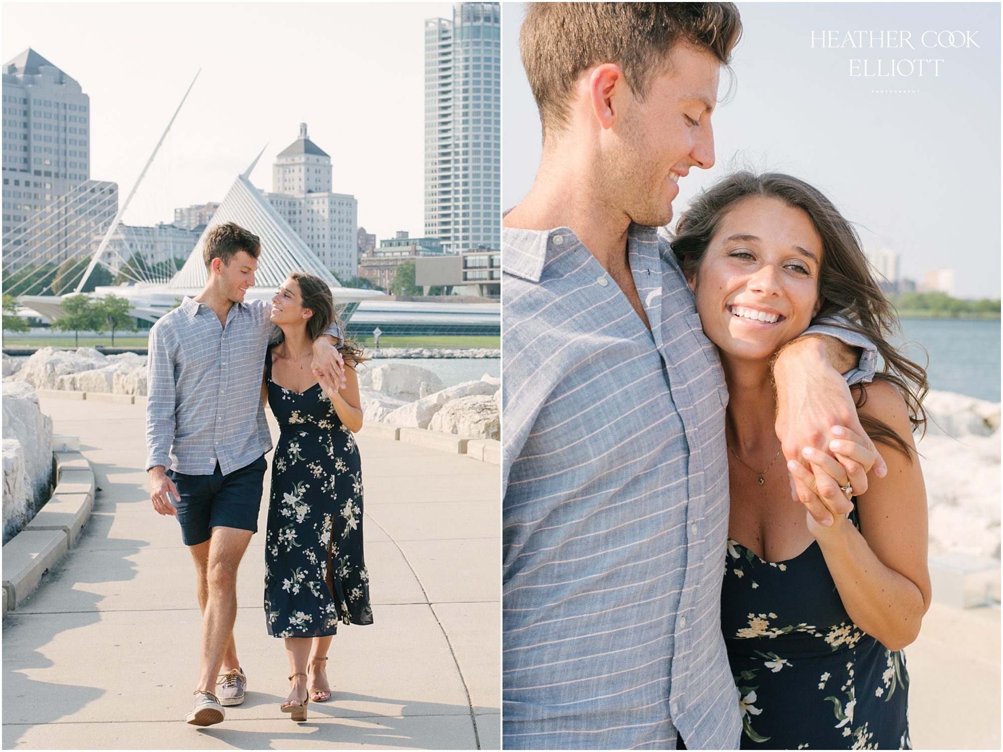 Gina & Kevin have one of those meandering love stories that practically requires a map and a white board to follow along. They touch down in Florida and Wisconsin, Indiana and New Jersey, and right now, well, they live in San Francisco. As a kind of middle ground and nod to the time of life when they met, Milwaukee will be home to their 2021 wedding and for awhile this summer they were here, too. Kevin went to Notre Dame and Gina Marquette, so each time they visit Milwaukee it’s a little like discovering a new city and a little like coming home. For their engagement session along the lakefront on a brilliant August day the city played up its charms with the bluest sky and a bevy of sail boats, sunshine for the entire thing and oh yes, a snappy wind that played with Gina’s hair. It was simple and carefree and best of all, oh-so-lovely ~