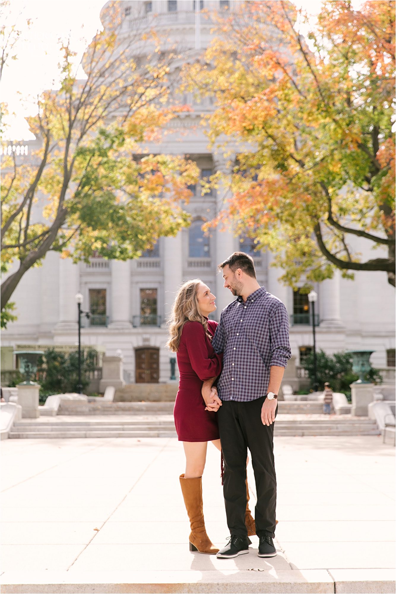 The leaves have been hanging on longer than expected this year in Wisconsin and Karley & Jake made the most of this fact, choosing to meet me for the first time in their beloved Madison on a perfect fall day. They claimed to be nervous about the whole thing, but two steps and 10 clicks in and I forgot to believe them because these two are just so dang perfect together. Karley has an incredible energy that often manifests as a huge smile, but can also be seen by the pep in her step whenever she looks at Jake. He clearly adores her, too and his whole demeanor brightens up whenever she wraps her arms around him. So if you need a dose of sunshine today you can find it here, as Karley & Jake meander by the capital and out to Picnic Point. It’s all sweet and a little sassy, and totally, wholly lovely.