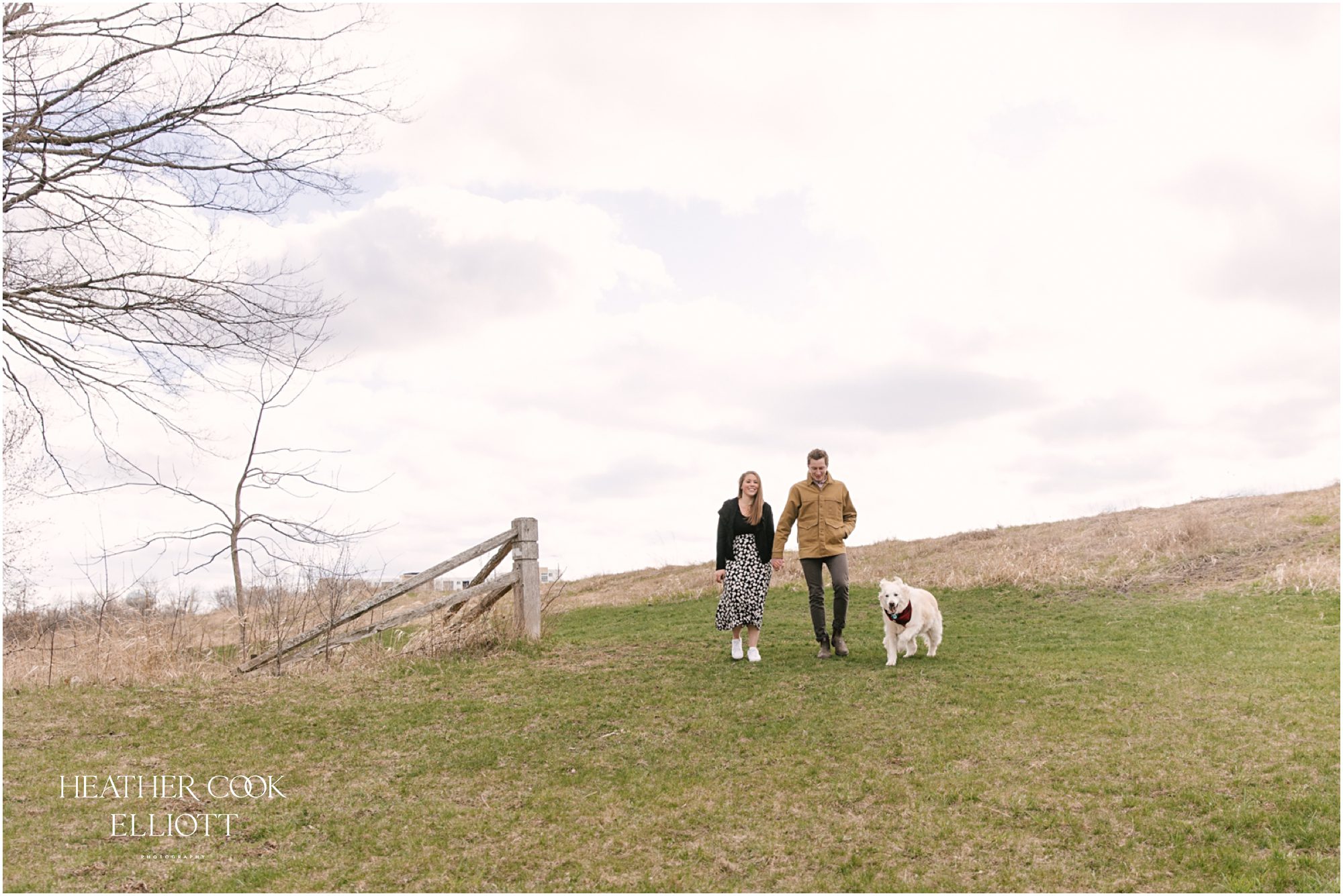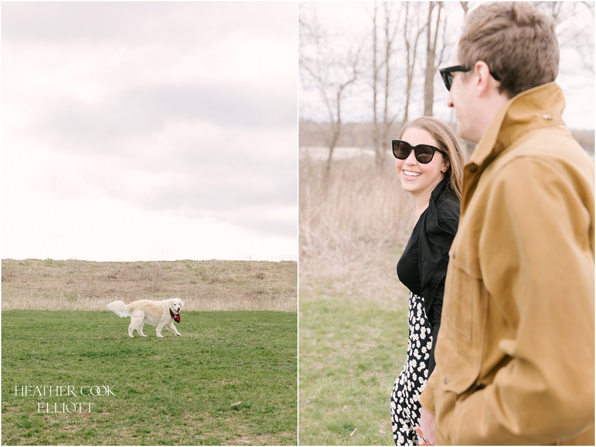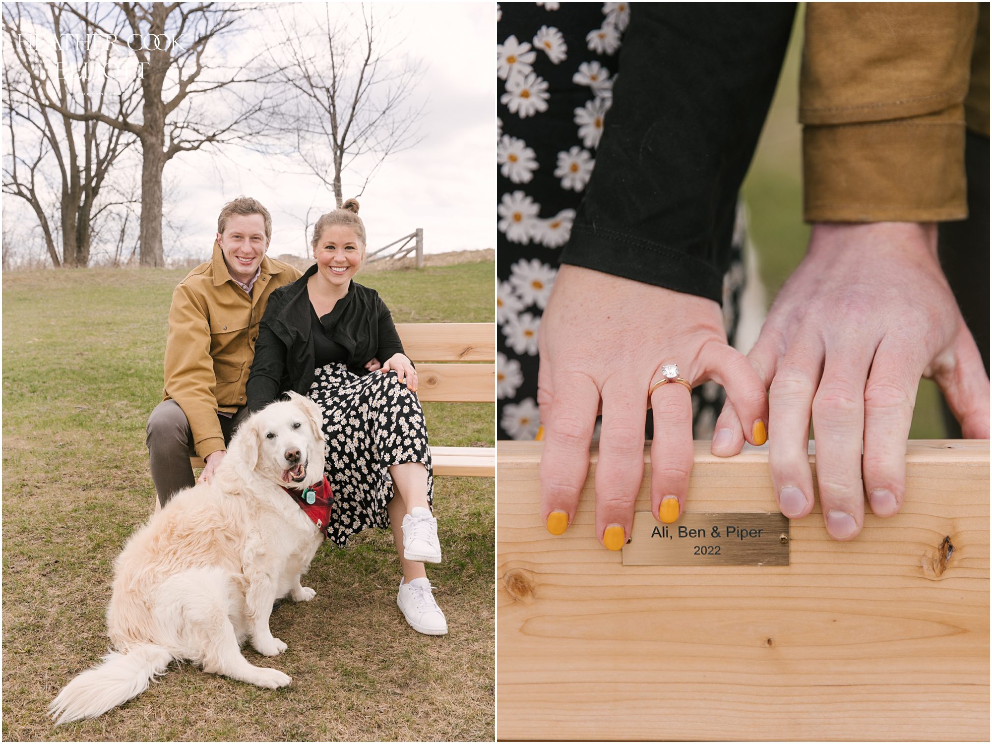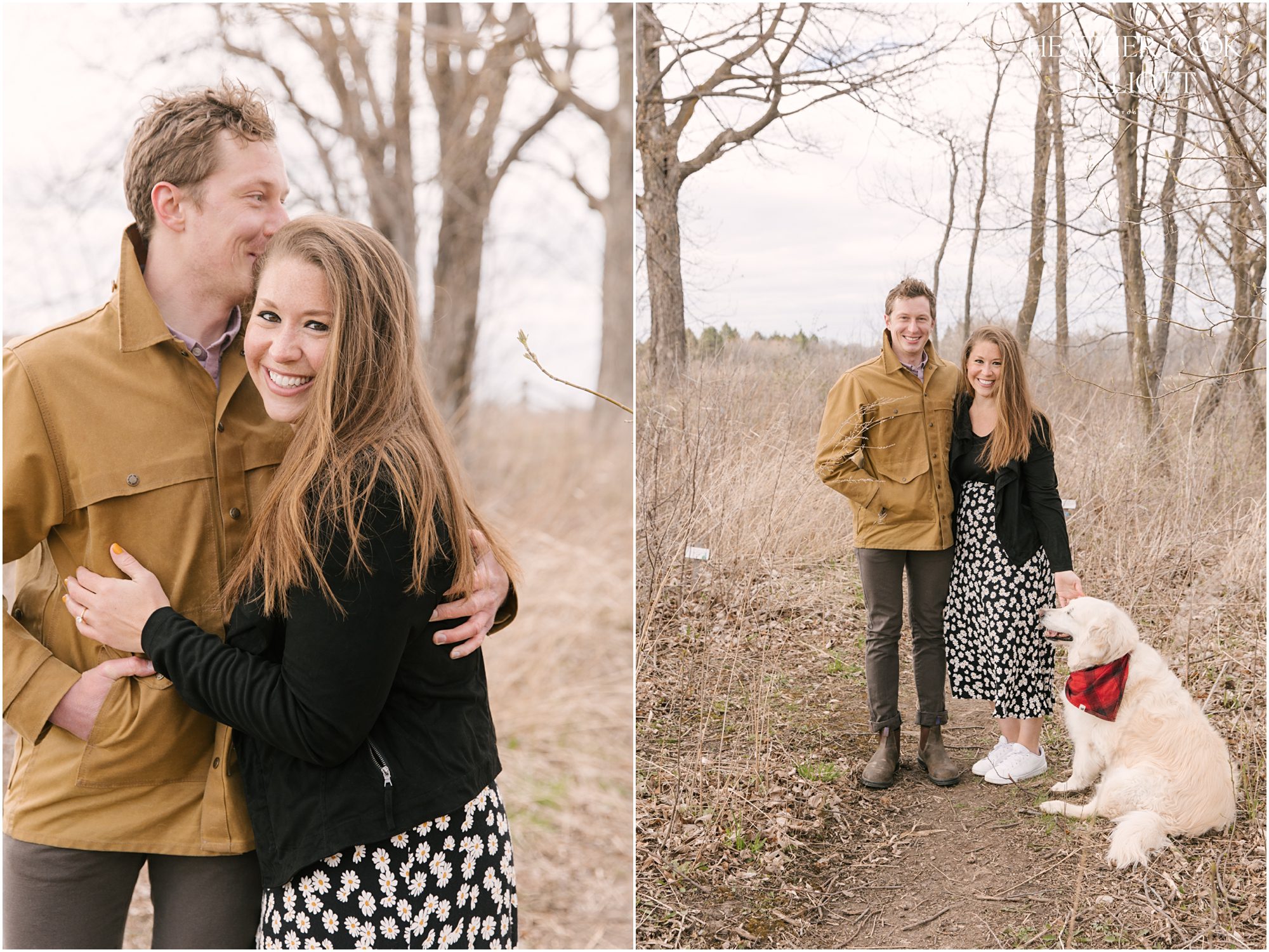 For their engagement session Ali & Ben invited me out for dog walk with their favorite furry friend Piper. It was crisp and cool, but their smiles and 10 year old Piper’s playful energy kept us laughing and just a touch warmer than expected. We meandered through the grasslands and woods of an area that is special to all three of them: to Piper its where the best dog walks happen (lots of sticks!) and to Ali & Ben its where Ben proposed (and debuted his skill as a woodworker with a custom bench he crafted himself!) So let’s take a walk and meet them; Piper is leading the way.