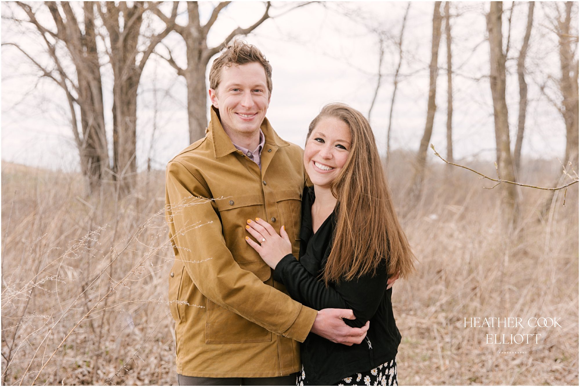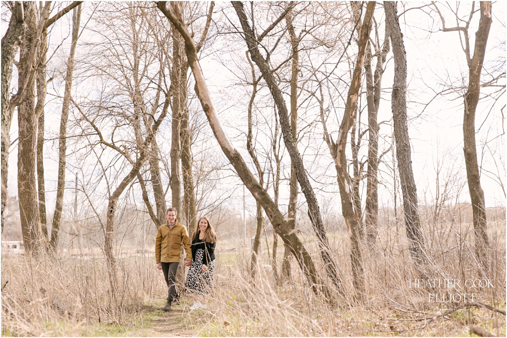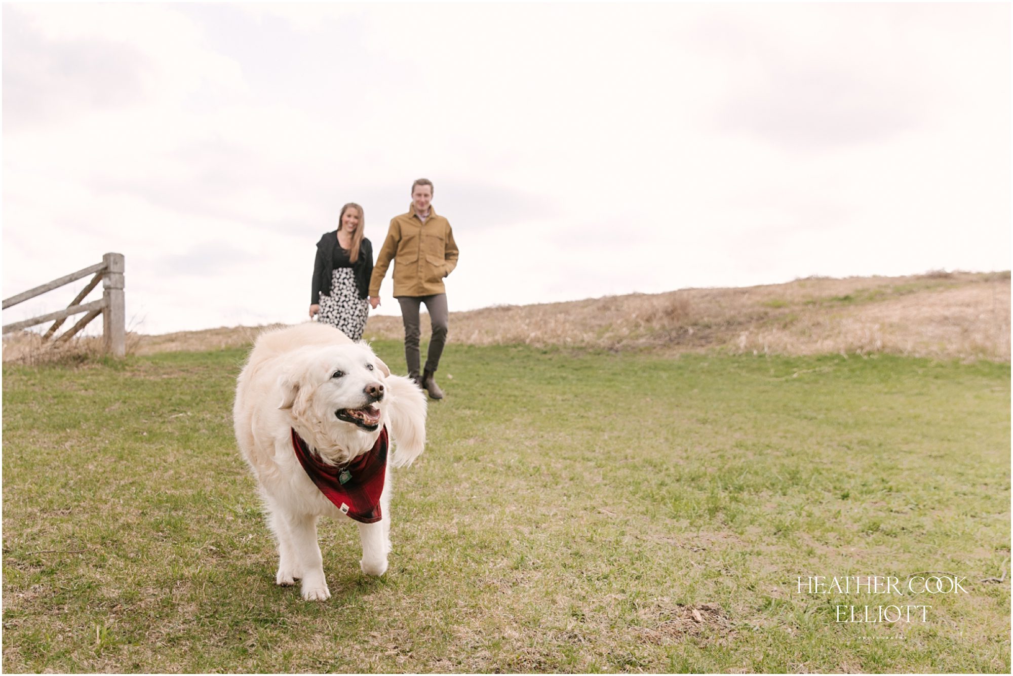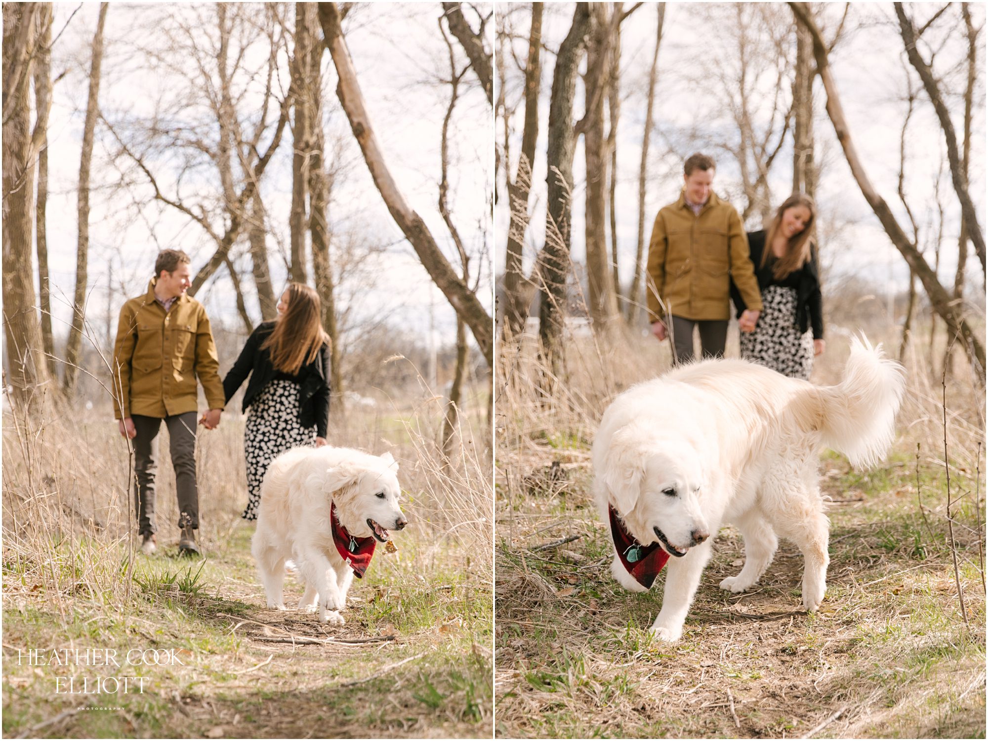 For their engagement session Ali & Ben invited me out for dog walk with their favorite furry friend Piper. It was crisp and cool, but their smiles and 10 year old Piper’s playful energy kept us laughing and just a touch warmer than expected. We meandered through the grasslands and woods of an area that is special to all three of them: to Piper its where the best dog walks happen (lots of sticks!) and to Ali & Ben its where Ben proposed (and debuted his skill as a woodworker with a custom bench he crafted himself!) So let’s take a walk and meet them; Piper is leading the way.