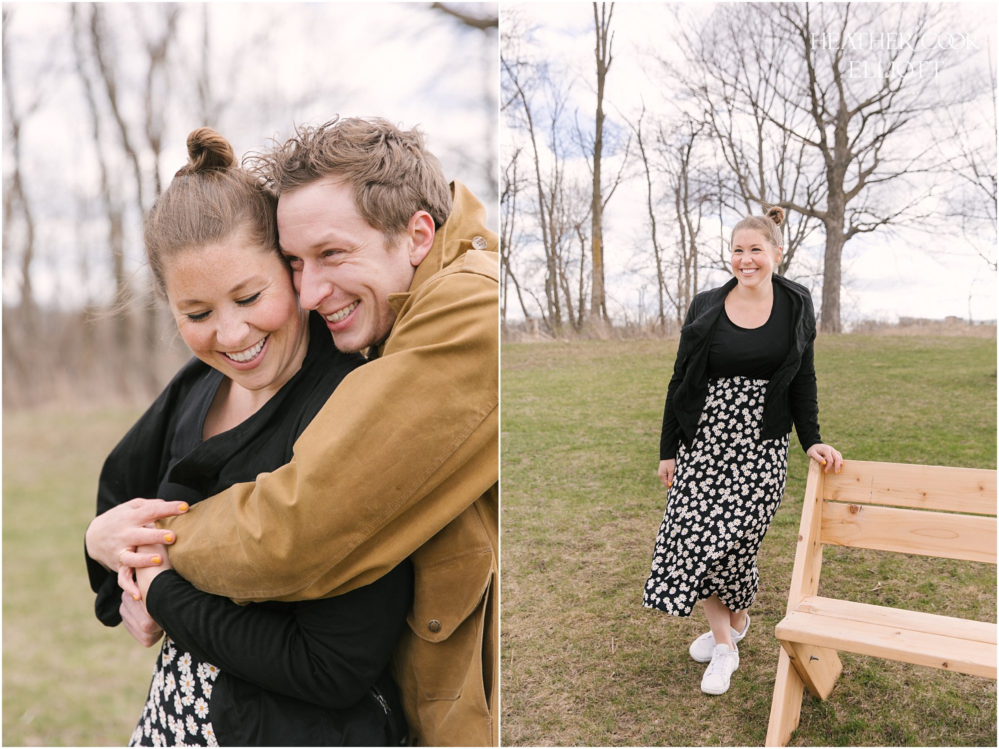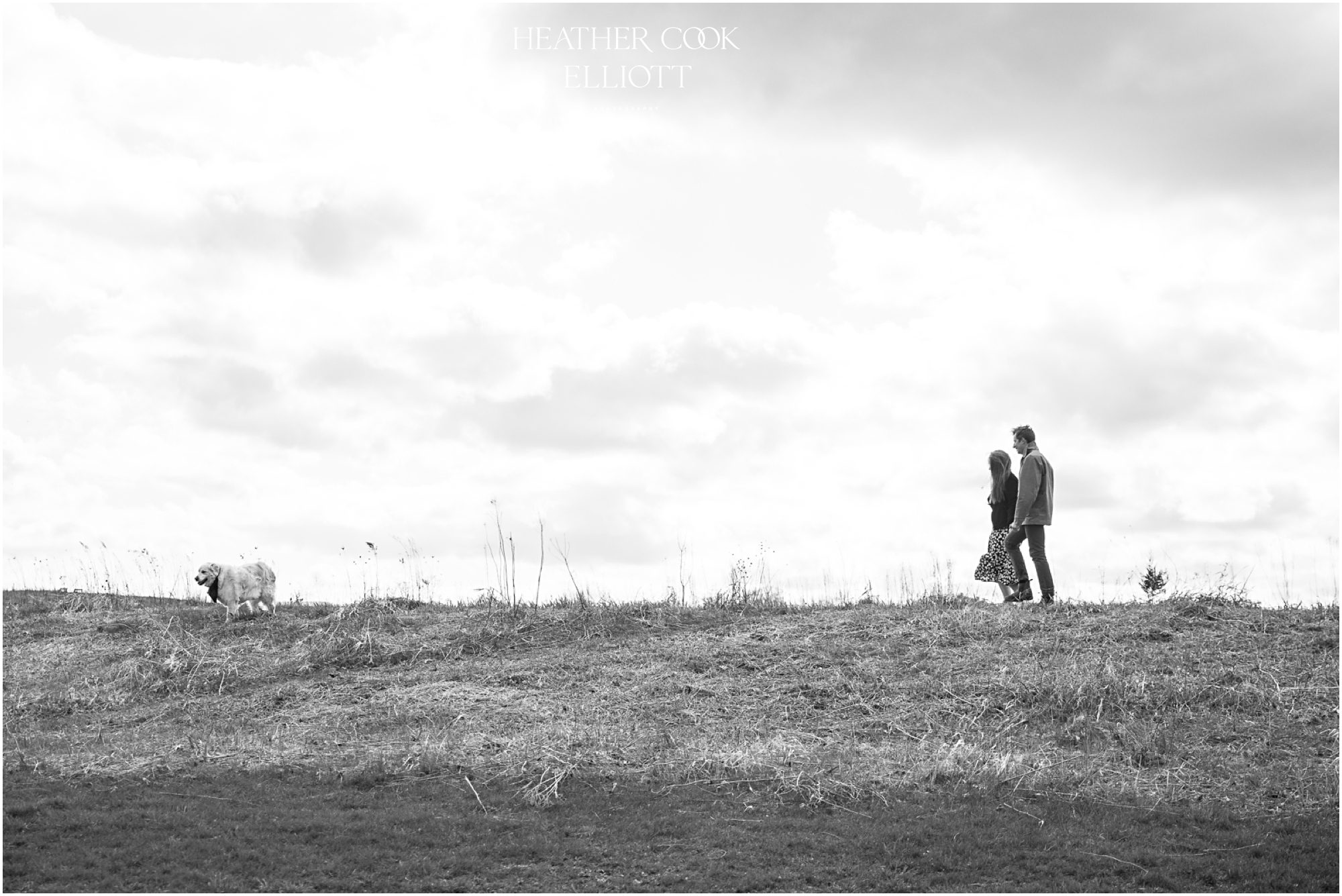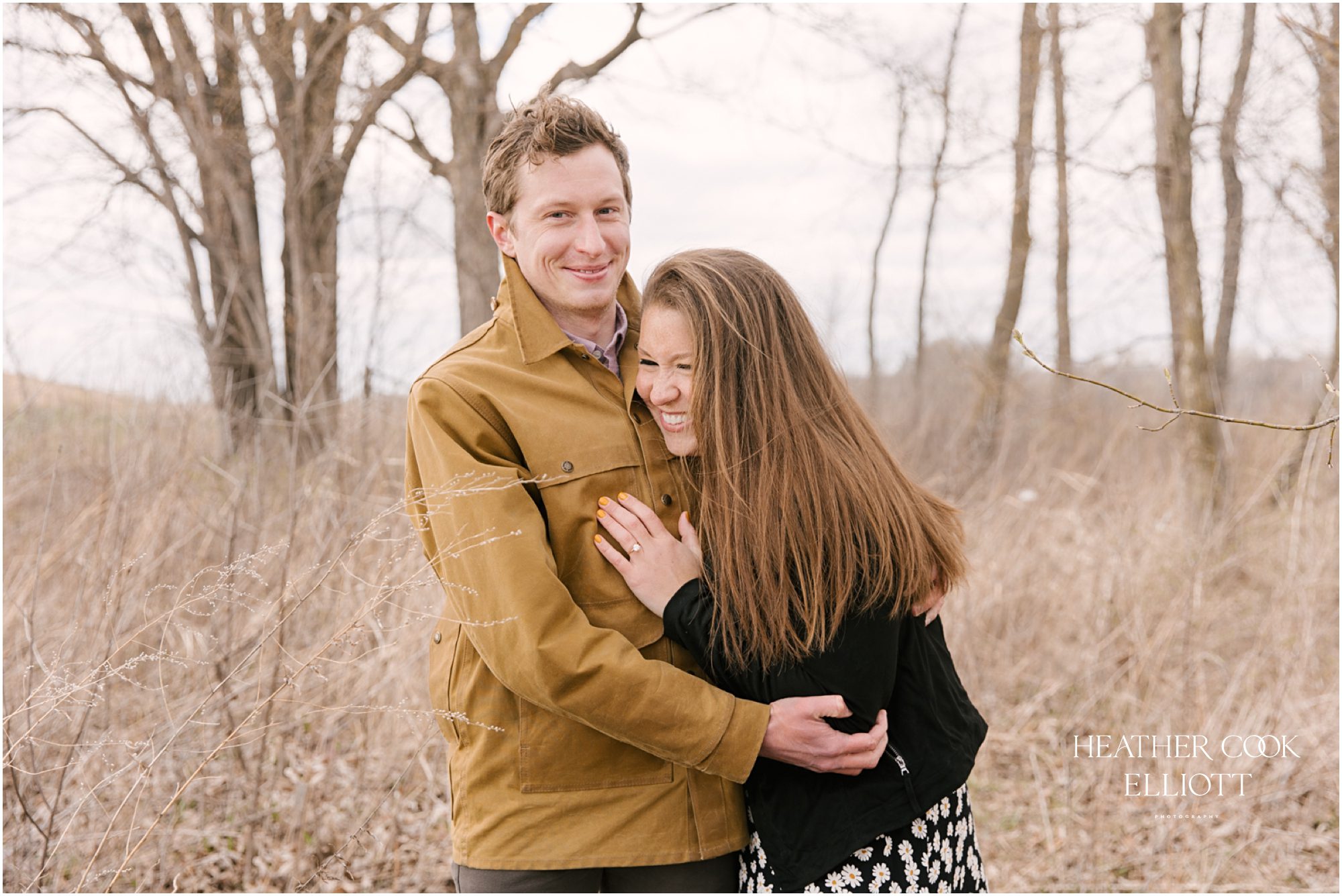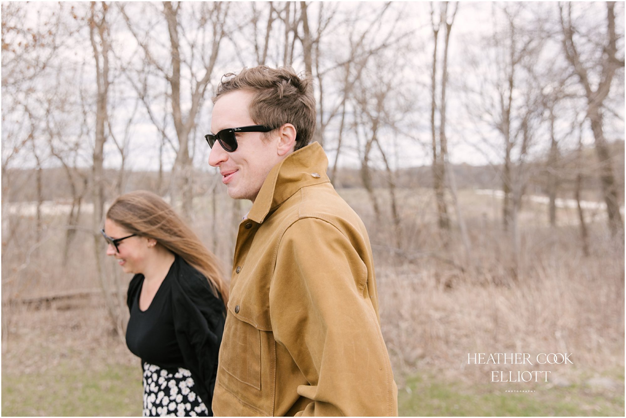 For their engagement session Ali & Ben invited me out for dog walk with their favorite furry friend Piper. It was crisp and cool, but their smiles and 10 year old Piper’s playful energy kept us laughing and just a touch warmer than expected. We meandered through the grasslands and woods of an area that is special to all three of them: to Piper its where the best dog walks happen (lots of sticks!) and to Ali & Ben its where Ben proposed (and debuted his skill as a woodworker with a custom bench he crafted himself!) So let’s take a walk and meet them; Piper is leading the way.