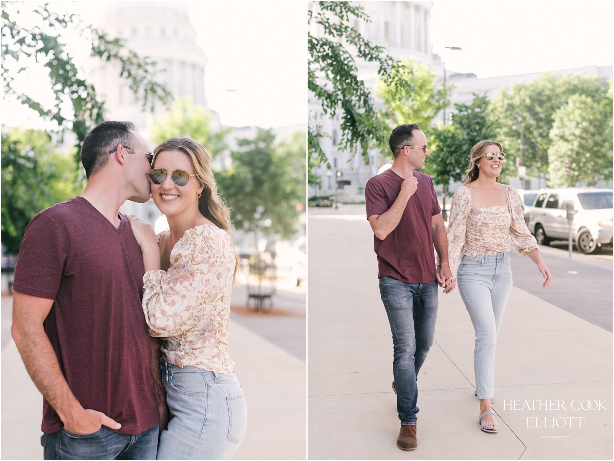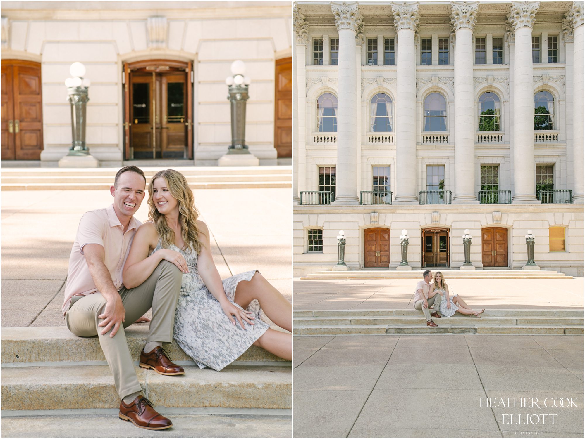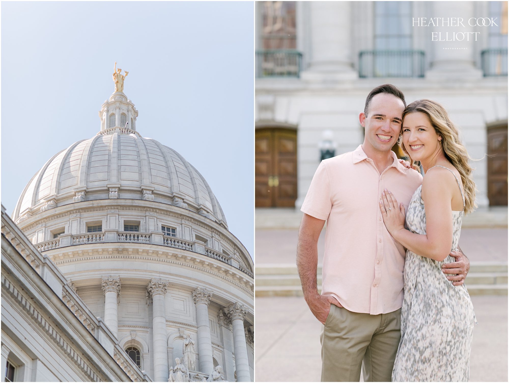 It is a pretty common theme among engaged couples that they not only plan a wedding but they pair that with buying a house, or getting a new job, or moving to a new city. But Delanee and Andrew have taken that common theme to a new level by doing all of those things while planning a wedding. In fact, this engagement session was shot in Madison on the day they sold their house just before they moved to St Louis for Andrew to start a dream job and both of them to close on a new house. Huzzah, indeed! They love Madison and will miss it dearly (and especially Lake Monona where they have been known to spend many an hour on boating) but there is an air of excitement about them and on this day that giddy, life-is-full-and-exciting atmosphere buzzed between them and right into the camera for these gorgeous shots at the iconic capital building and surrounds. So get ready to enjoy some laughter and sunshine; these two are irresistibly in love.