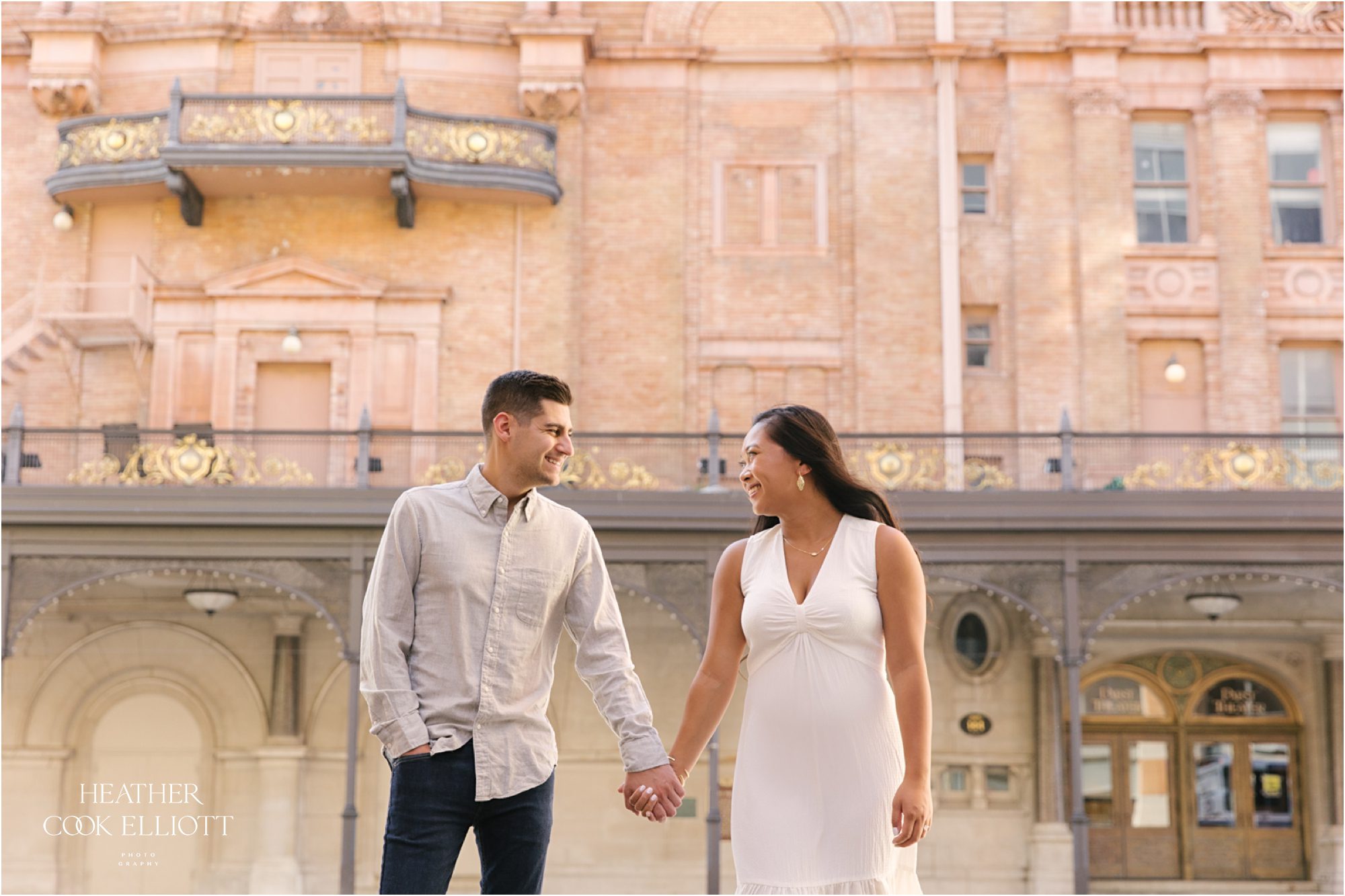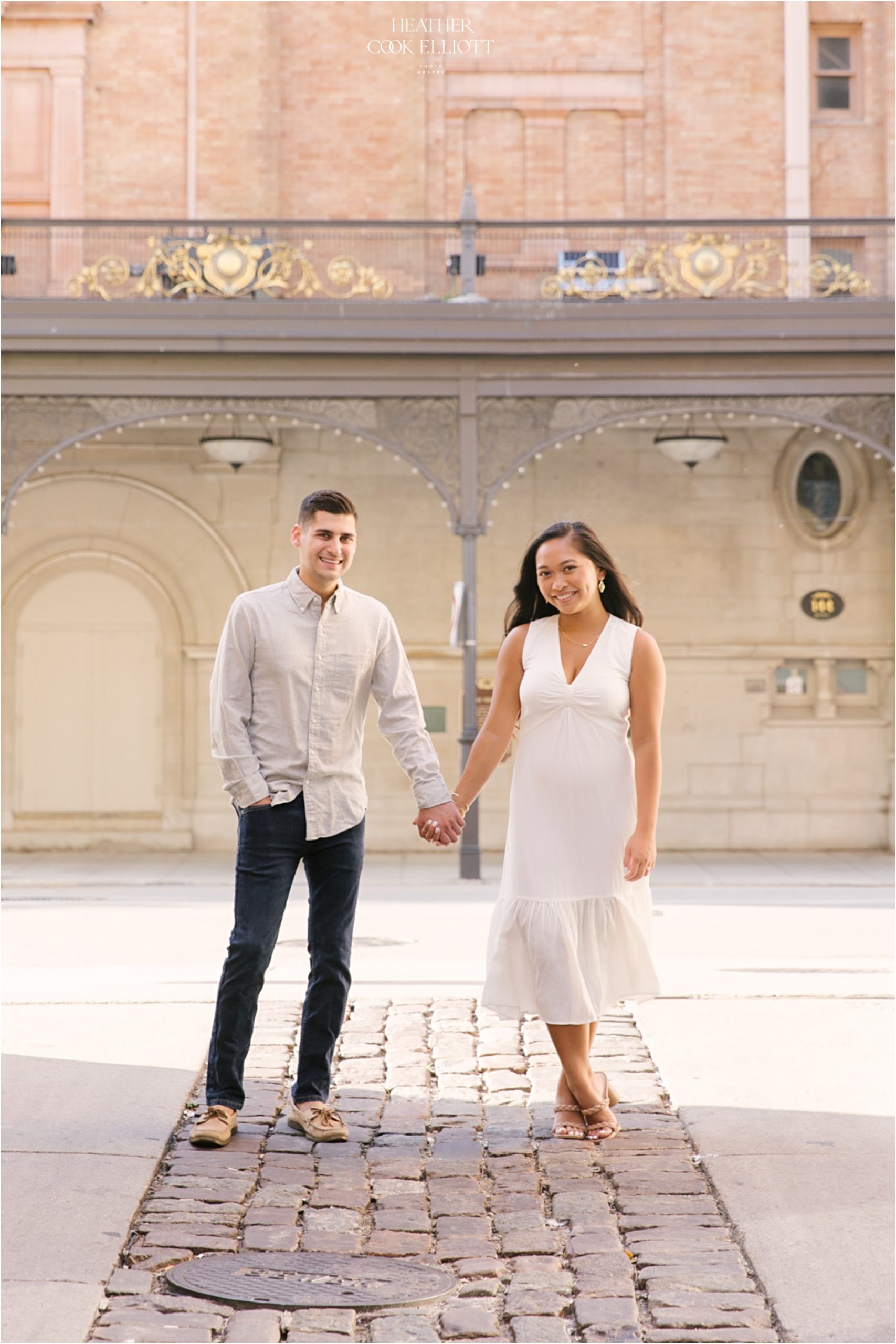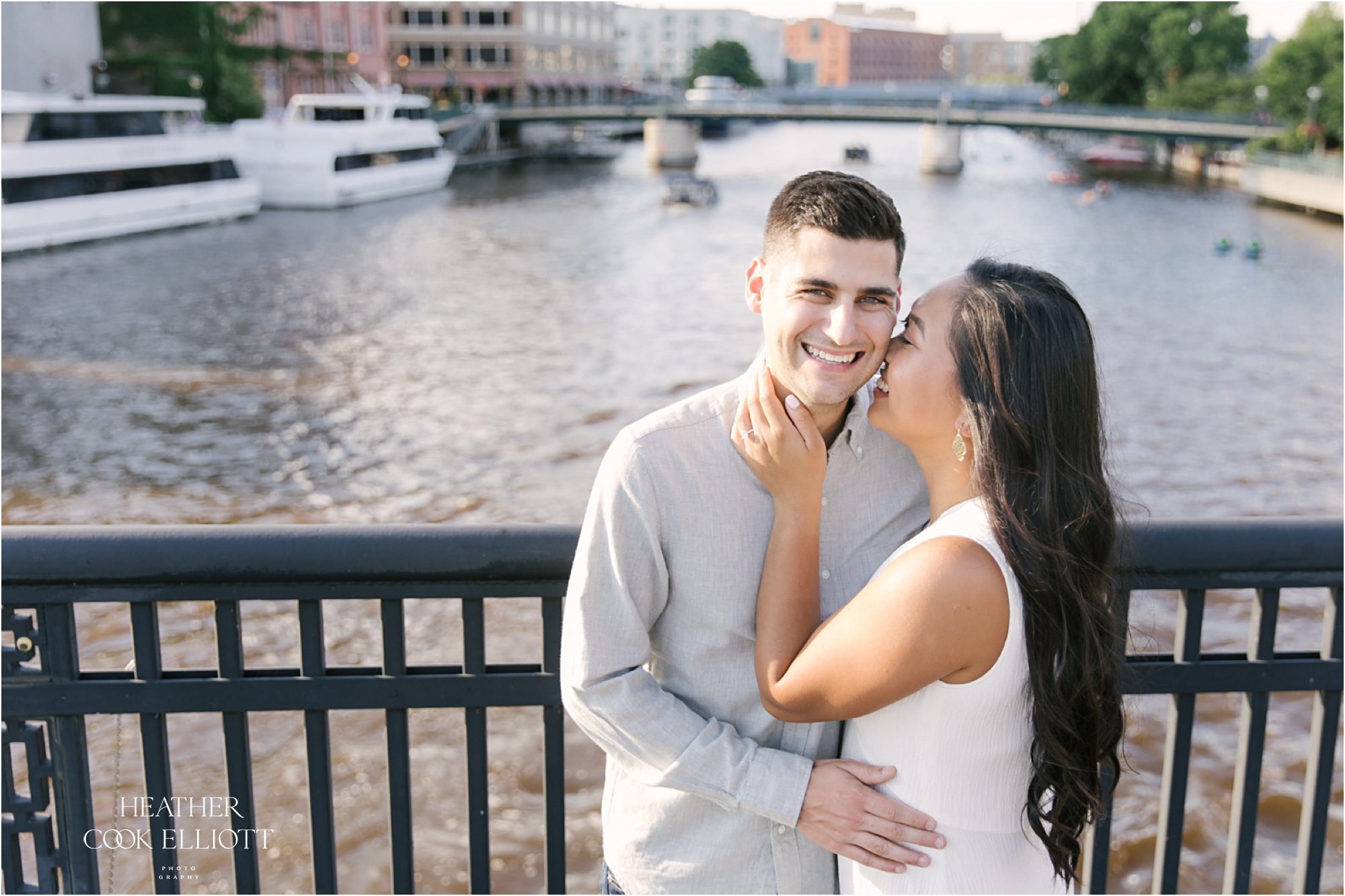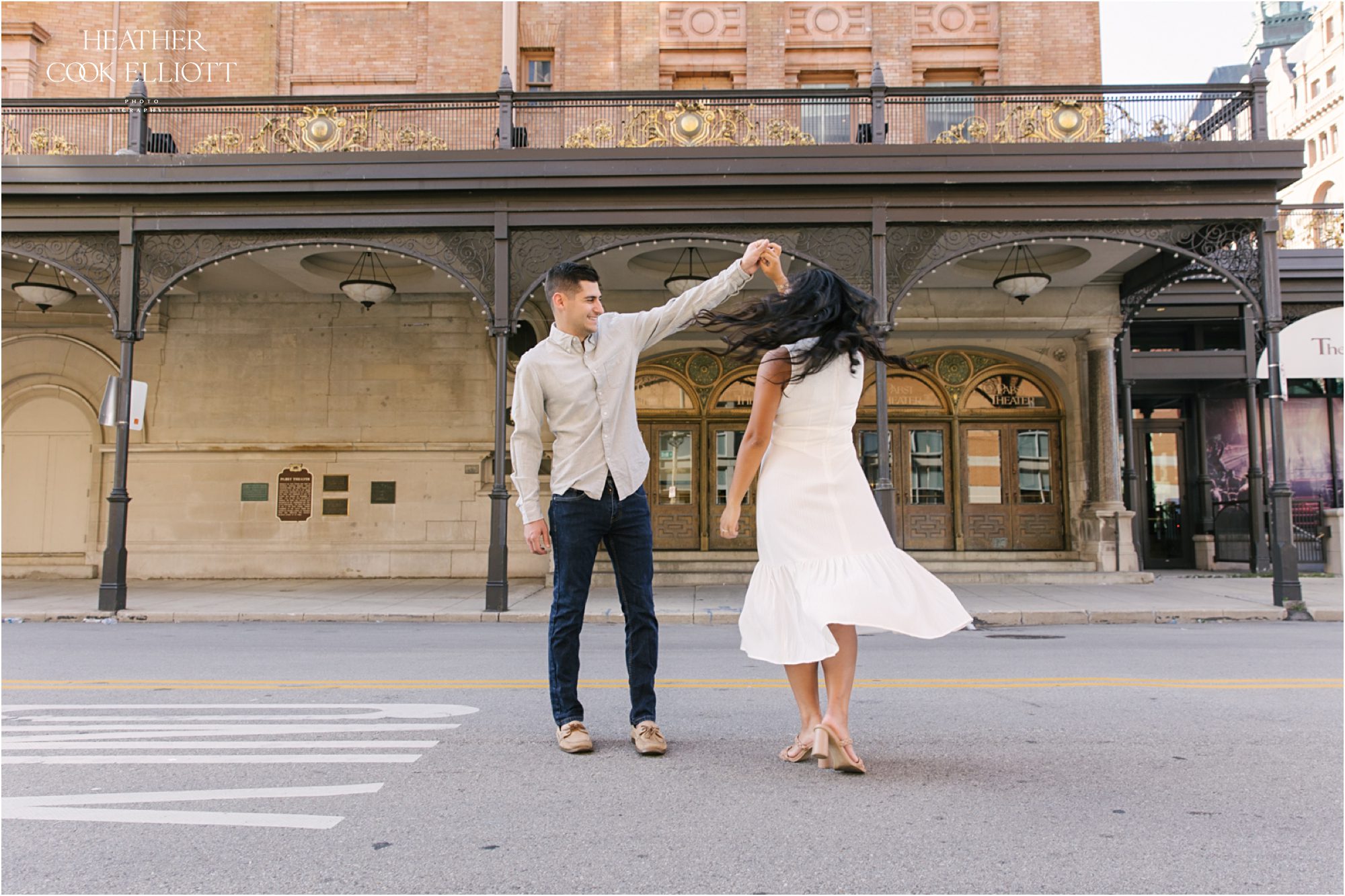 I keep starting and restarting this blog post because I can’t decide what I want to talk about first: the incredible light & gorgeous summer night Milwaukee offered to Marnee & Brett for their engagement session or the incredible light & gorgeous personalities Marnee & Brett offer up to the world around them. Both are true and made for a seriously fun time getting to know the two of them as we skipped about town from green spots to river views, the two of them hand in hand happy to tell their how we met and how we fell in love stories. And Bonus: Marnee realized she loved a good twirl and Brett obliged, clearly on board for whatever makes Marnee happy. They’ll the knot next year but for now they are content to wander by the river and dance in the street, enjoying each other and the city they love.