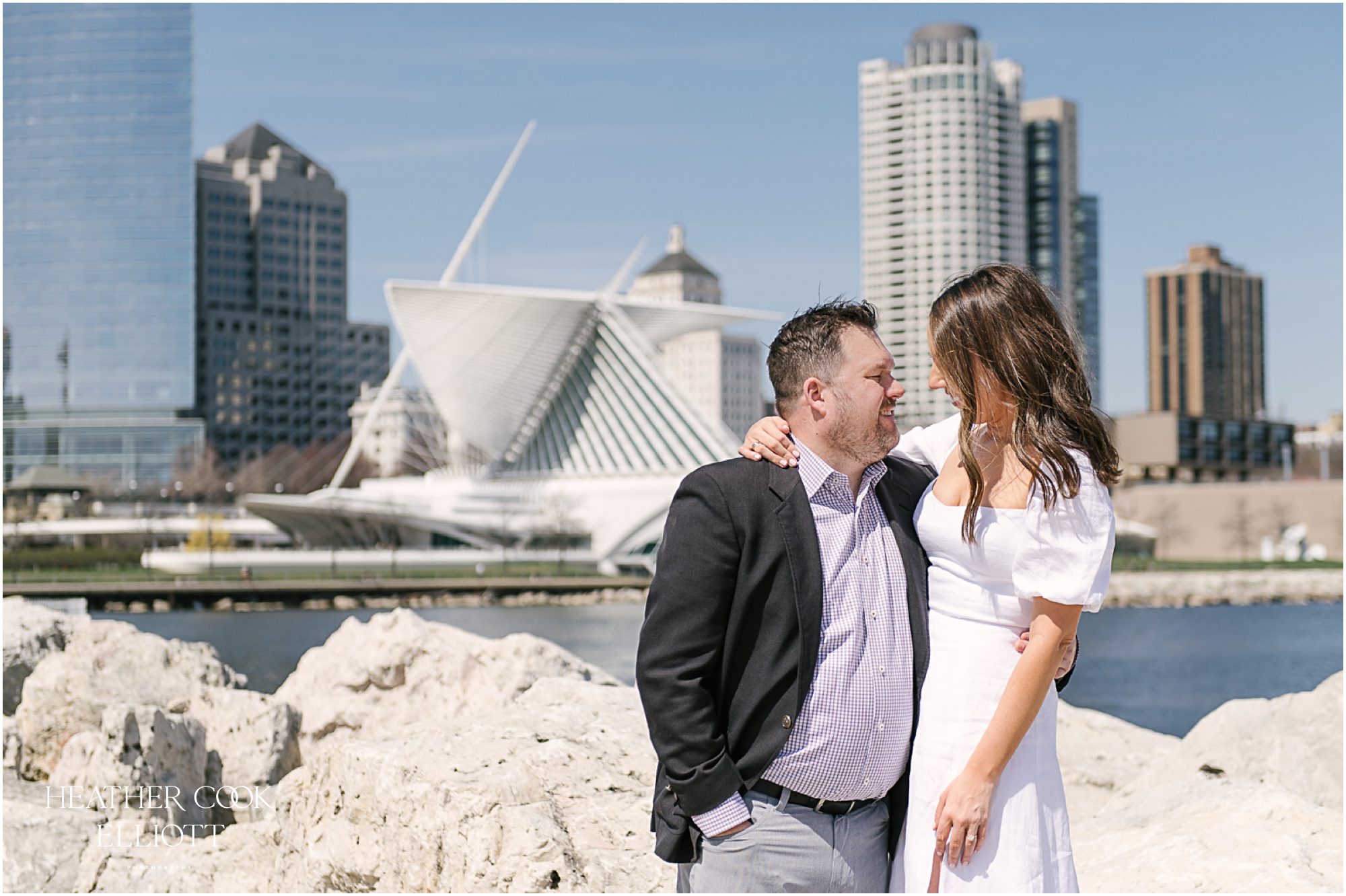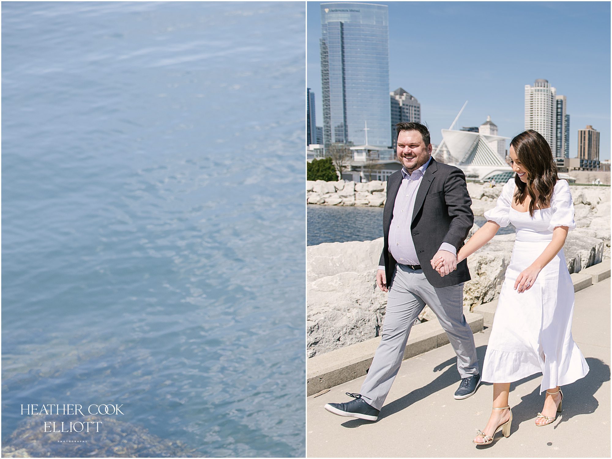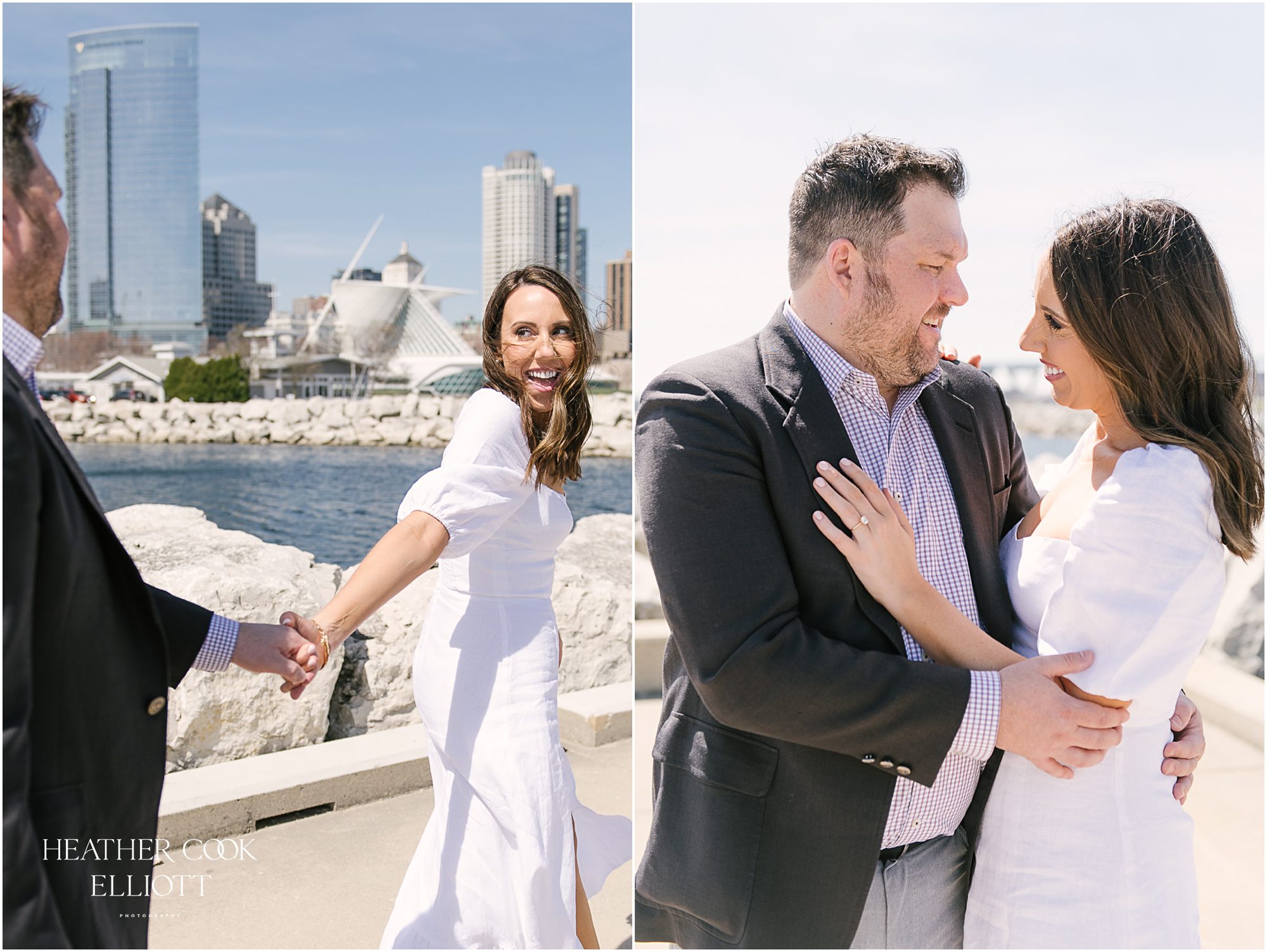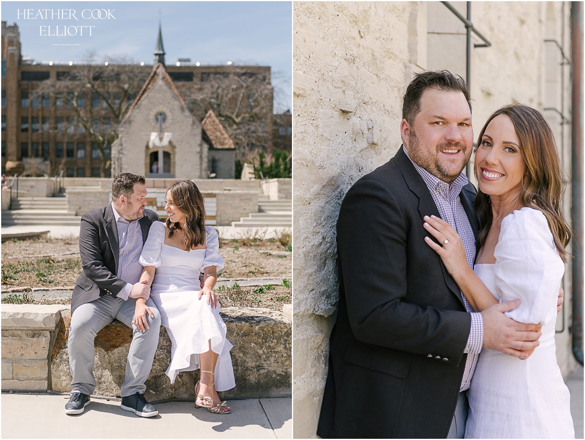 Some love stories have that Meant To Be feeling. Case in point: Leigh & Aaron. Their individual histories on paper say they should never have met – there are too many states in the way from Texas to Wisconsin to Minnesota and no synergy in their career fields. They didn’t meet online and they didn’t go to college together. But thank goodness Packer Nation casts a wide net. Set up by friends because they are both Packer fans, Leigh & Aaron built a life together during the time of Covid. Now that the world is back open to them, they figure there is no better way to invite their favorite people from across the nation into the details of their love story than to host a destination wedding in the state they both love from afar. So on a whirlwind wedding planning trip to Milwaukee this spring they met up with us for a mini session that flowed from the lakefront to her alma mater, Marquette. It was fast and fun, a delightful way to deep dive into getting to know them and make some sunny spring images for them along the way.