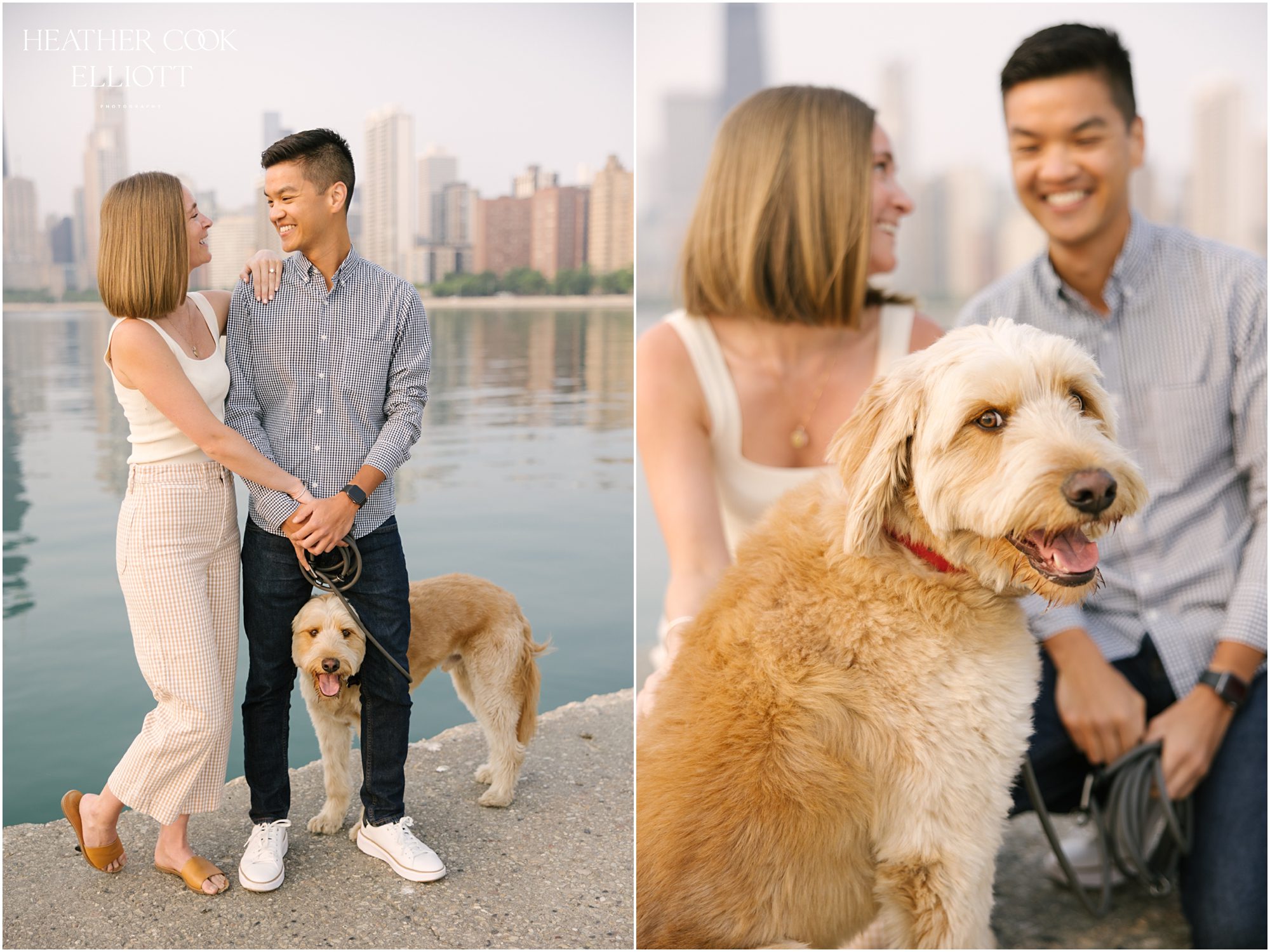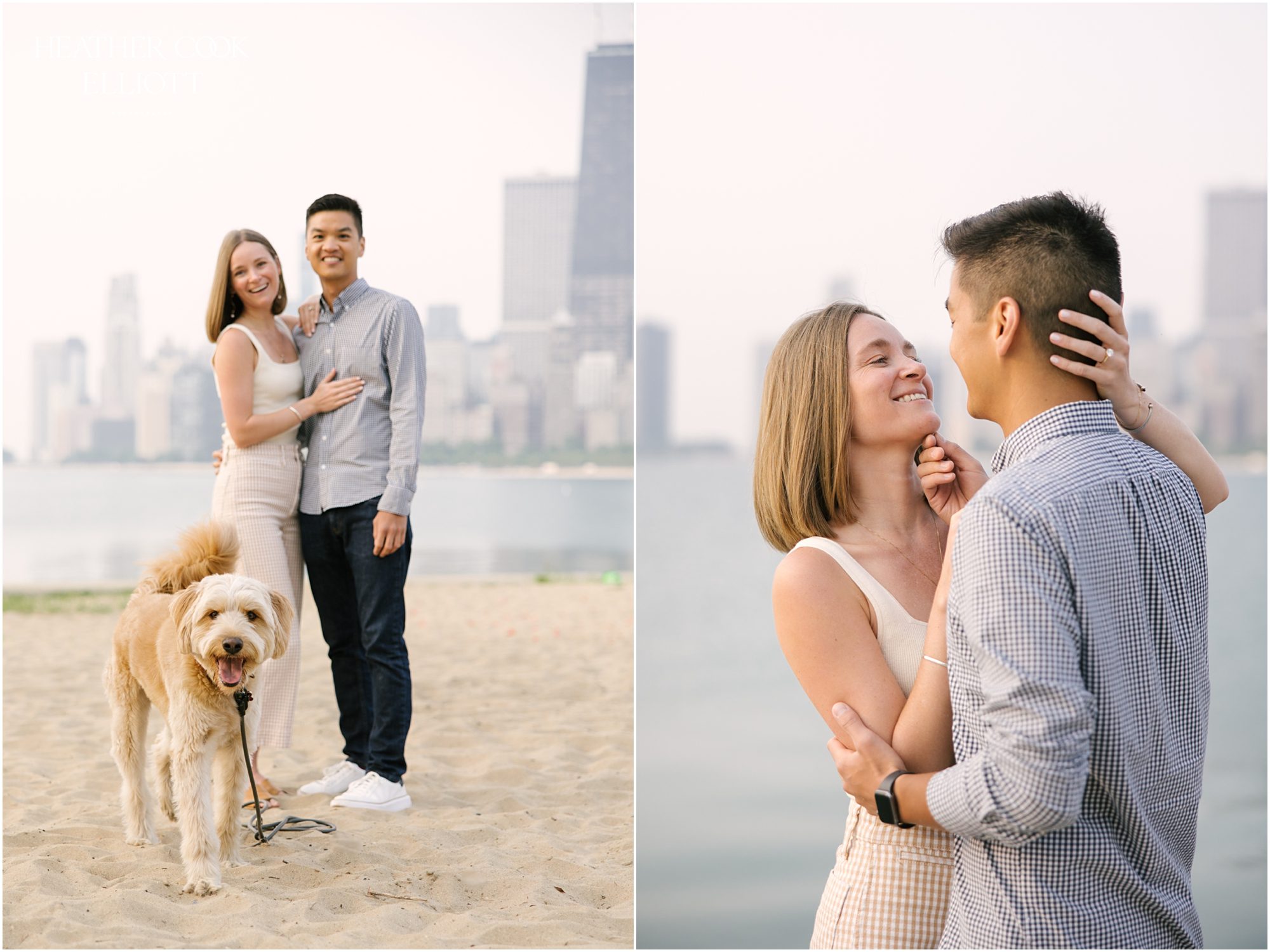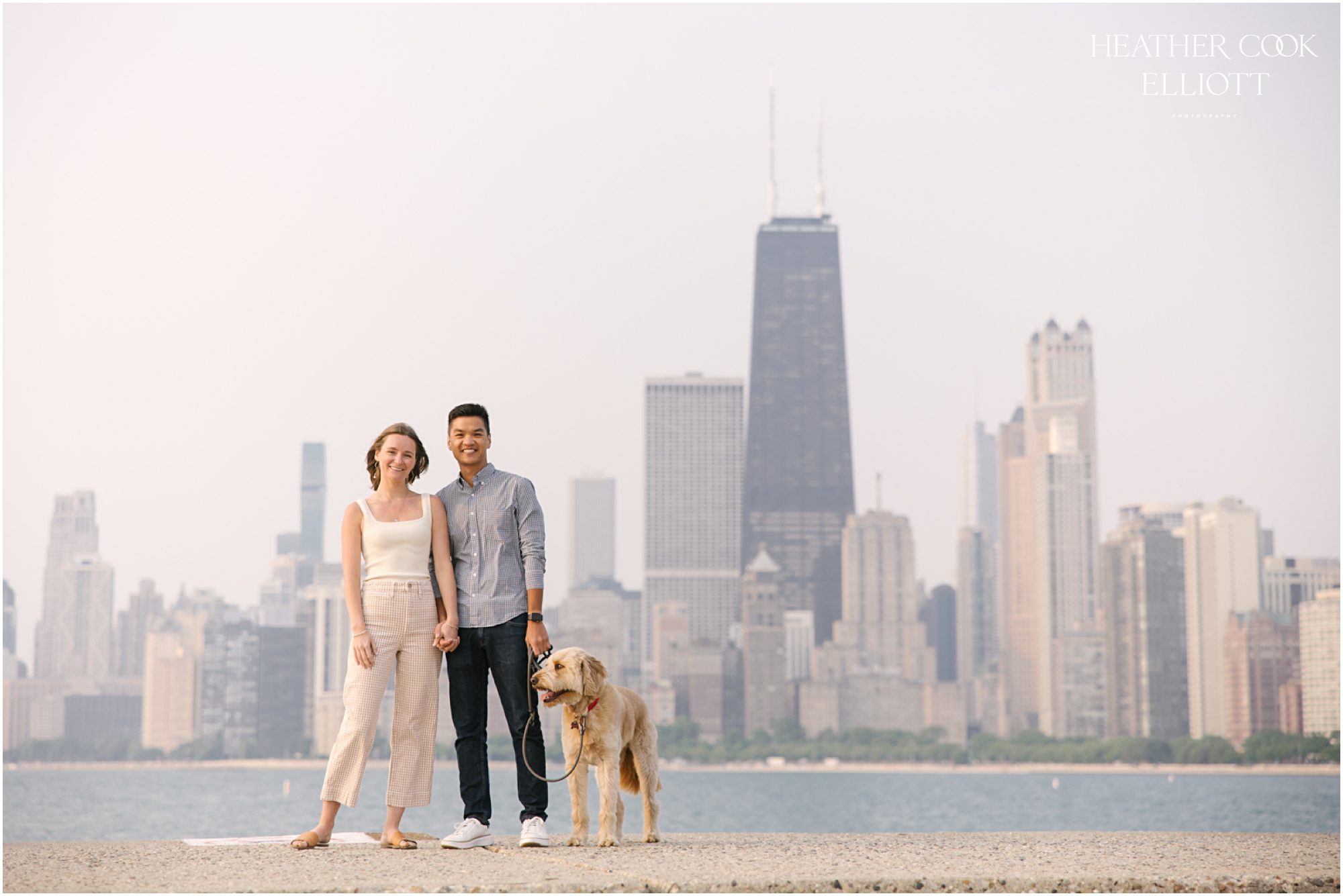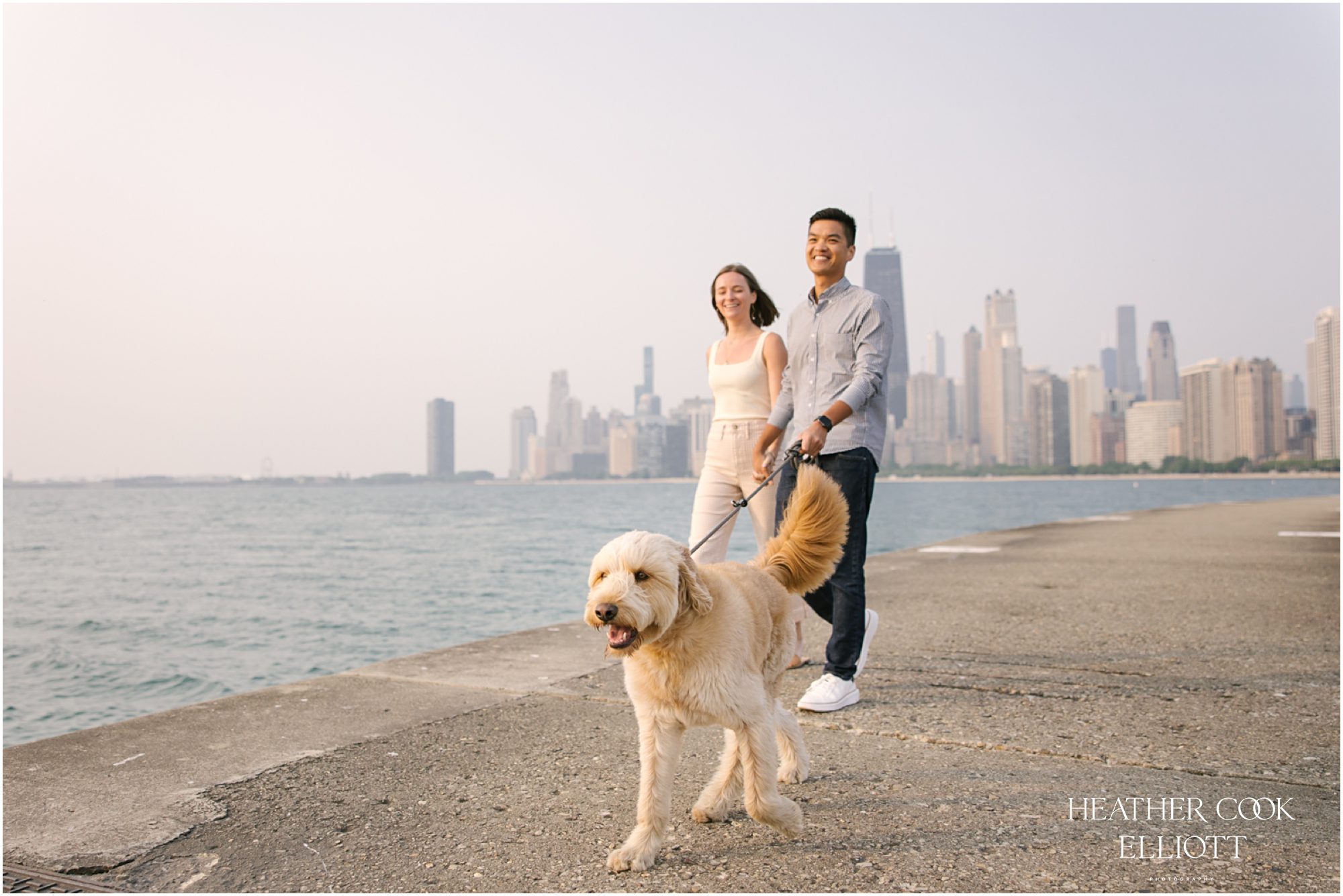 Ali & Quan were a little surprised when we agreed to a morning session and I followed that up with “Great! see you at 6 am!” While 6 am may have seemed a little early in the prep stage, when they met me on the sands of North Avenue beach it was clear that it was the perfect time to make some magic together. Accompanied by their adorable and incredibly well-behaved dog Link, Ali & Quan made the most of one of this summer’s curious, but incredibly lovely wildfire sunrises. With the city aglow in the warm sunshine Ali & Quan reminisced about how they met and how they’ve grown together over the last few years. They played with Link and let him lead the way along the water. They talked about how much they are looking forward to a wedding day full of family from parts near and far, and about how they can’t wait to celebrate the start of their forever in the cozy brick confines of Cafe Brauer this winter. So cheers to love and puppies, skyline views and happily ever afters