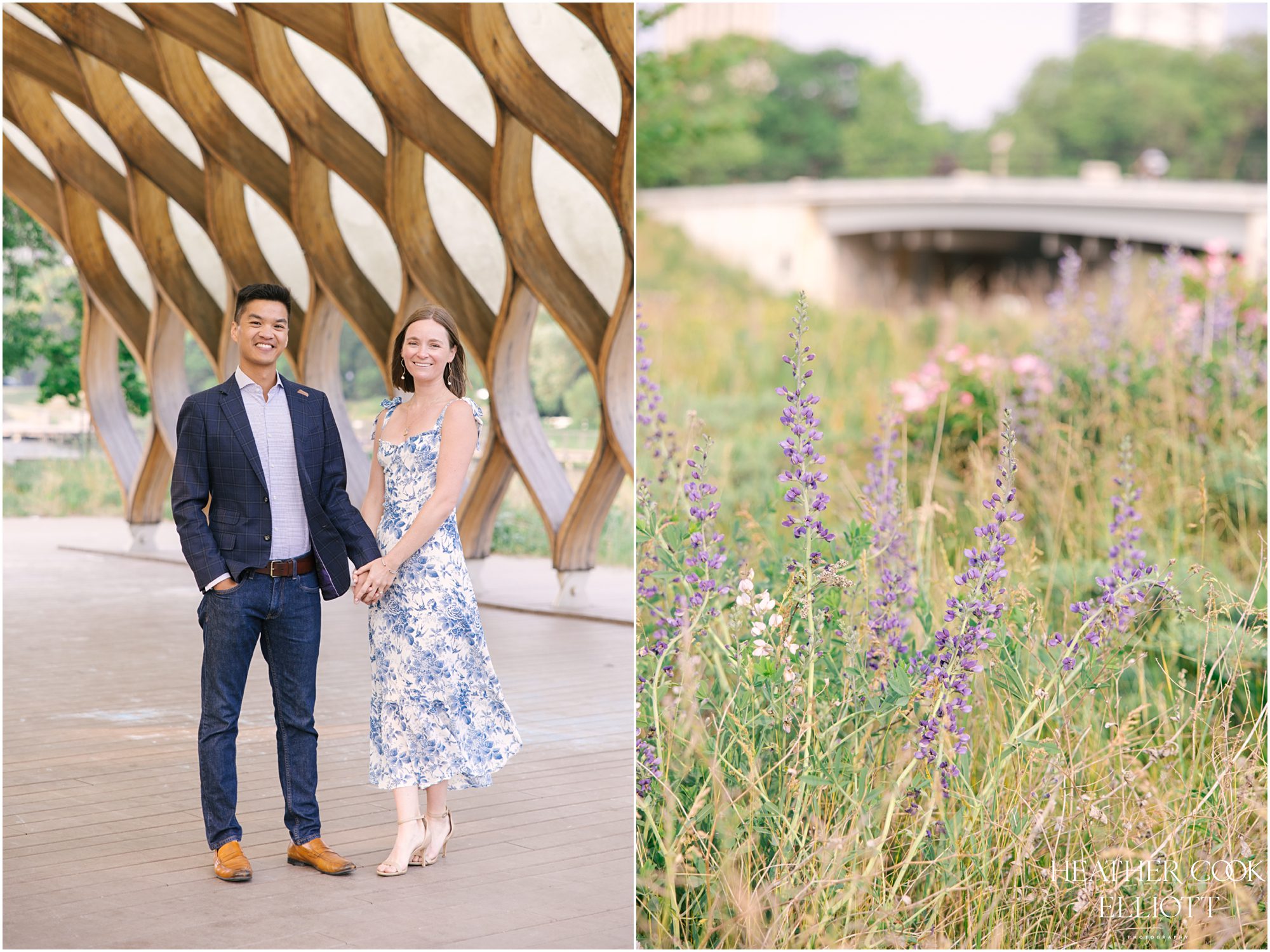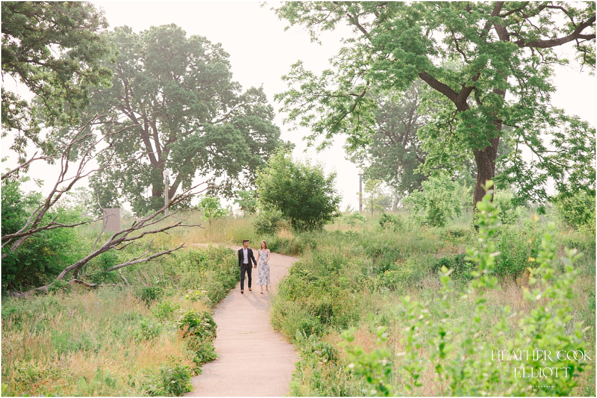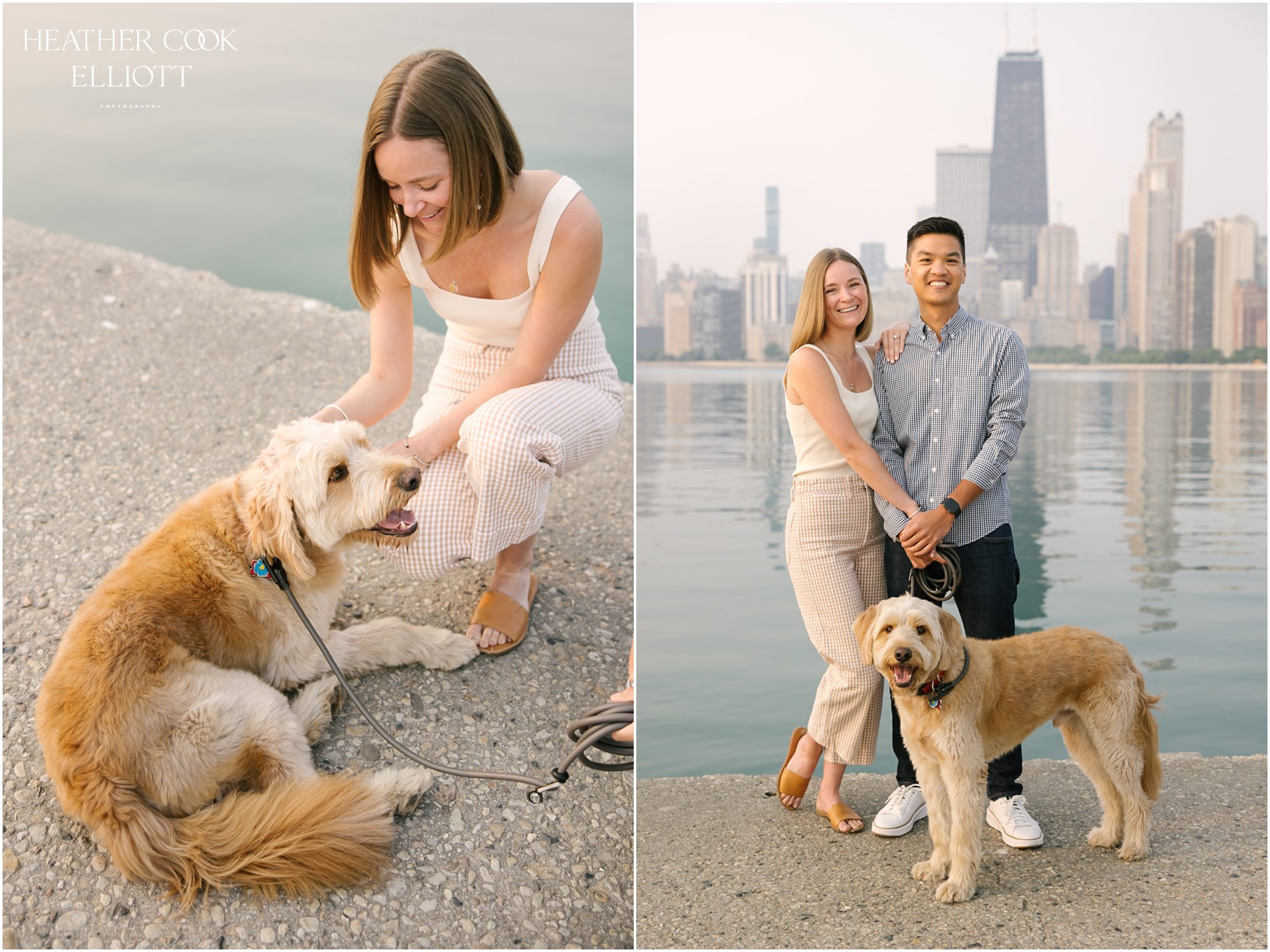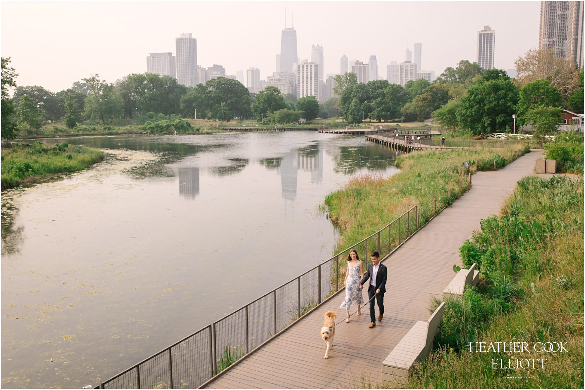Ali & Quan were a little surprised when we agreed to a morning session and I followed that up with “Great! see you at 6 am!” While 6 am may have seemed a little early in the prep stage, when they met me on the sands of North Avenue beach it was clear that it was the perfect time to make some magic together. Accompanied by their adorable and incredibly well-behaved dog Link, Ali & Quan made the most of one of this summer’s curious, but incredibly lovely wildfire sunrises. With the city aglow in the warm sunshine Ali & Quan reminisced about how they met and how they’ve grown together over the last few years. They played with Link and let him lead the way along the water. They talked about how much they are looking forward to a wedding day full of family from parts near and far, and about how they can’t wait to celebrate the start of their forever in the cozy brick confines of Cafe Brauer this winter. So cheers to love and puppies, skyline views and happily ever afters
