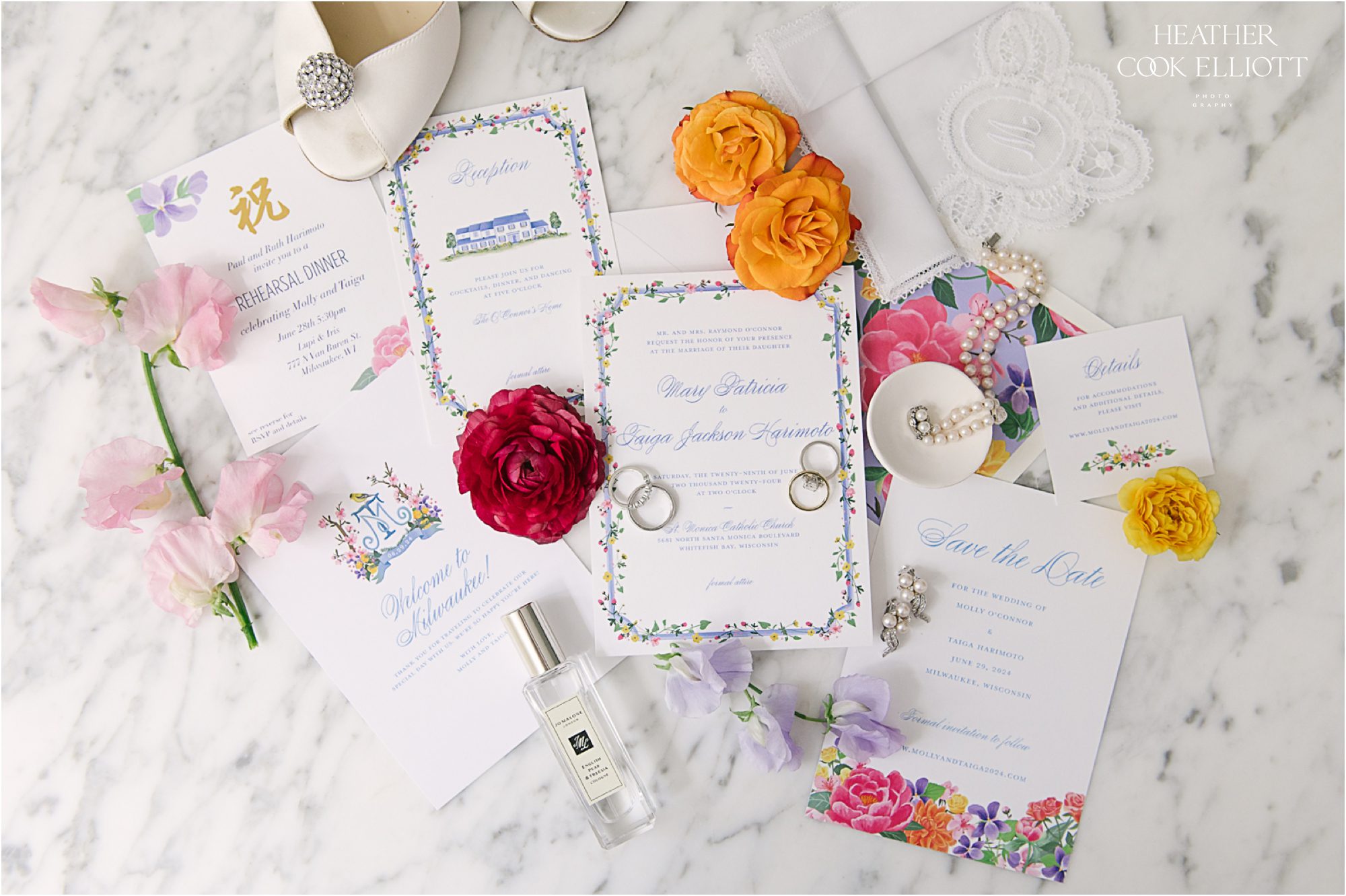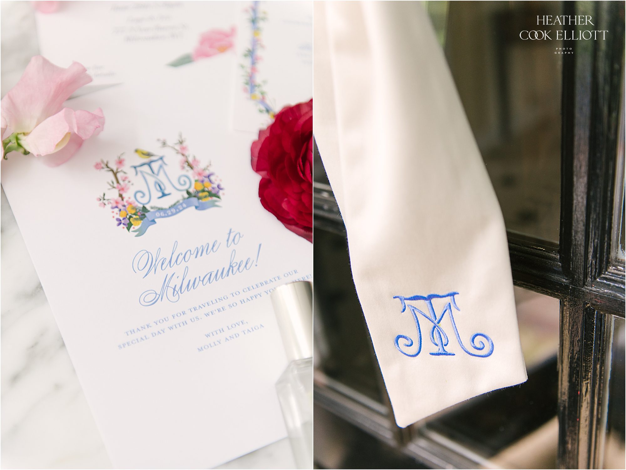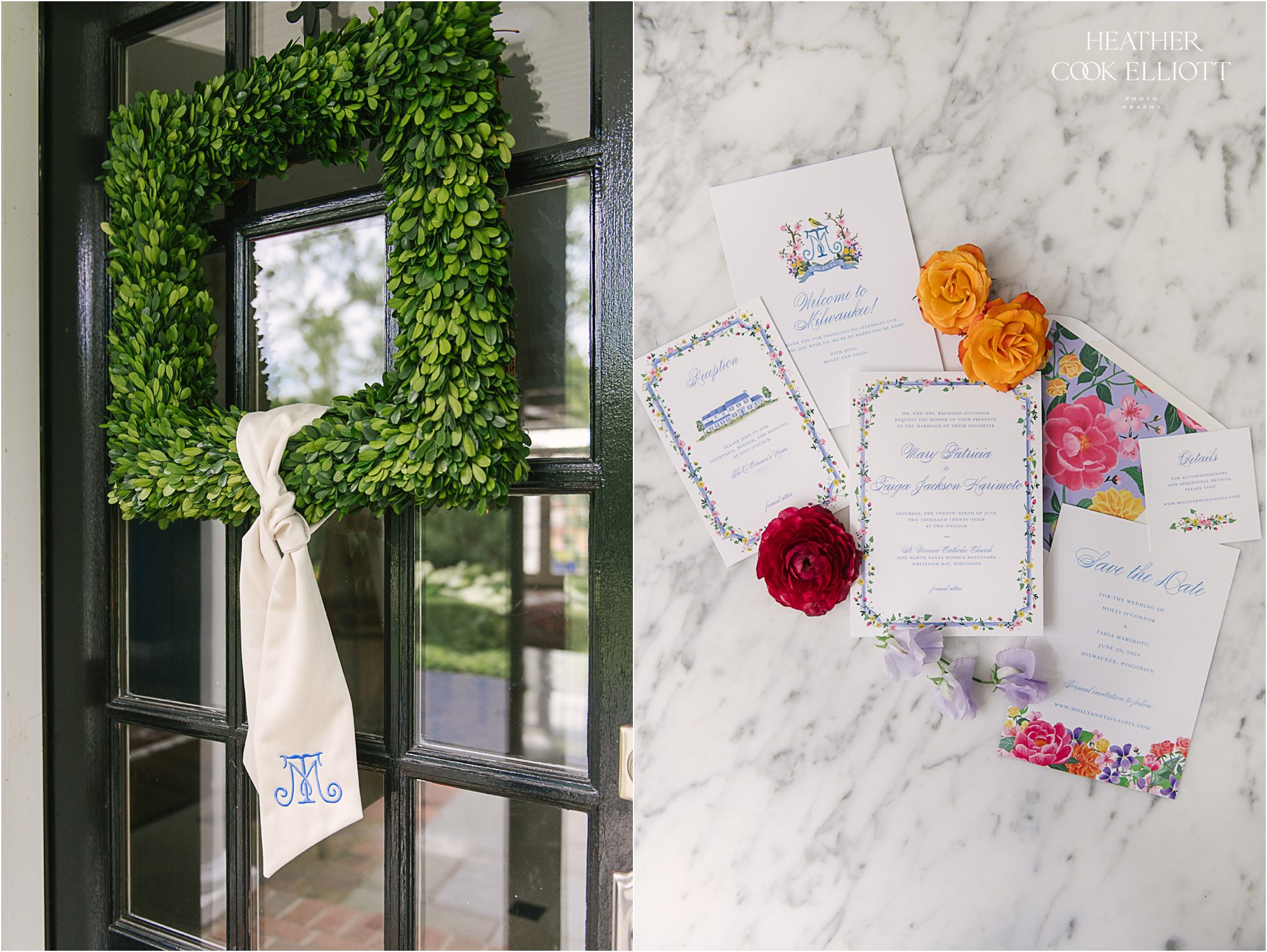 Molly & Taiga met in Seattle but they celebrated their gorgeous and oh-so-colorful-summer wedding at Molly’s family home in Wisconsin. But before they danced the night away under a sail cloth tent and toasted their love with family & friends they said I Do at Saint Monica’s, completing their modern, joyful day with a sweet dose of tradition. Molly’s mom had tied a rosary in a tree to keep the rain away and her plan must have worked because it was warm, blue sky day and a perfect Wisco evening for all of the local family and friends, plus the many guests from out of state. We loved the heavy rotation of floral motifs (even on Molly’s dress) and the use of so many different florals, fun patterns and textures (hello rattan!) to create a a truly romantic and lovely space to celebrate these two and the life they are starting together. So cheers to the return of color to weddings and most importantly, cheers to Molly & Taiga!