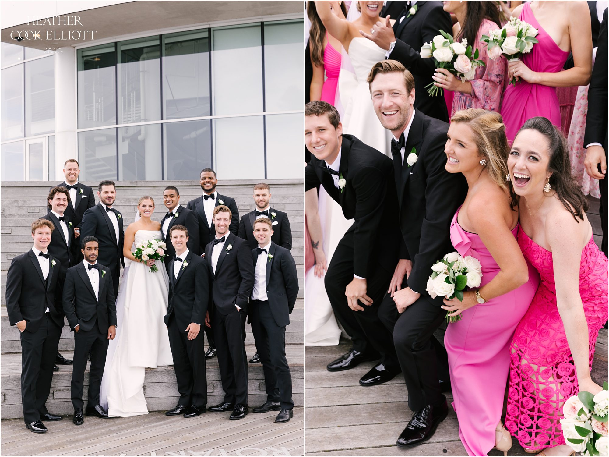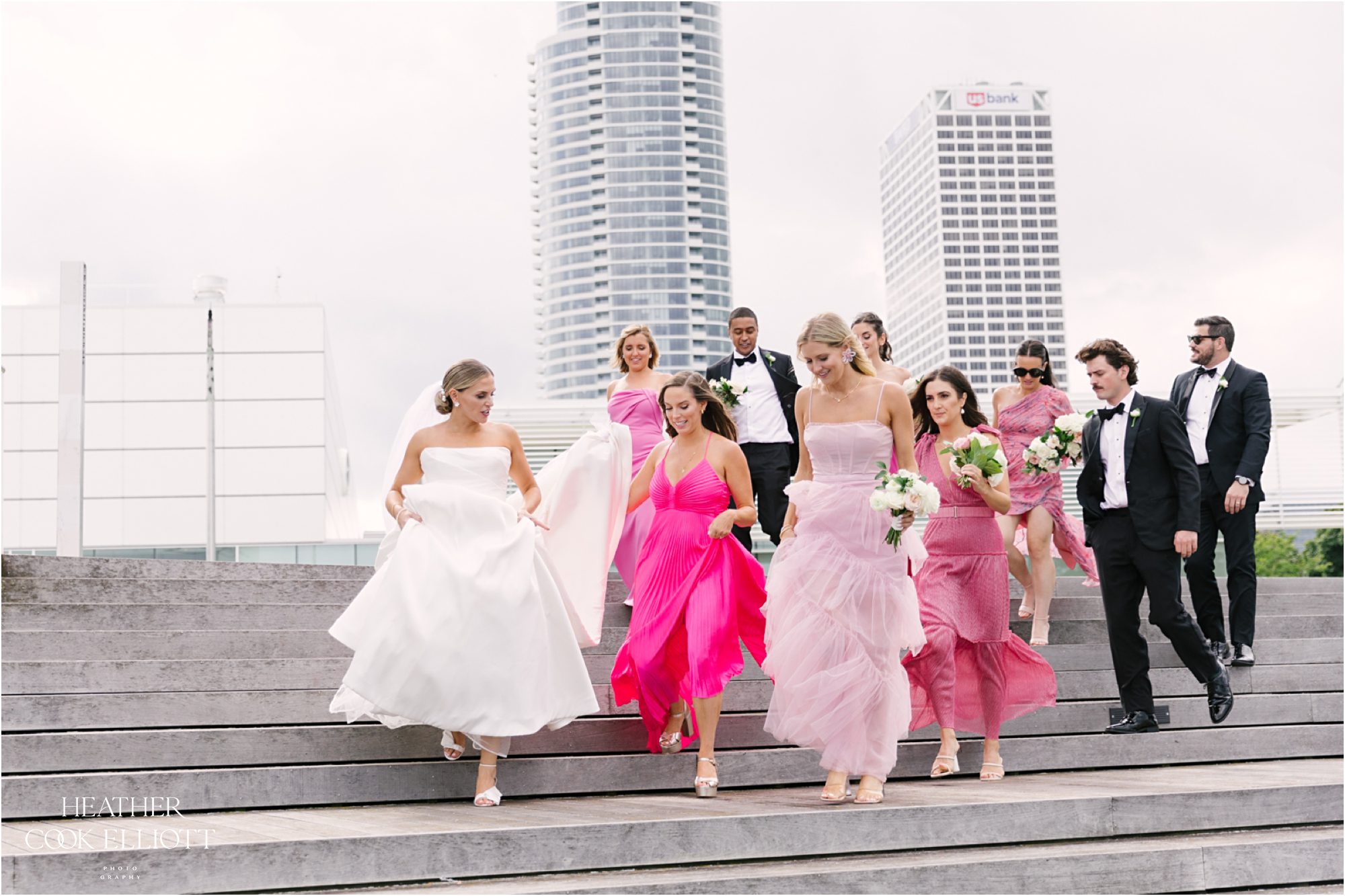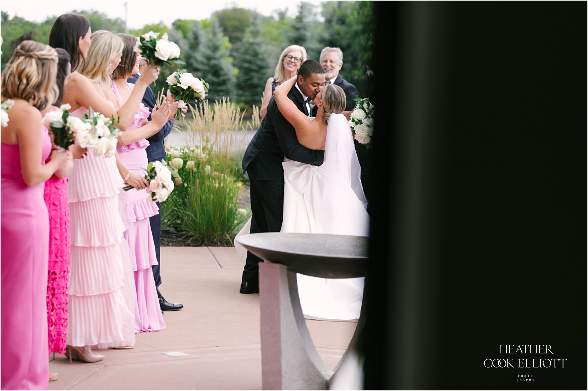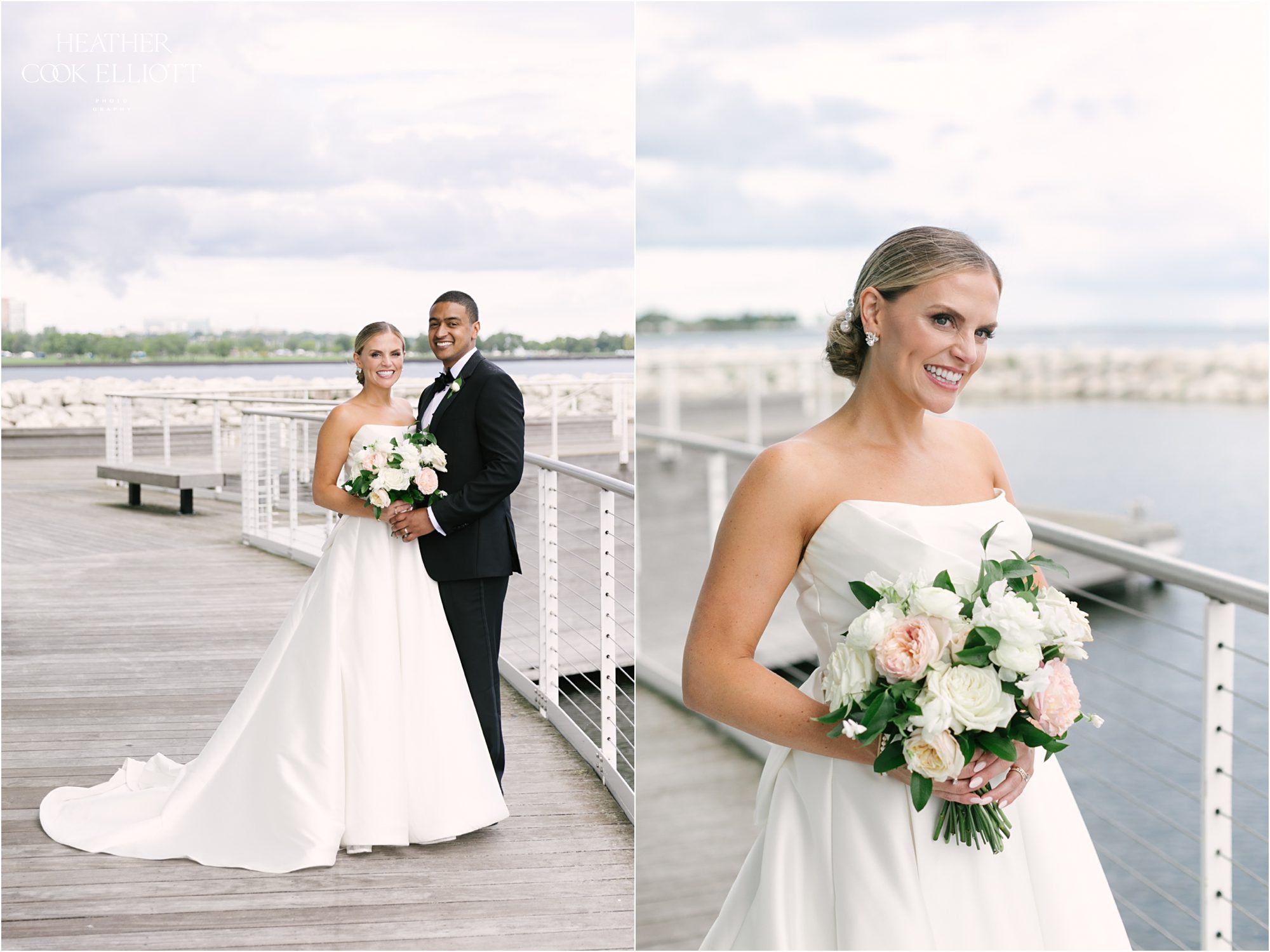 Katie & Maz celebrated their wedding in grand lakeside style in Milwaukee on a day that featured a little rain, but just enough to make the sky bluer, the lake sparklier, and their sunset even sweeter. They said I Do at Katie’s home parish and celebrated their commitment at Discovery World where every view includes water. We loved Katie’s bold choice to invite her bridesmaids to pick a pink dress and go for it and even more we loved how that variability was paired with Maz’s guys in classic tuxedos. From the romantic flowers to the vintage cake topper, Katie & Maz chose to make their day a perfect example of how elegance never goes out of style. This wedding pairs well with champagne and live music, with laughter and good times so get ready to smile and scroll with purpose; this one will warm your heart.