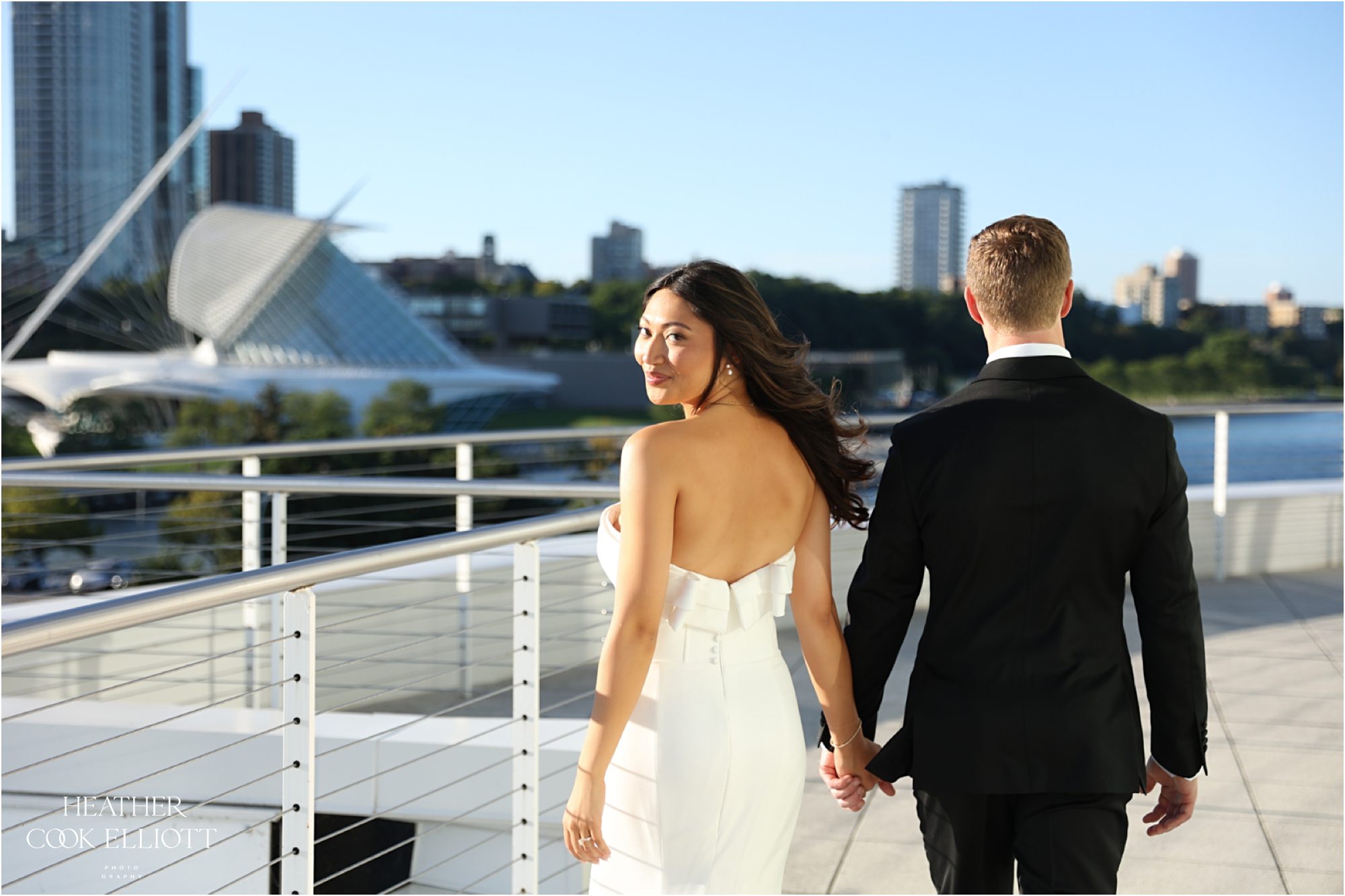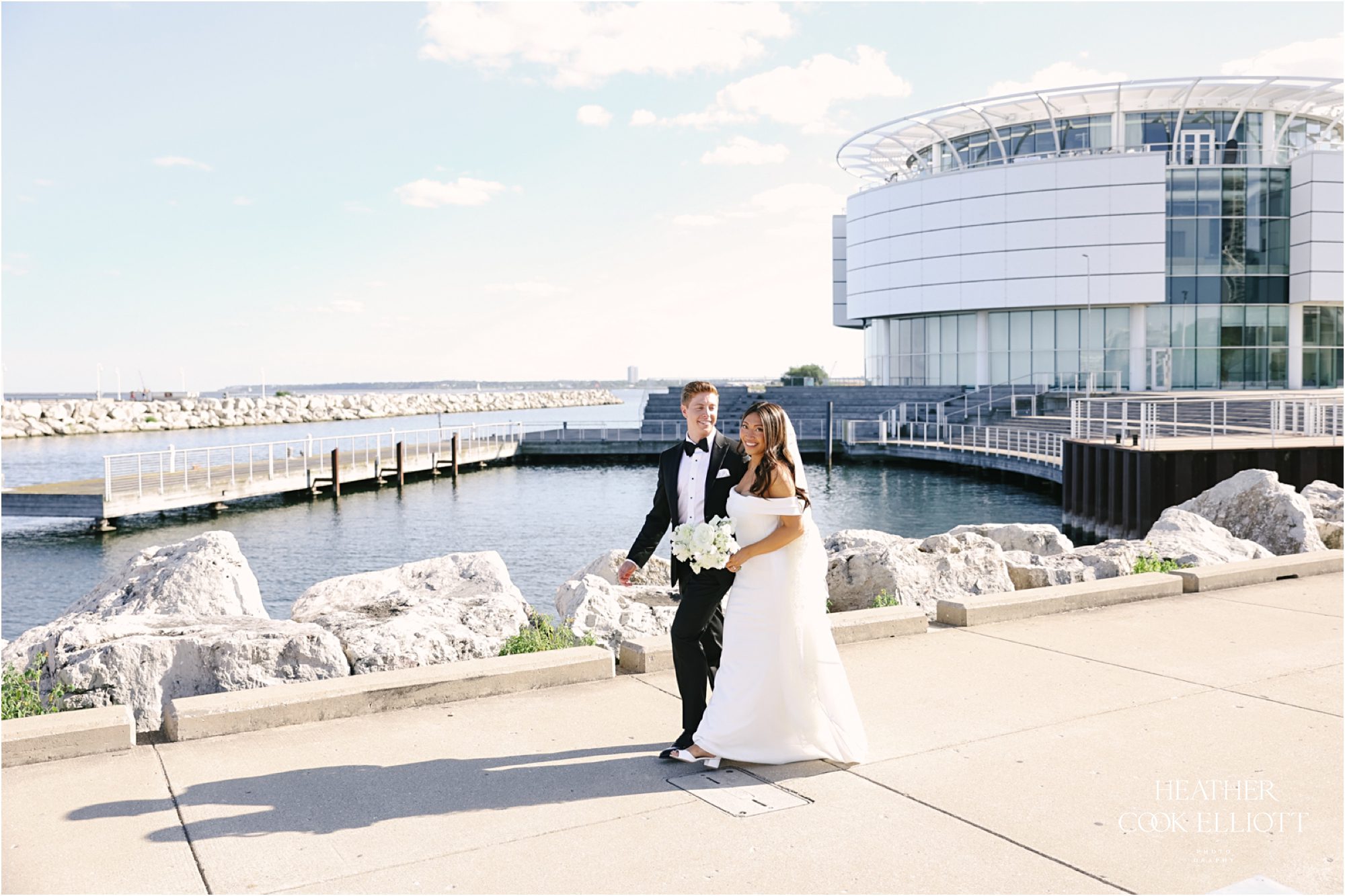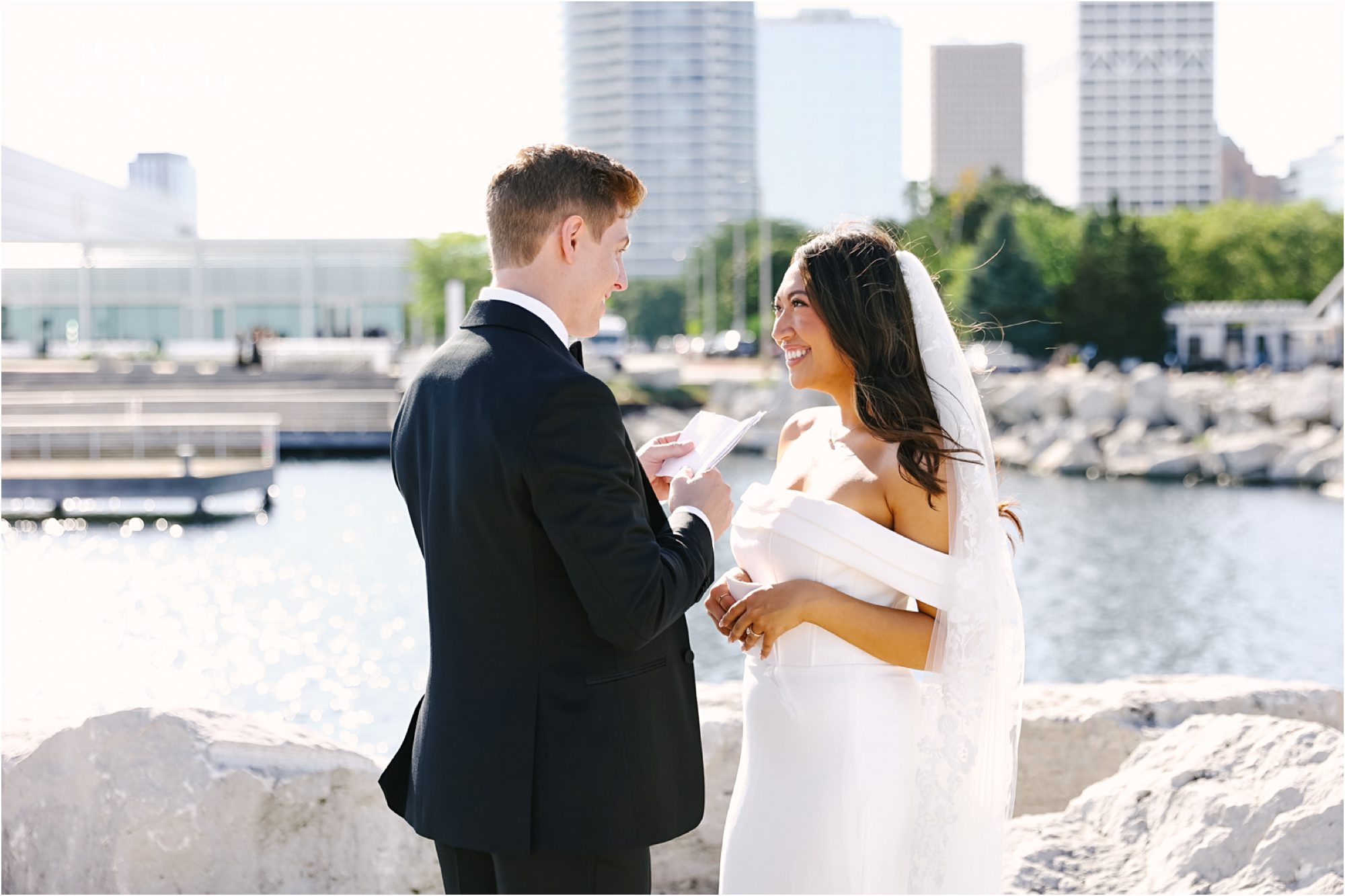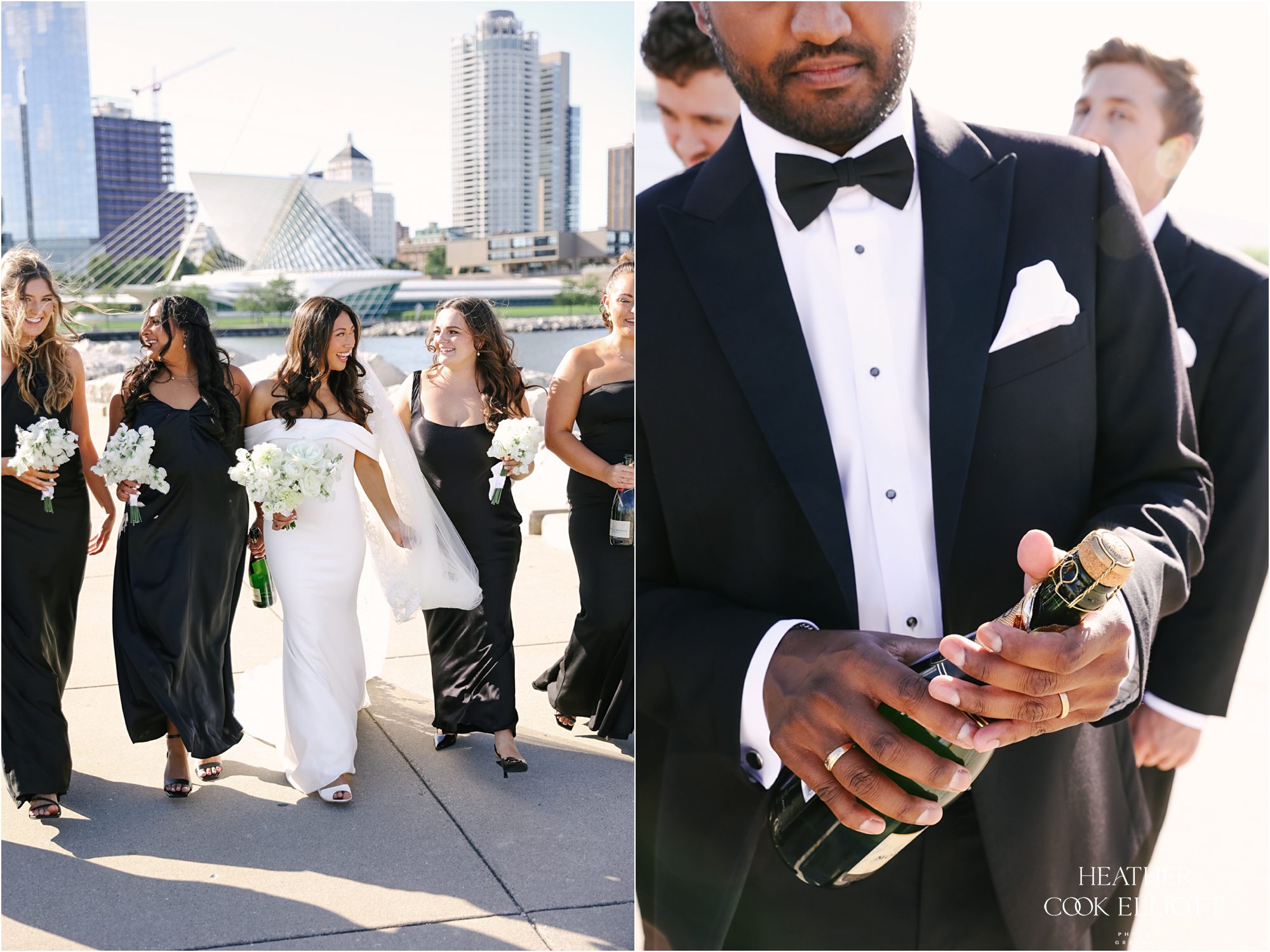 Nina & Logan’s wedding day was like a breath of fresh air. It was equal parts modern and traditional and we adored all of their stylish details + the spaces and places where they chose to spend their wedding day. But more than any of that we loved witnessing and photographing the thoughtful ways they moved through their day. Nina dressed with her beloved mom by her side – and spent extra attention enjoying the details of her incredible Philippino wedding veil. They met for the first time that day at the end of the aisle at Old St Mary’s, the oldest Catholic church in Milwaukee. The east side and lakefront played host to the rest of their wedding and it was a glorious blue sky day perfect for exchanging private vows AND for popping bottles. So grab your own glass of bubbly and get ready to breath deeply; love is in the air.