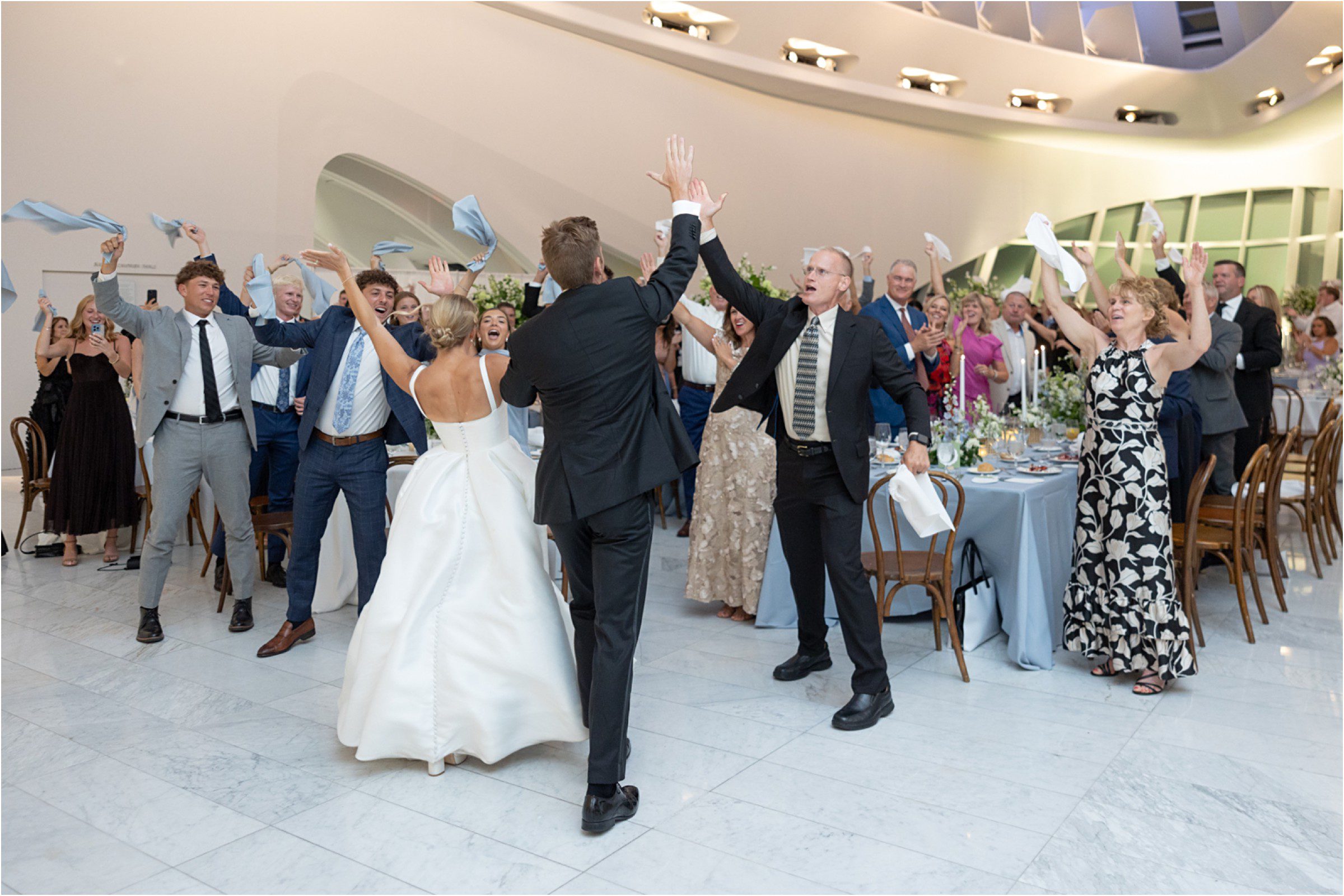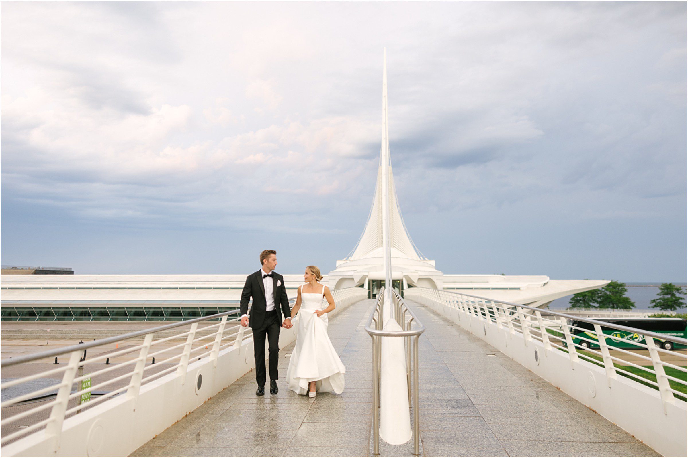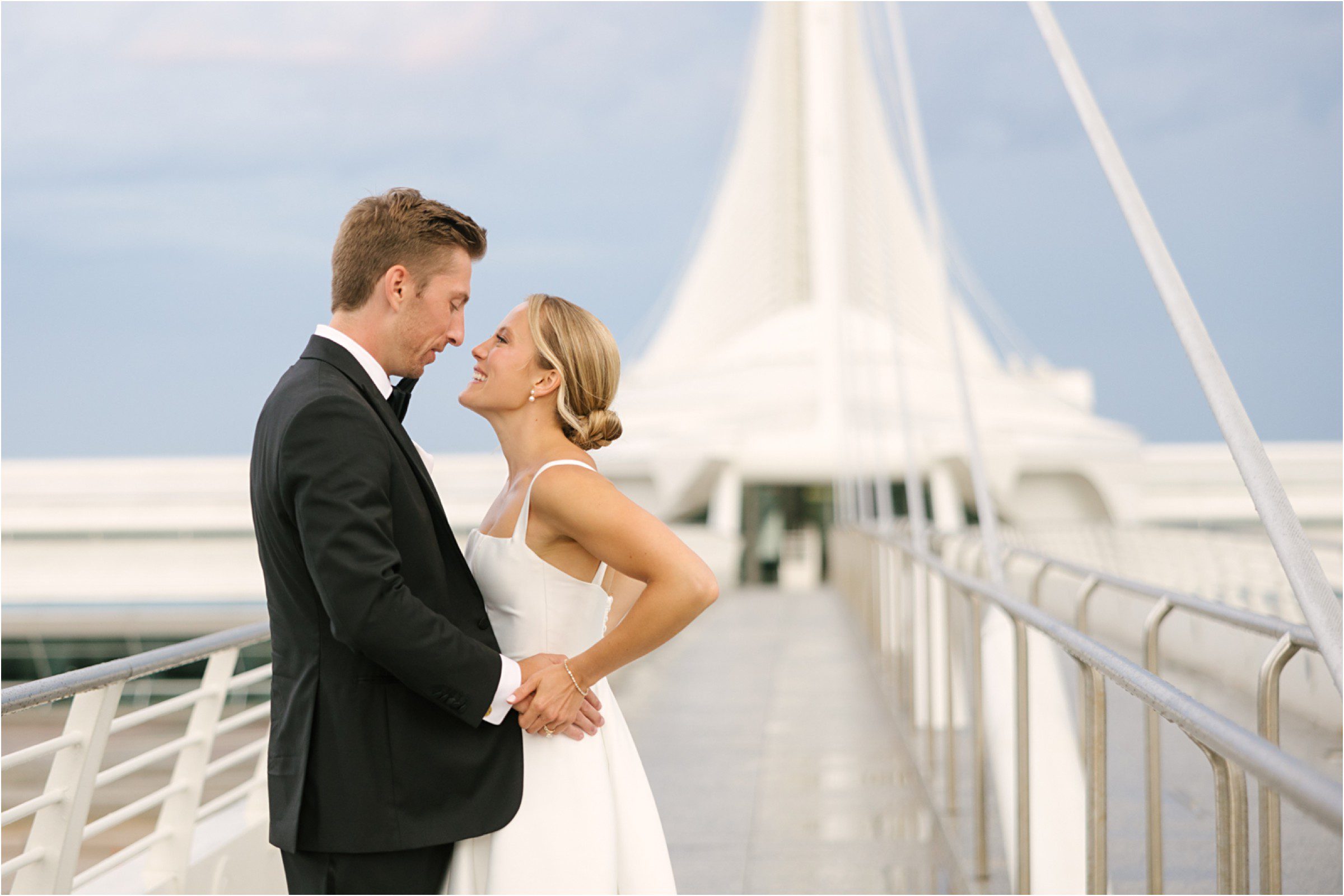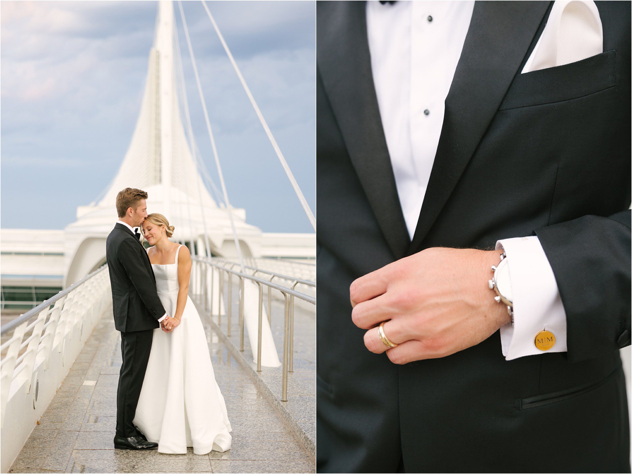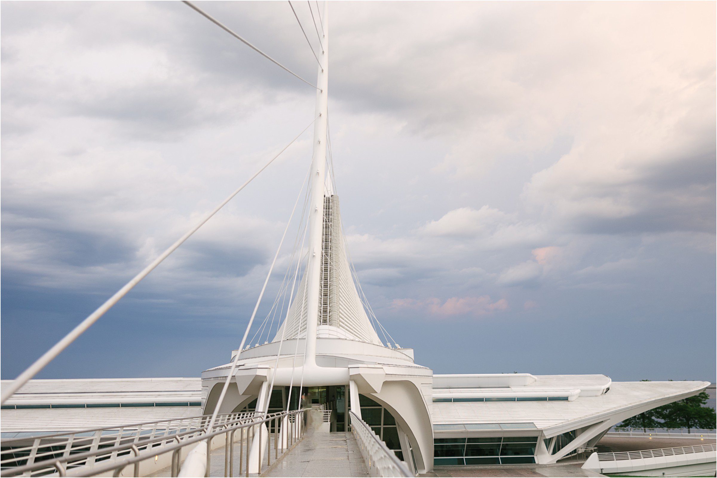 Brooke & Matt are joy incarnate. Their friends adore them, their parents practically beam when looking at them, and the two of them are hearts-on-the-sleeve-dance-like-no-one-is-watching kind of people. And man oh man, a wedding day filled with that kind of delight and love is exactly what a photographer needs to fill the proverbial tank and stay grounded in the moment on a wedding day. Theirs was an uncharacteristically stormy summer day but we made the most of our dry minutes and they got to see one another for the first time on the roof of Hotel Metro and take in Lake Michigan views with their wedding party. Even when the sun declined to shine outside they brought the summer air in with them via a design by Jane Kelly Floral that managed to make The Milwaukee Art Museum even more gorgeous. You’ll have to forgive how many detail shots there are in this post, but seriously, every delicious bluebell, sneak peek of Brooke’s sky high heels, and focus on the texture and pattern of the day just breathes life into my soul so let’s go with it. In the end our collective reward is one of the most beautiful stormy sunset sessions we’ve ever photographed and the happiest dancing grandpa you ever did see.
