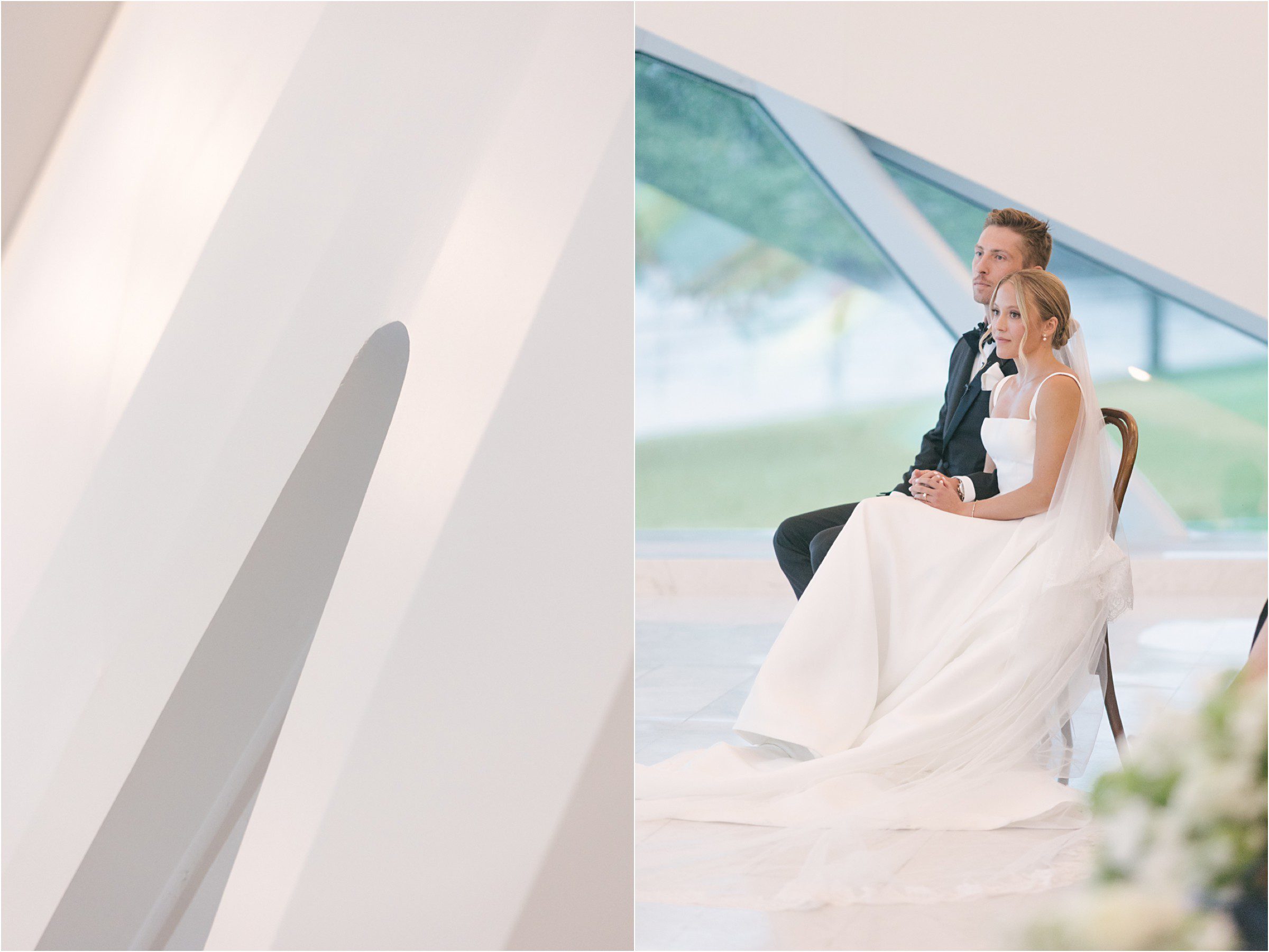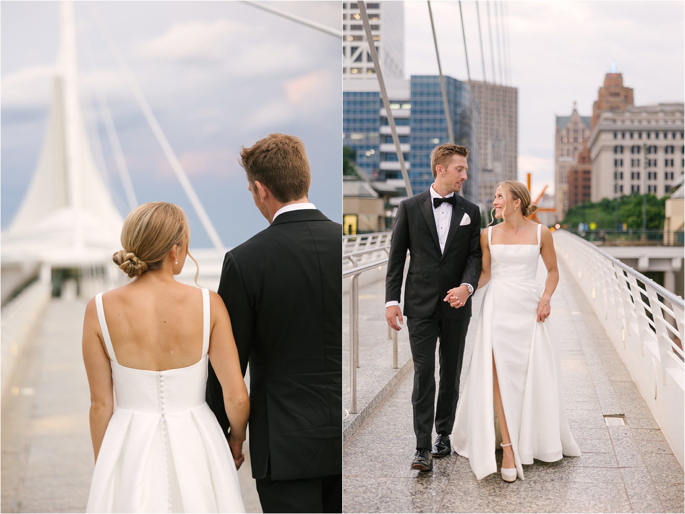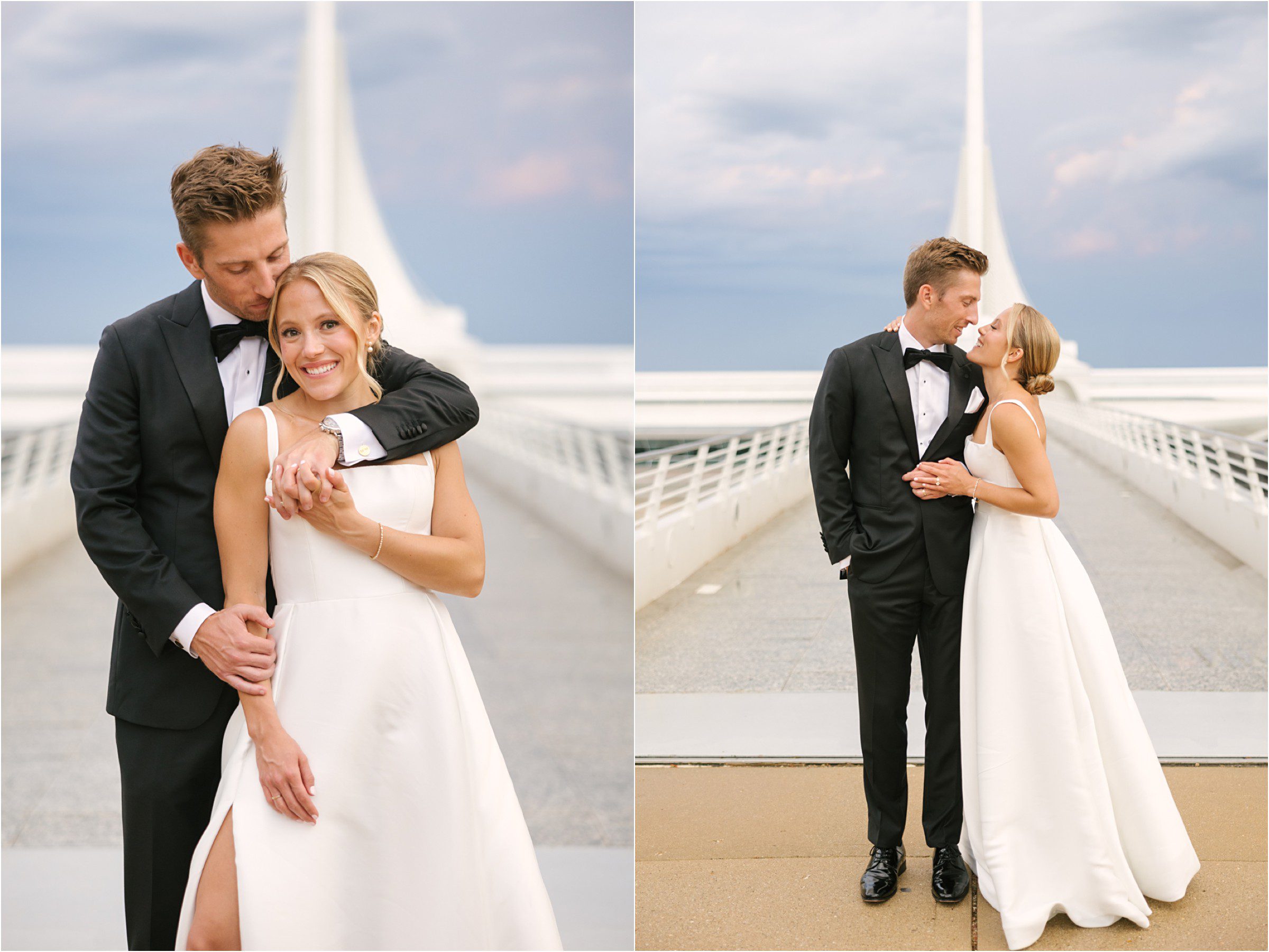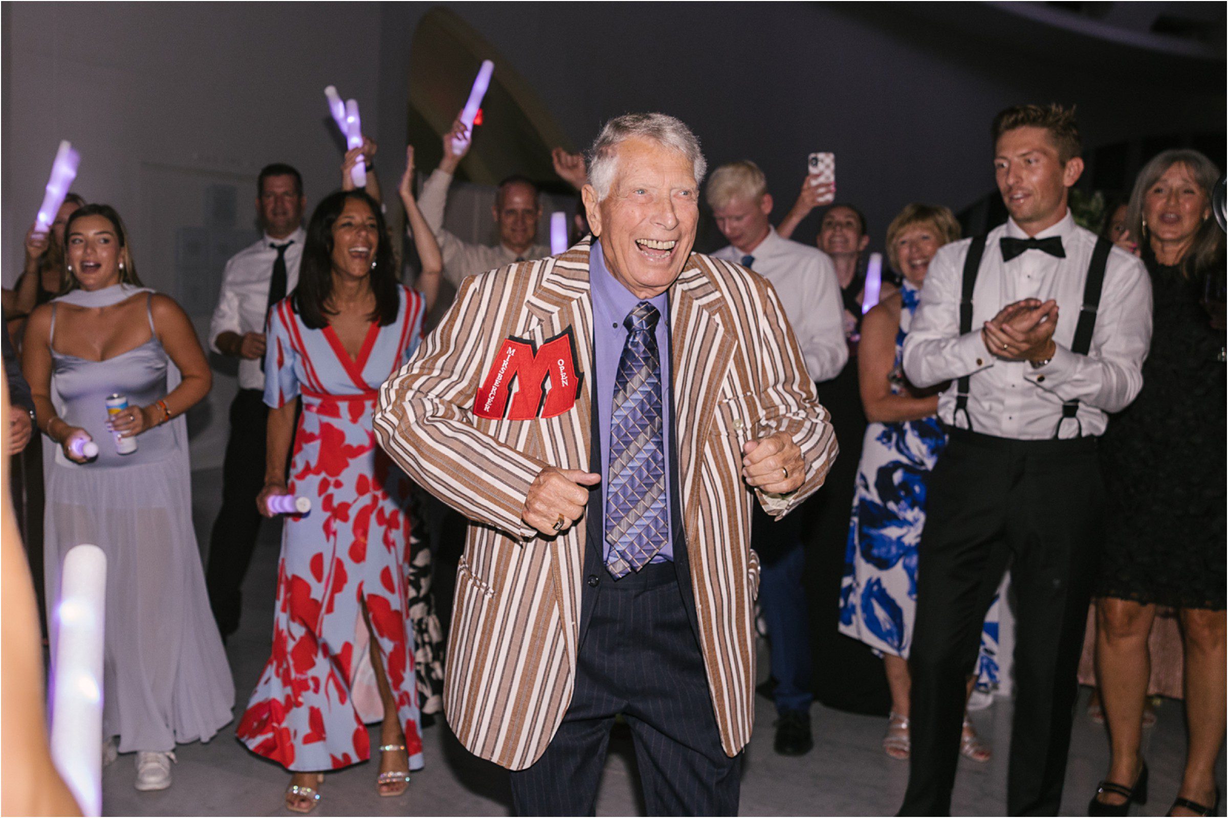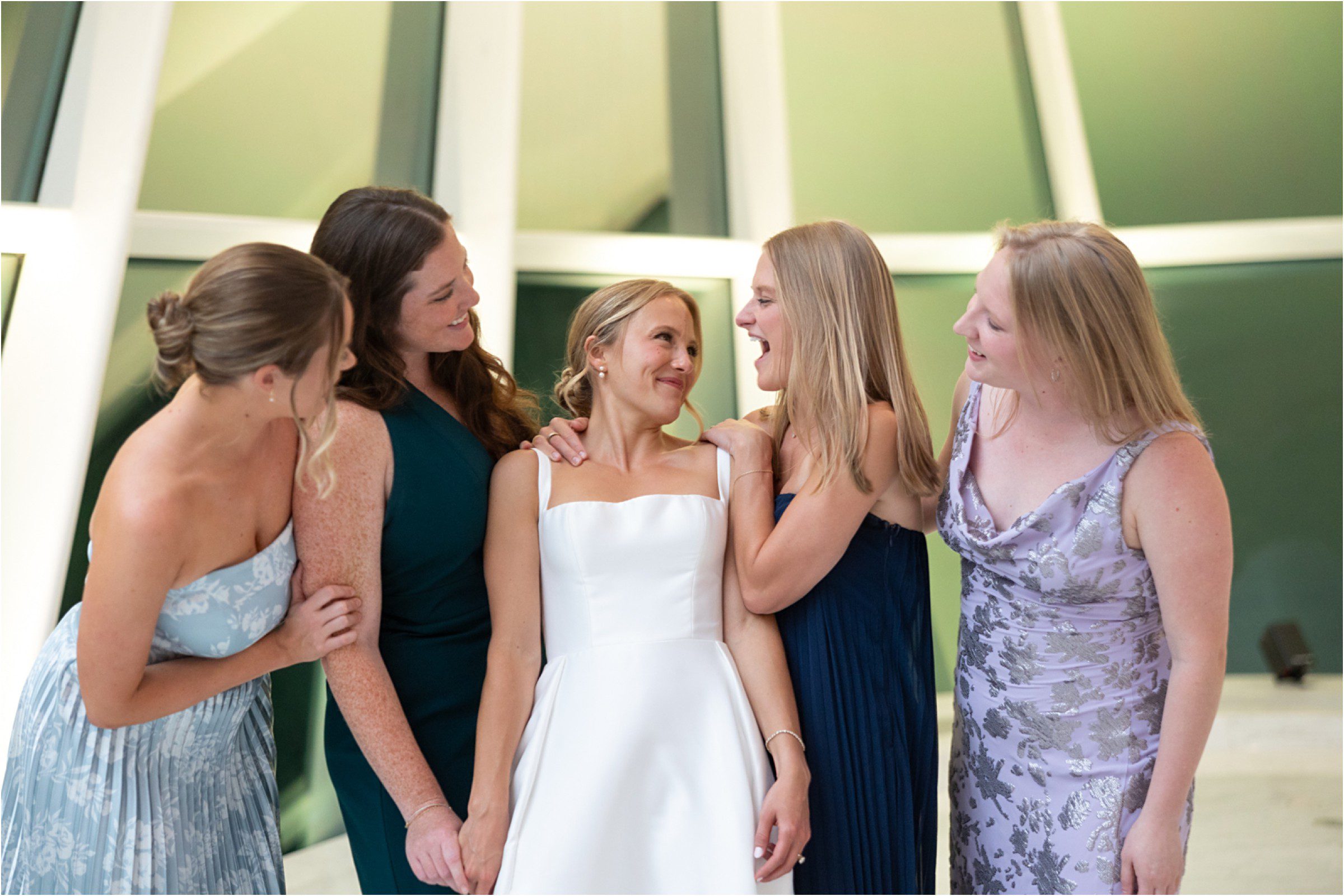 Brooke & Matt are joy incarnate. Their friends adore them, their parents practically beam when looking at them, and the two of them are hearts-on-the-sleeve-dance-like-no-one-is-watching kind of people. And man oh man, a wedding day filled with that kind of delight and love is exactly what a photographer needs to fill the proverbial tank and stay grounded in the moment on a wedding day. Theirs was an uncharacteristically stormy summer day but we made the most of our dry minutes and they got to see one another for the first time on the roof of Hotel Metro and take in Lake Michigan views with their wedding party. Even when the sun declined to shine outside they brought the summer air in with them via a design by Jane Kelly Floral that managed to make The Milwaukee Art Museum even more gorgeous. You’ll have to forgive how many detail shots there are in this post, but seriously, every delicious bluebell, sneak peek of Brooke’s sky high heels, and focus on the texture and pattern of the day just breathes life into my soul so let’s go with it. In the end our collective reward is one of the most beautiful stormy sunset sessions we’ve ever photographed and the happiest dancing grandpa you ever did see.